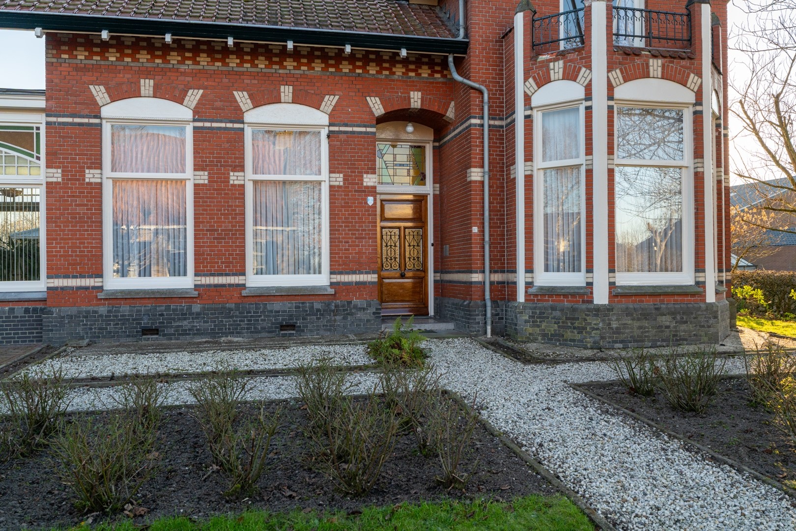 De woning is opgetrokken in rode verblendsteen en voorzien van samengestelde zadeldaken met geglazuurde dakpannen. De asymmetrische gevelindeling, siermetselwerk, speklagen en markante erker met balkon geven het geheel een statige uitstraling. De serre vormt een prachtige overgang tussen binnen en buiten en zorgt voor extra licht en leefruimte.