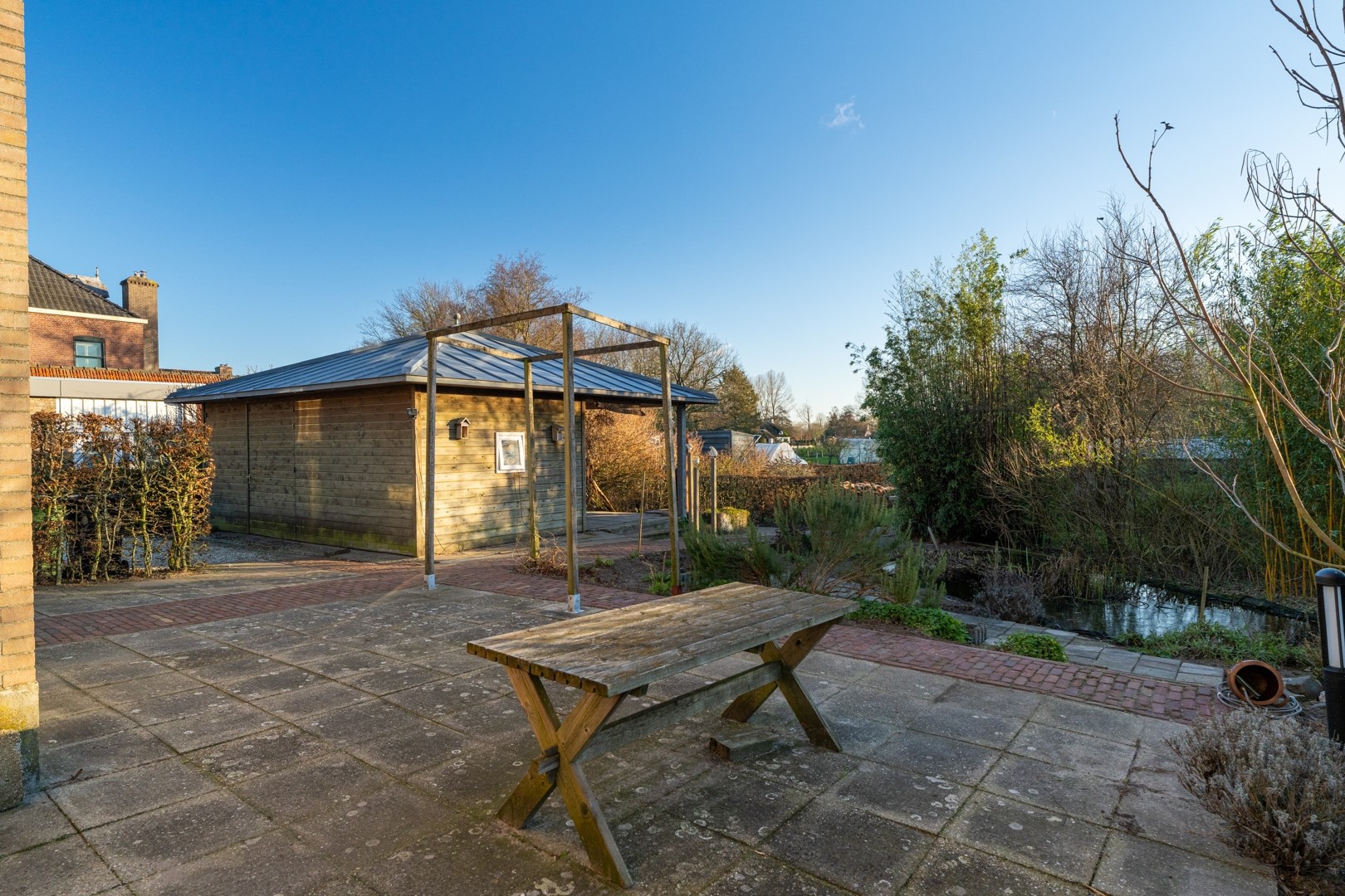 De woning is gelegen op een groot perceel met een tuin rondom, gunstig gesitueerd op het zuiden en voorzien van een achterom. Aan de voorzijde siertuin met gazon, diverse beplating en een origineel hekwerk uit de bouwtijd. Middels de ruime oprit is de vrijstaande houten garage (v.v. elektra) is bereikbaar. Verder is de achtertuin gevarieerd ingedeeld met aan de garage de overkapping, leuke tuinkas, gazon, verschillende terrassen en diverse vaste beplanting.