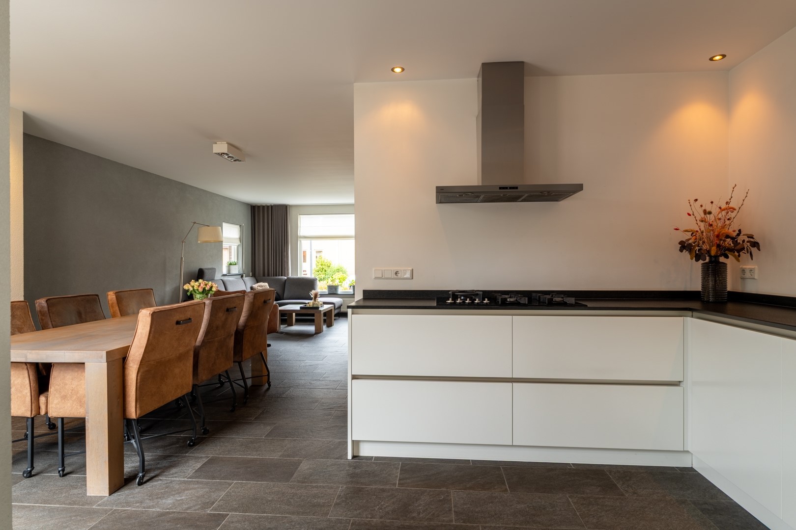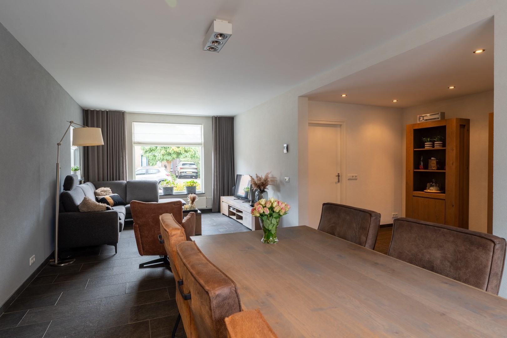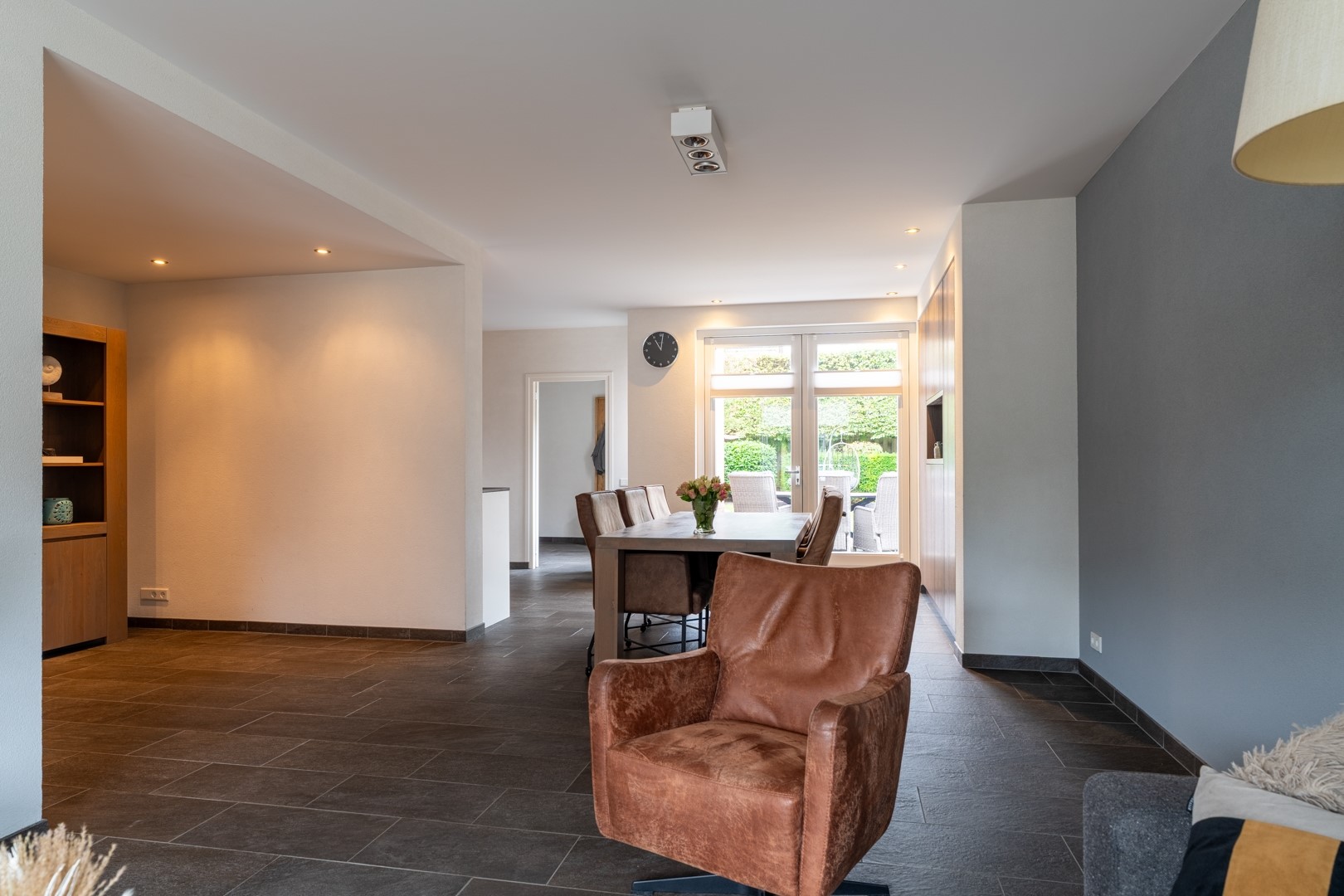 • Ruime en gezellige L-vormige living met tuindeuren naar terras en tuin;