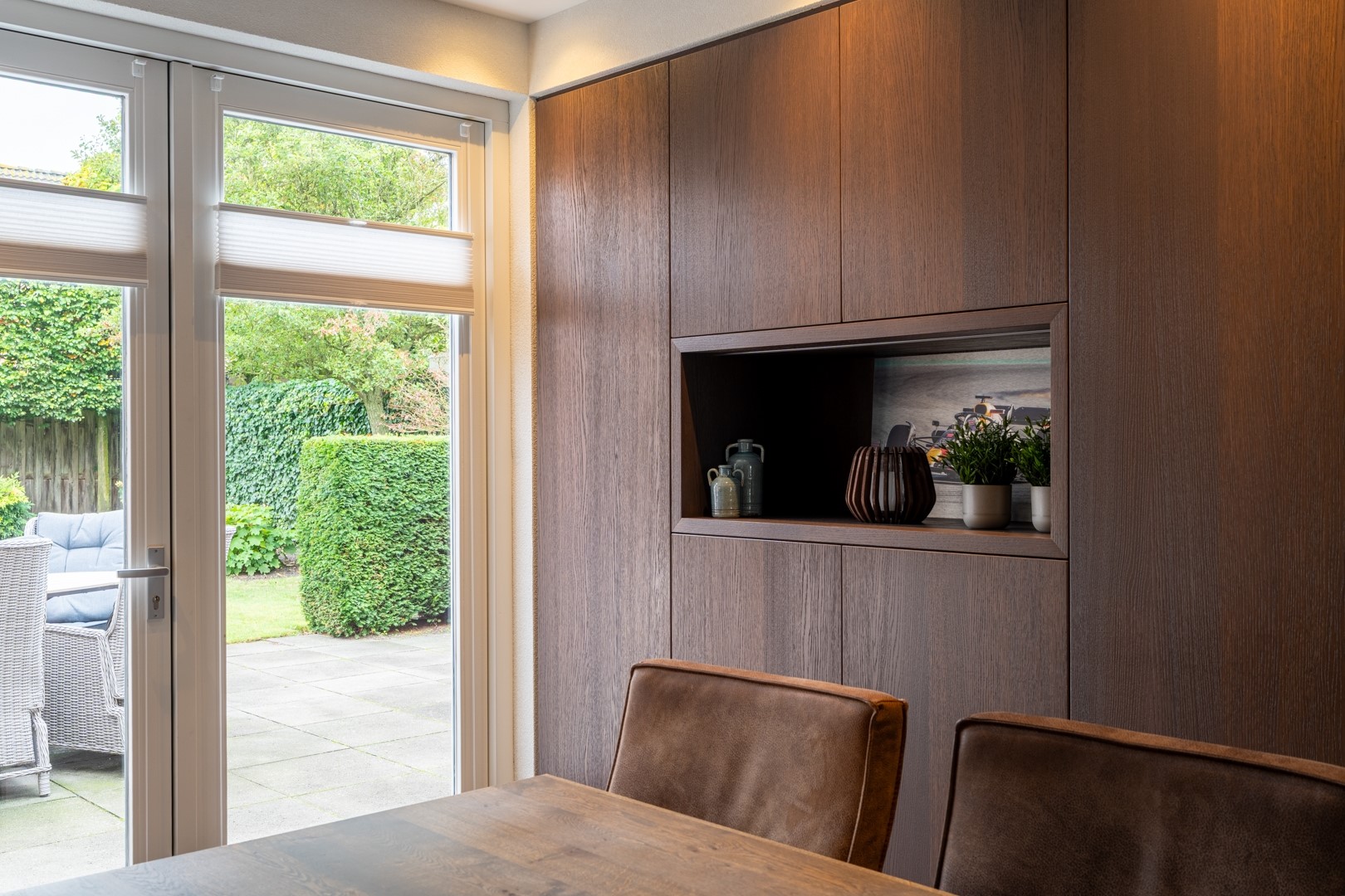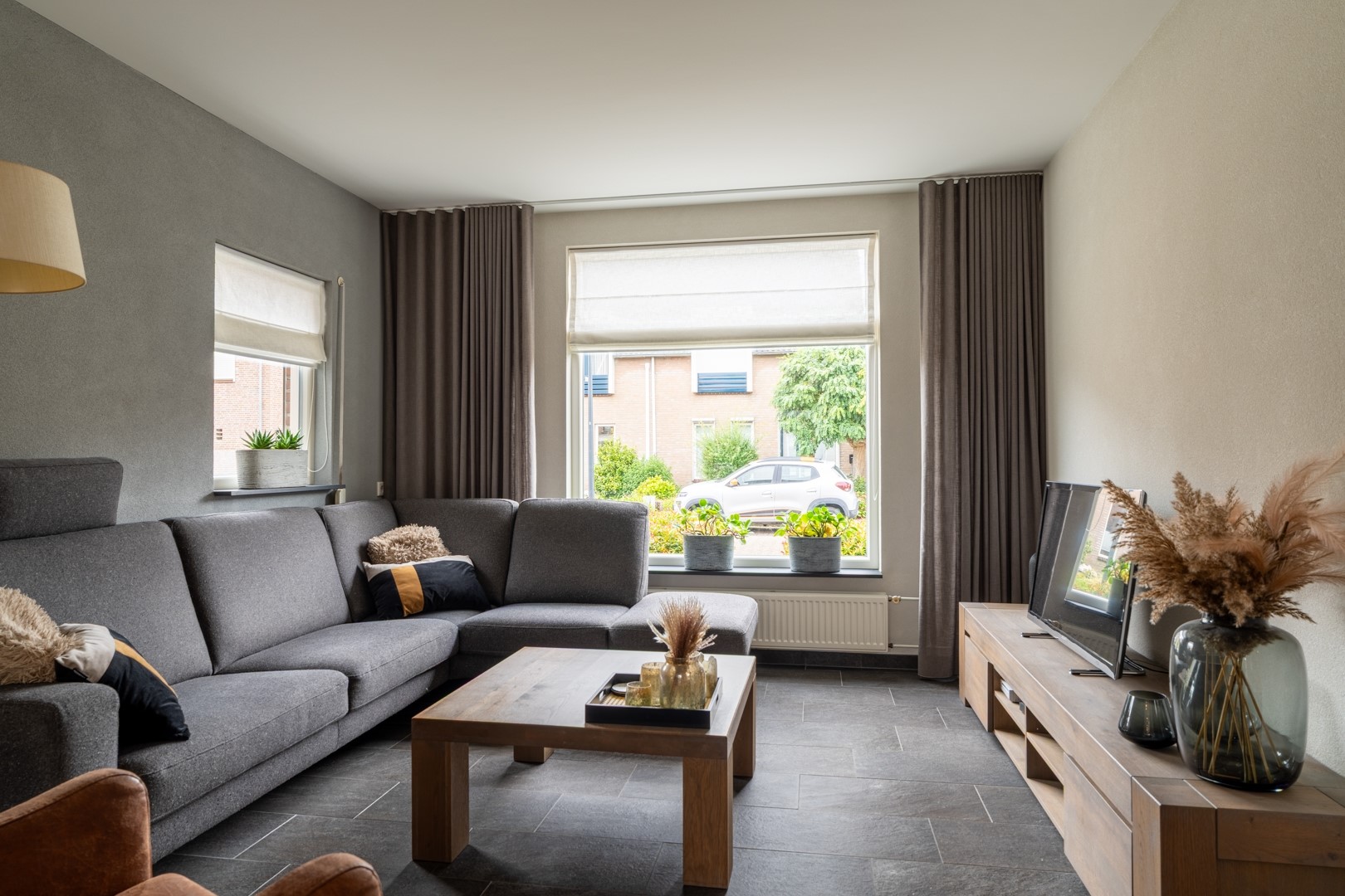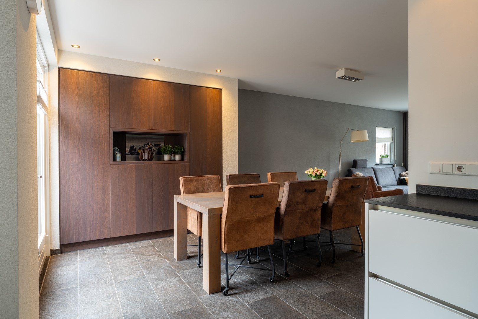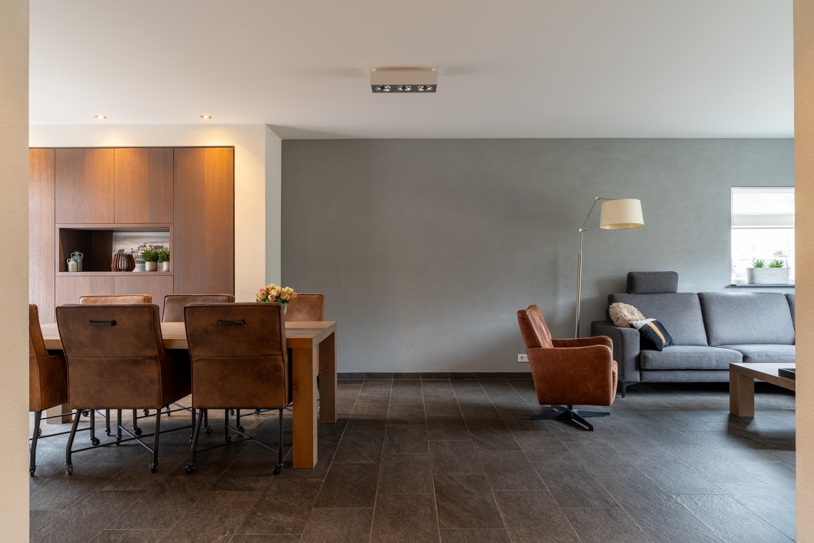 • Ruime en gezellige L-vormige living met tuindeuren naar terras en tuin;