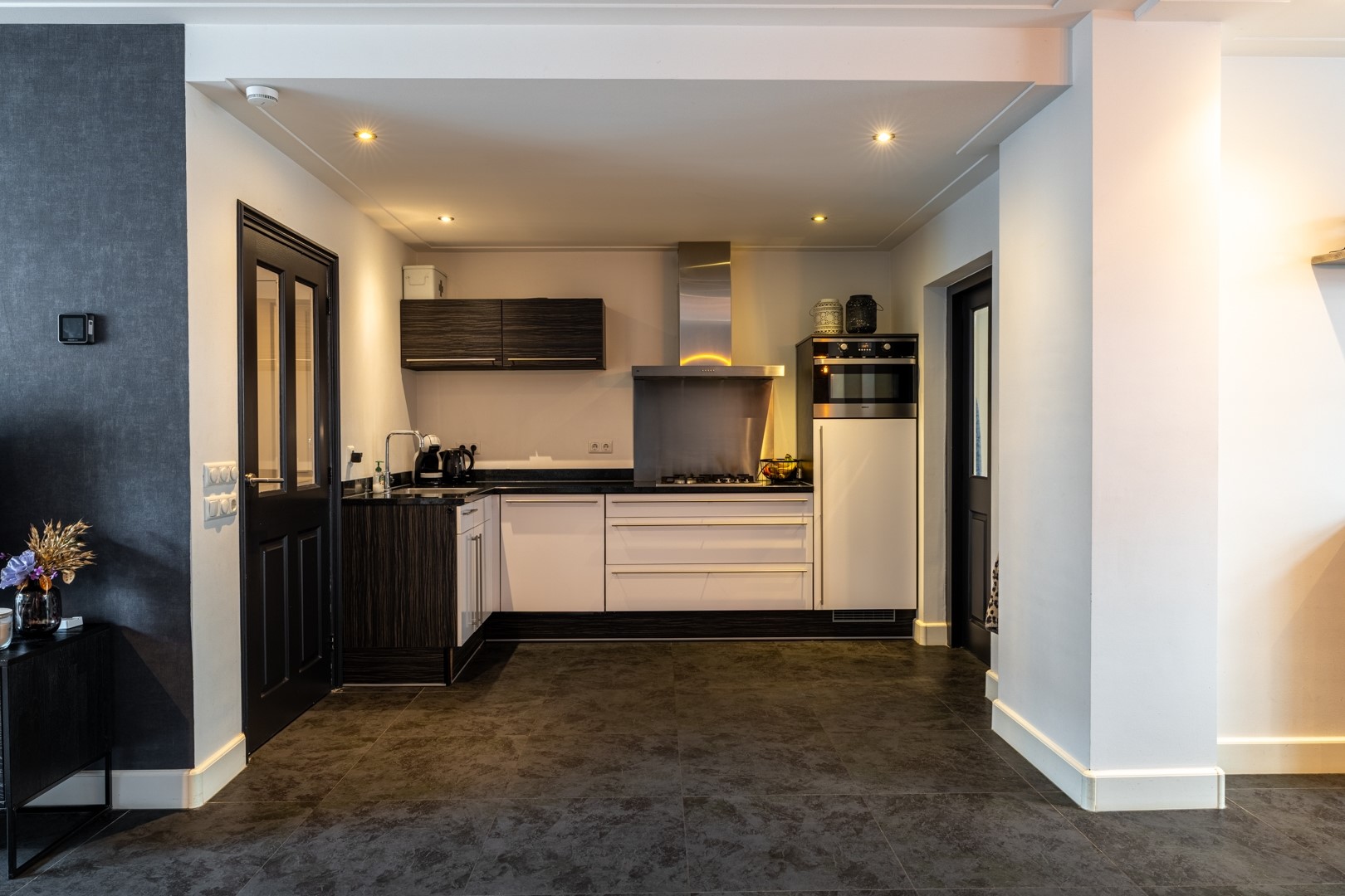 De open keuken is uitgevoerd in een praktische hoekopstelling en voorzien van diverse inbouwapparatuur, waaronder een gasfornuis, afzuigkap, combi-oven/magnetron, koelkast en vaatwasser. Aansluitend bevindt zich de bijkeuken met inbouwkast en aansluitingen voor wasmachine en droger, netjes uit het zicht én met loopdeur naar tuin en terras.