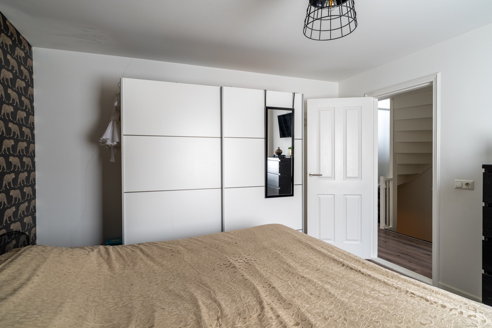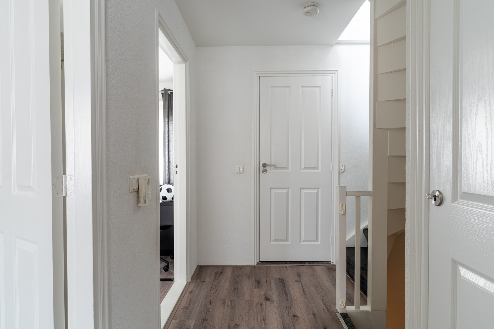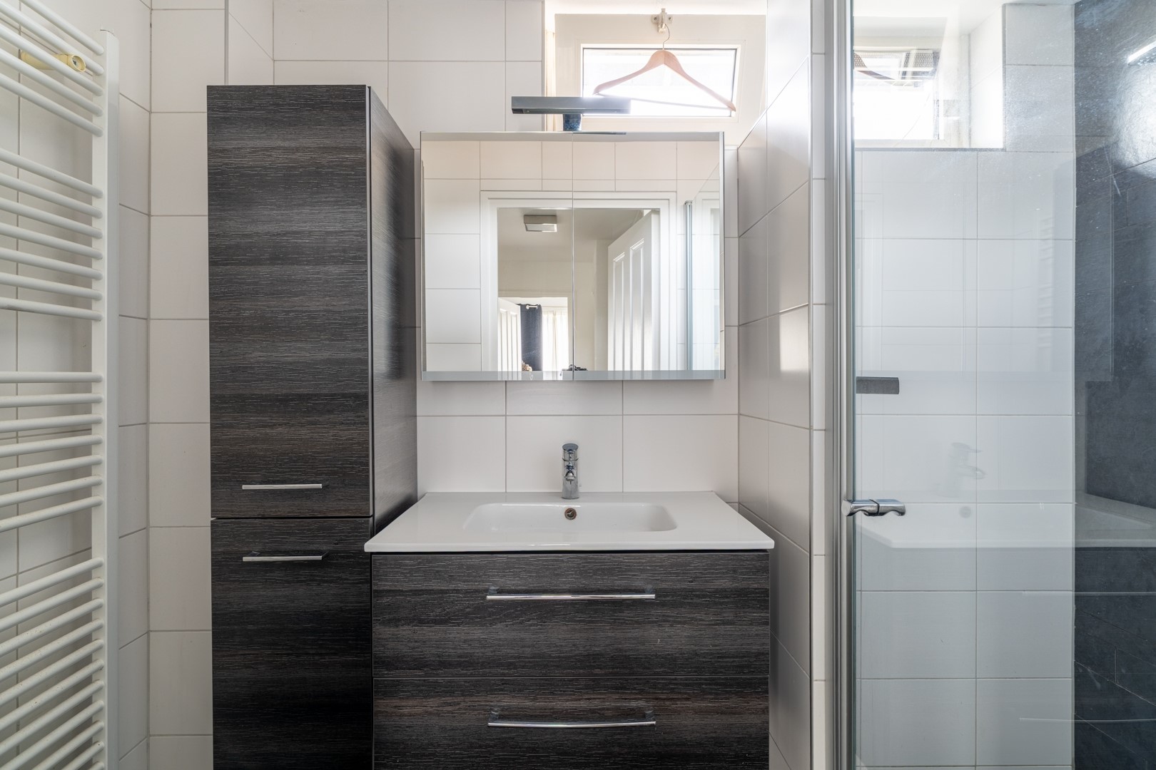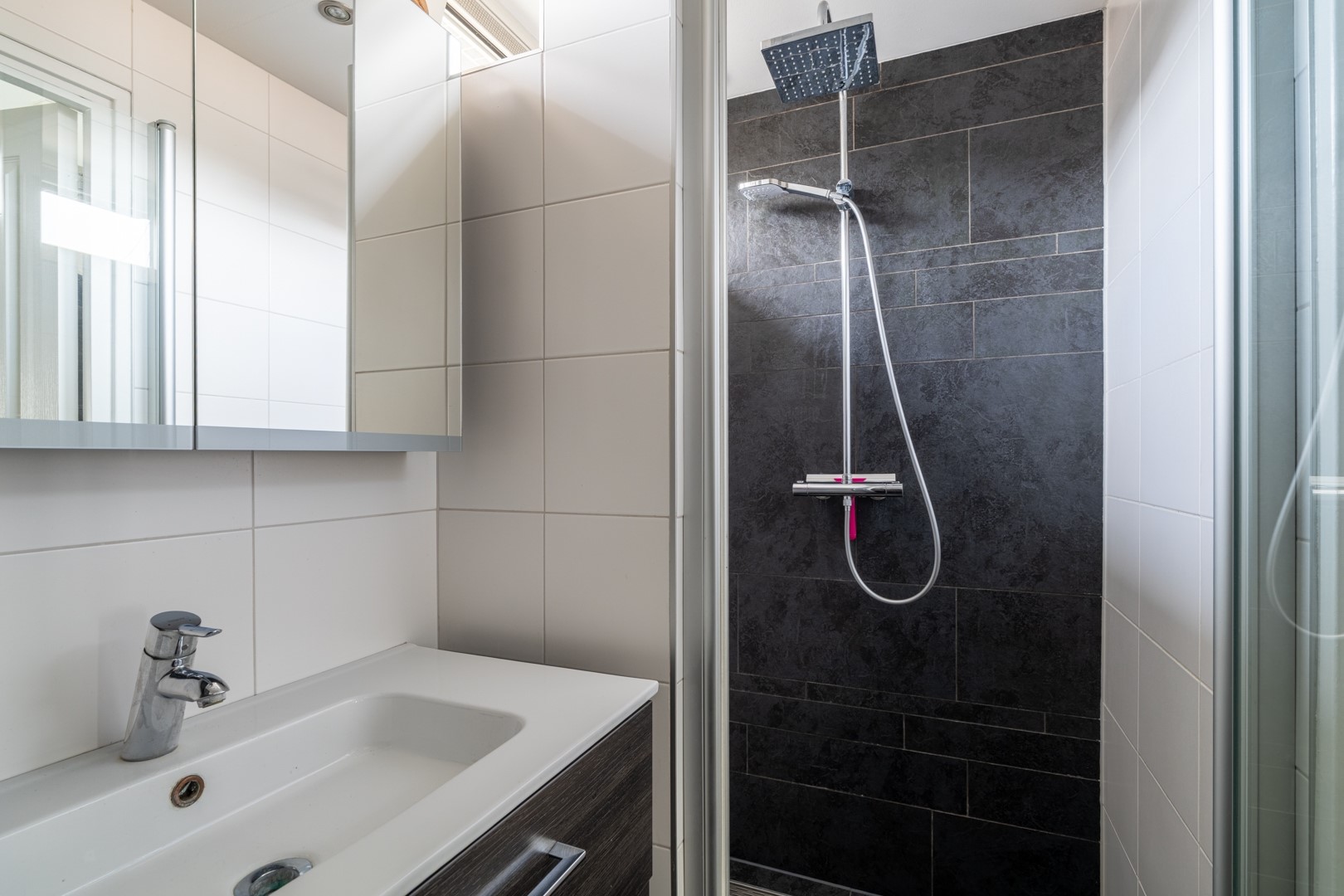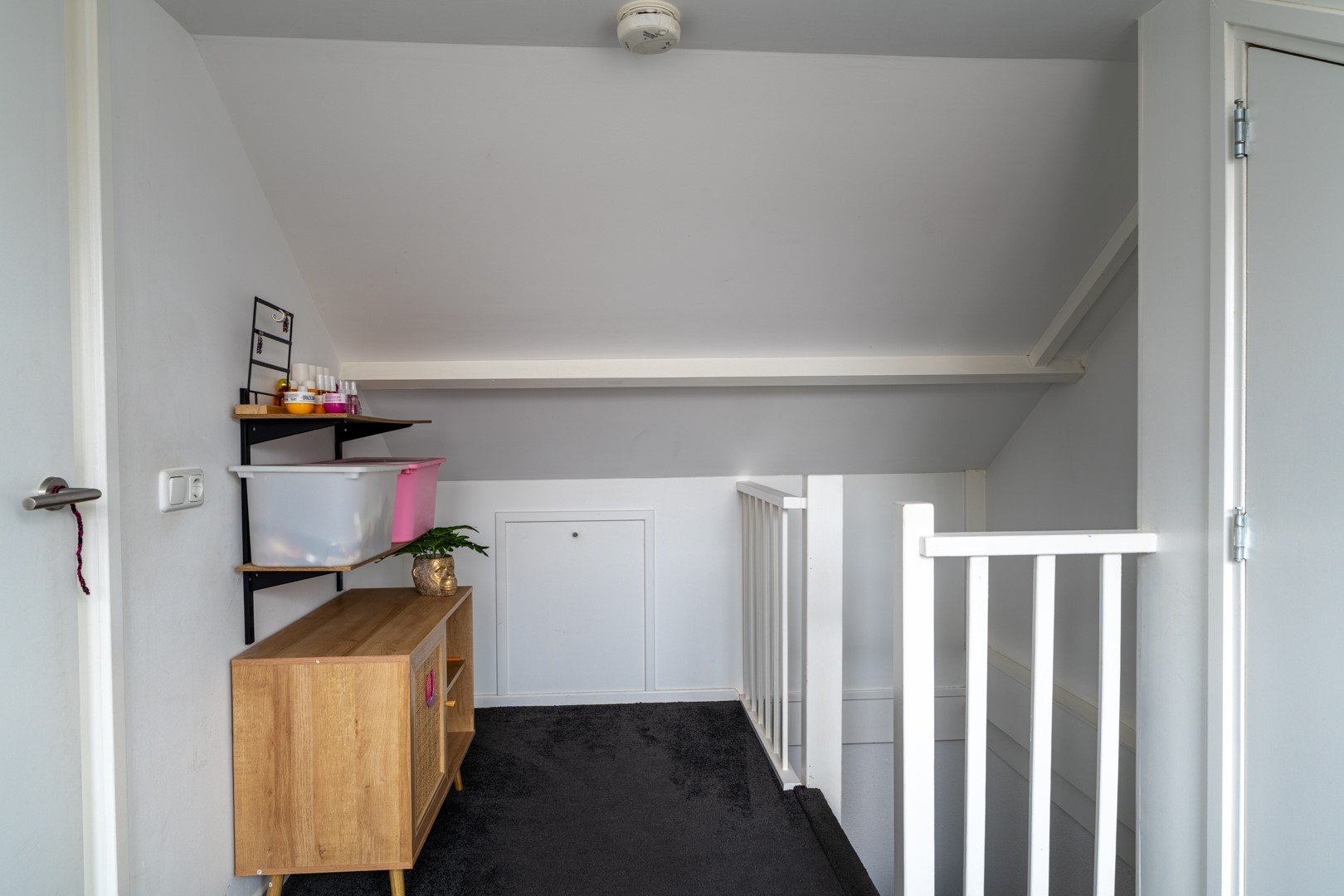 Overloop met vaste kast en vaste trap naar de tweede verdieping. 3 slaapkamers, waarvan één met inbouwkast. De badkamer is modern uitgevoerd en voorzien van een inloopdouche, wastafelmeubel en designradiator.