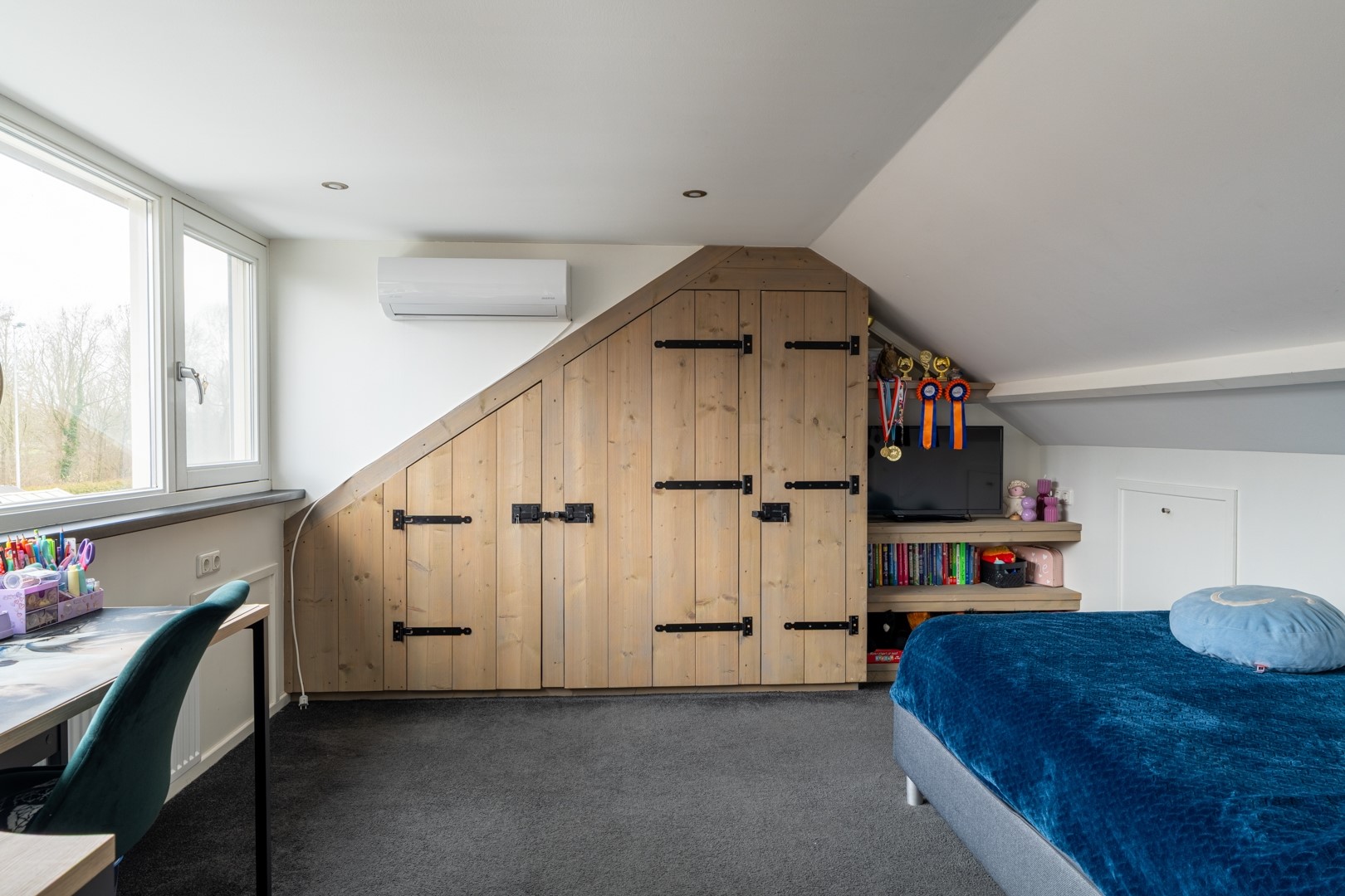 Overloop met HR-combiketel (Vaillant, 1999) en extra bergruimte onder de knieschotten. Royale vierde slaapkamer met dakkapel, inbouwkast en airconditioning.