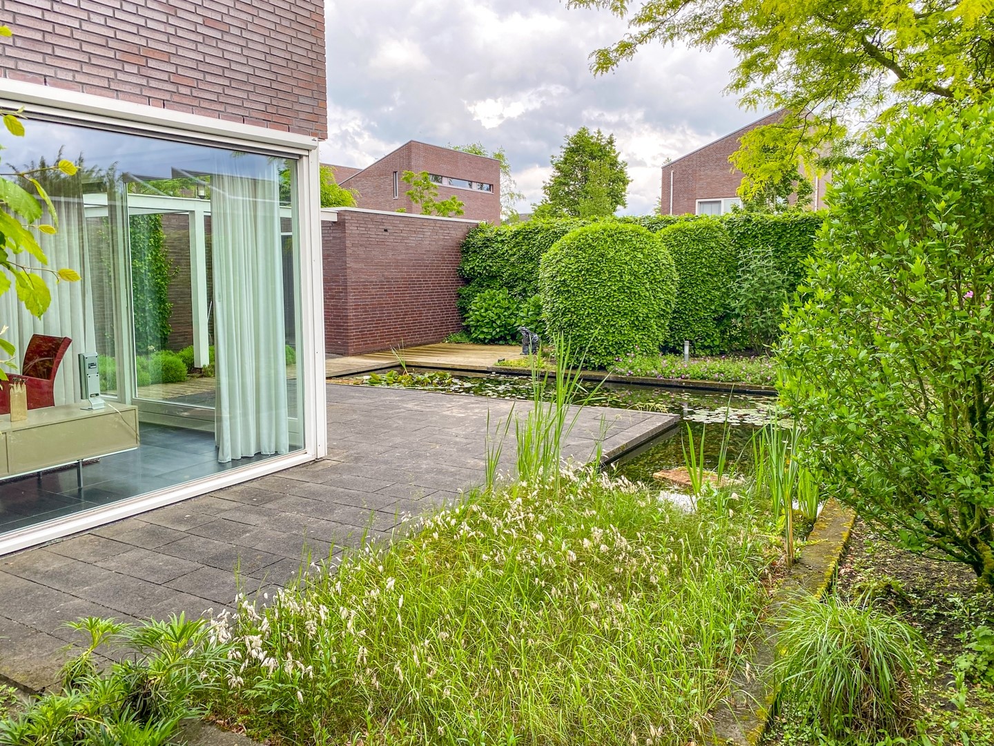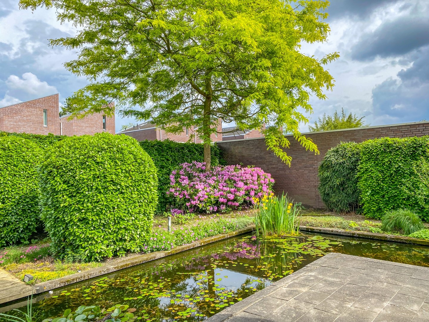 De omsloten achtertuin vormt een absolute meerwaarde van deze woning. De tuin is gesitueerd op het zuidoosten en is met zorg en aandacht aangelegd. De combinatie van sierbestrating, moderne vijver, grindpad, meerdere terrassen en diverse plantenborders zorgt voor een verzorgd en gevarieerd geheel. De blikvanger is de prachtige vijver, die de tuin een sfeervolle en rustgevende uitstraling geeft. Hier kunt u in alle privacy genieten van het buitenleven. Dankzij de verschillende terrassen is er altijd een fijne plek in de zon of schaduw te vinden. Daarnaast is er een robuuste stenen berging aanwezig van circa 4,6 x 3,3 meter.