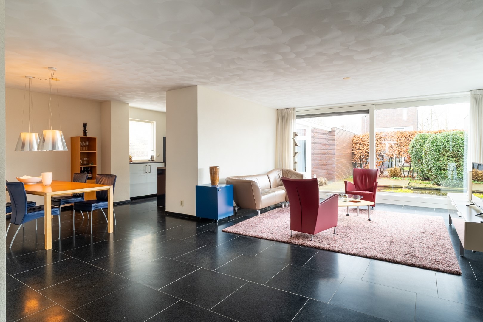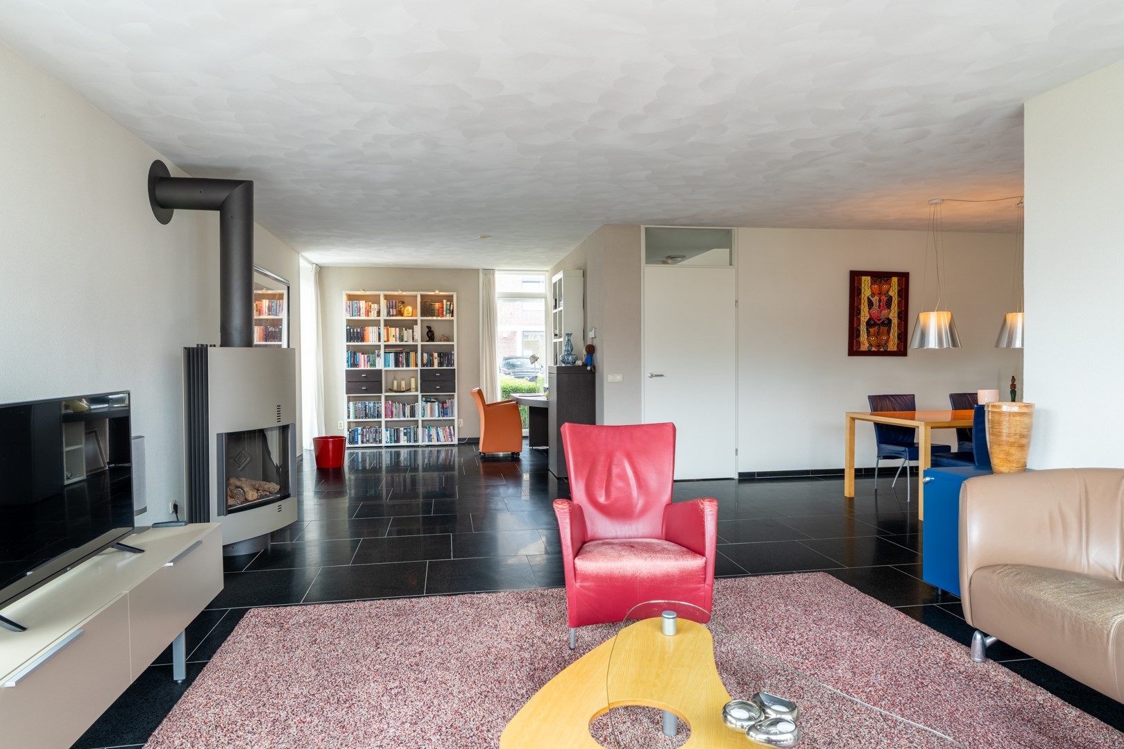 De woonkamer is ruim en licht door de grote raampartijen en beschikt over een sfeervolle gashaard. Middels een schuifpui is er direct contact met de achtertuin, waardoor binnen en buiten op natuurlijke wijze in elkaar overlopen.