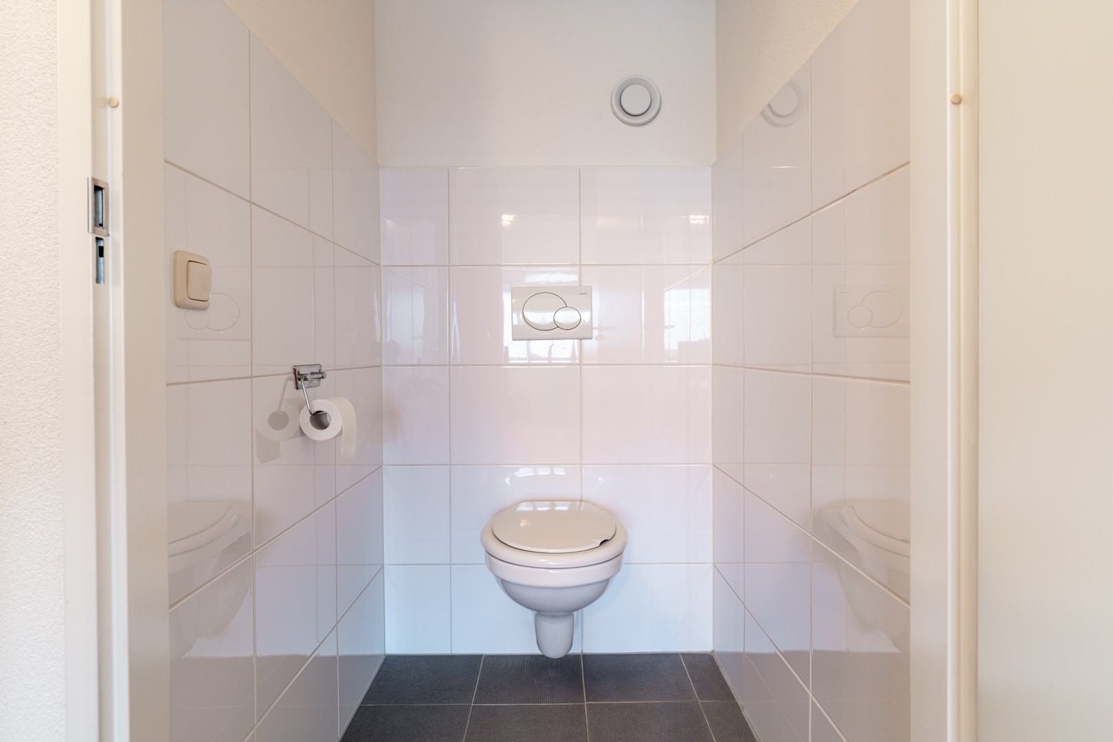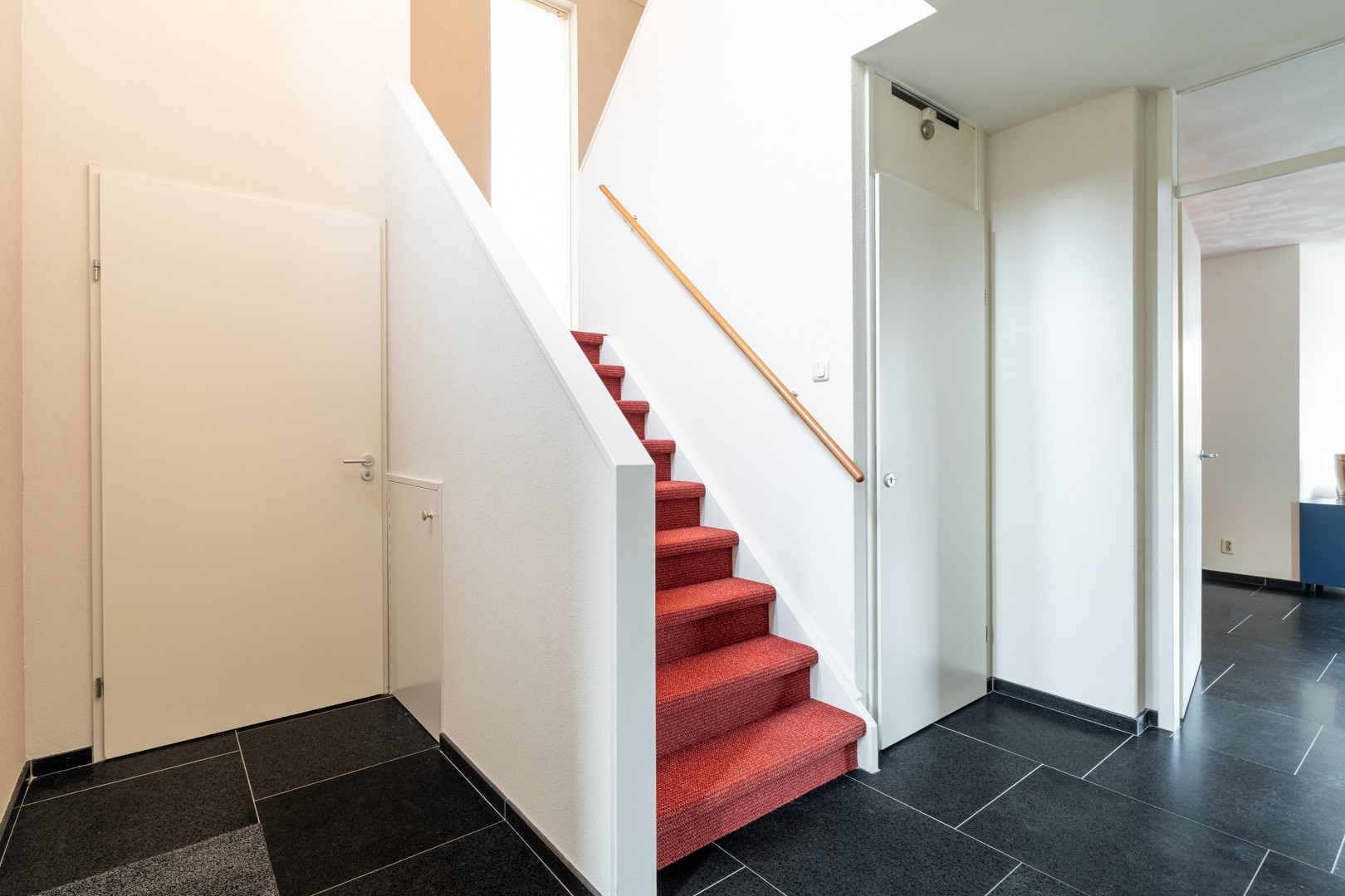 Overdekte entree, ruime hal met vide en trapopgang met praktische bergruimte, meterkast, modern toilet met fontein en toegang tot de inpandige garage.