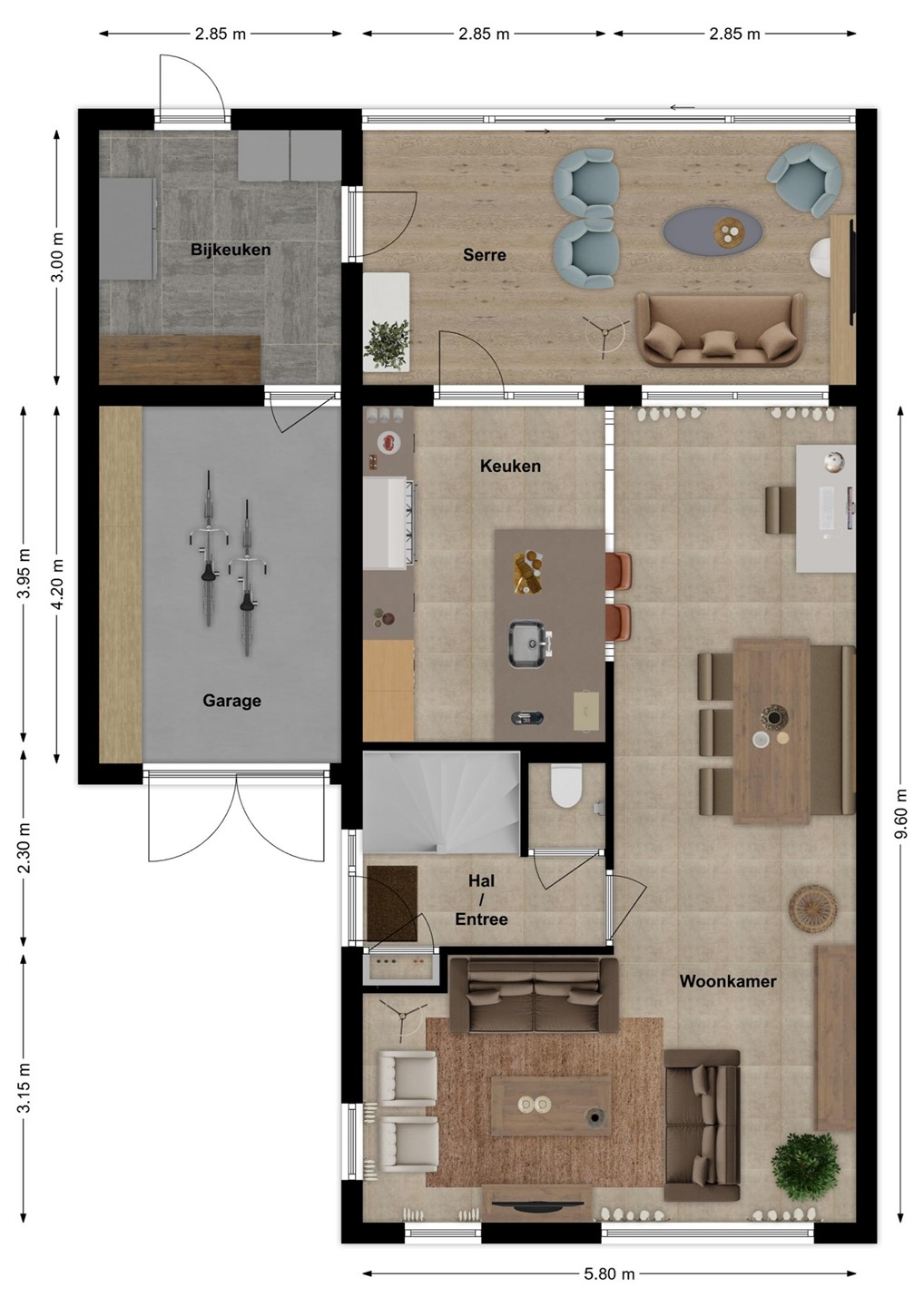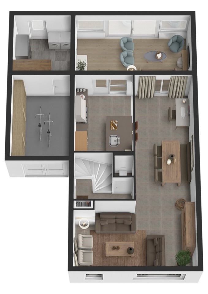 Je komt binnen via de zijentree in een ruime hal met trapopgang, toilet en toegang tot de woonkamer. De woonkamer ligt aan de voorzijde en kijkt uit op gemeentelijk groen — lekker vrij! Achterin zit de gezellige tuinkamer, bereikbaar via de keuken. Dankzij de schuifpui loop je zó de tuin in. Binnen én buiten zijn hier mooi met elkaar verbonden.