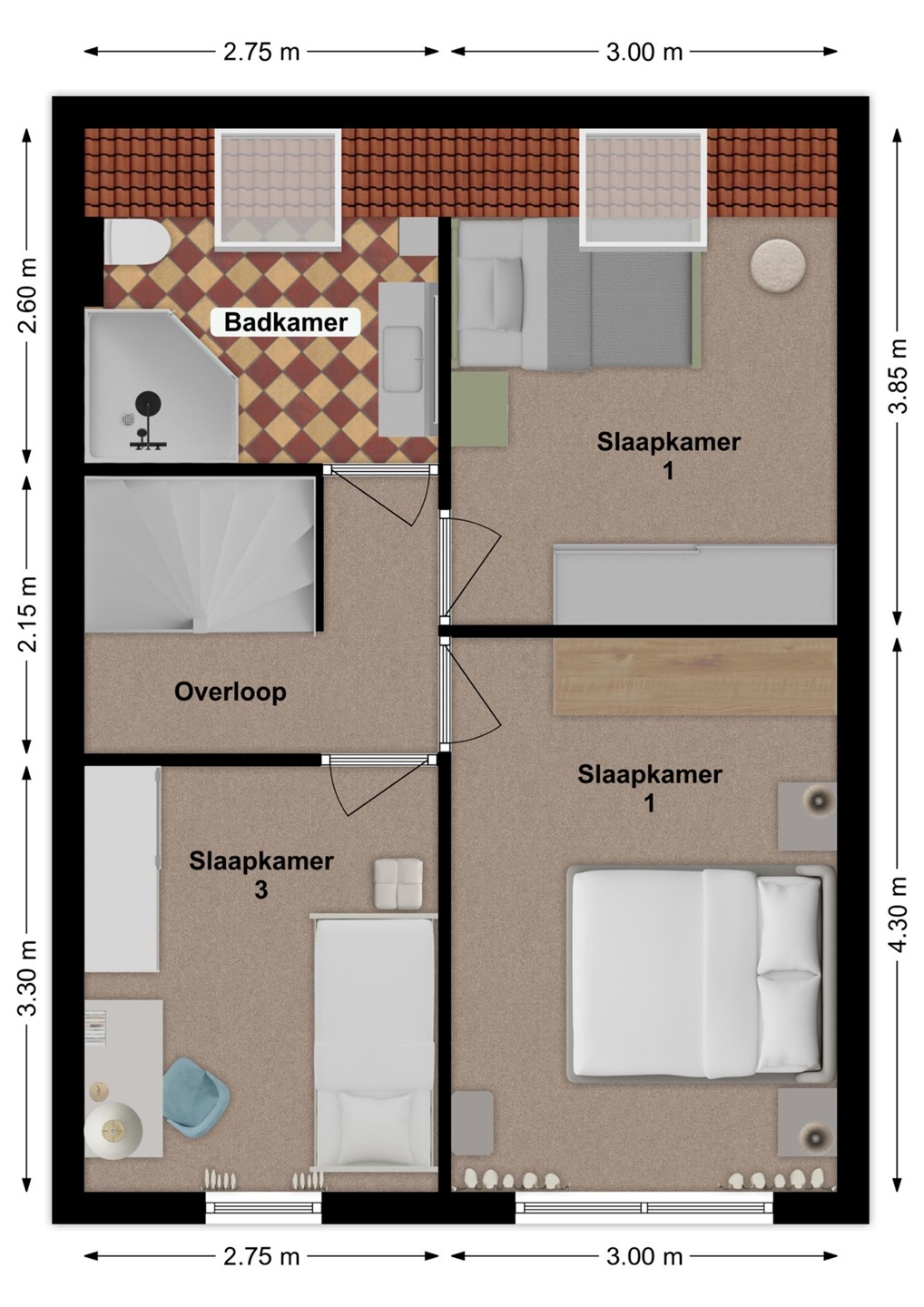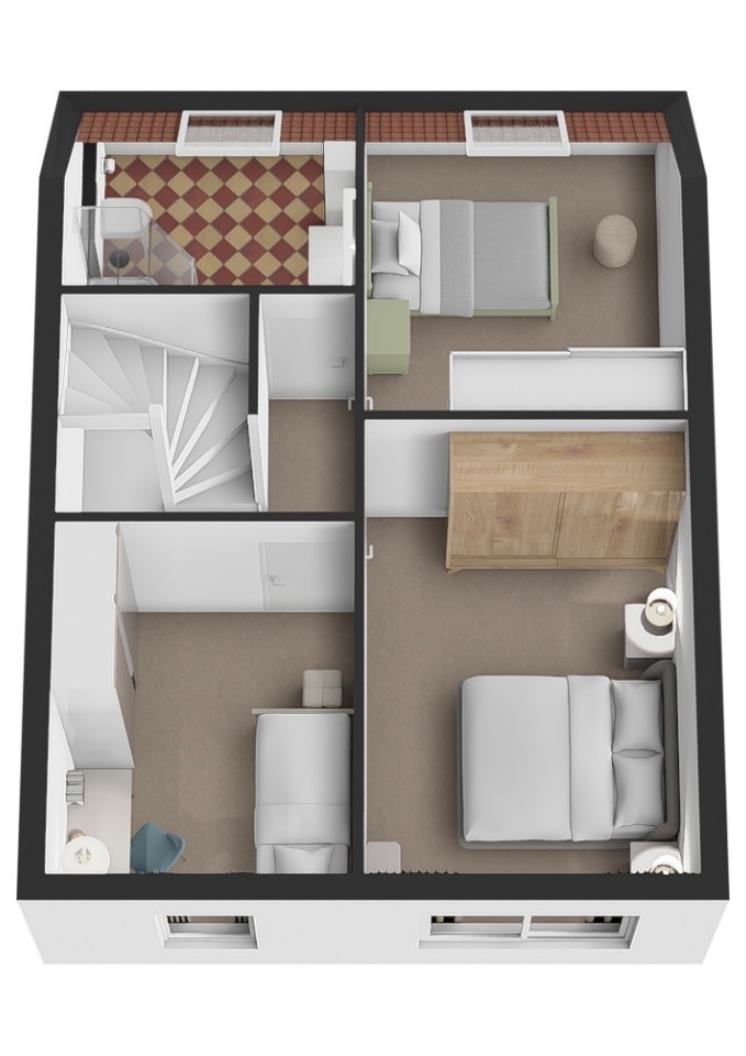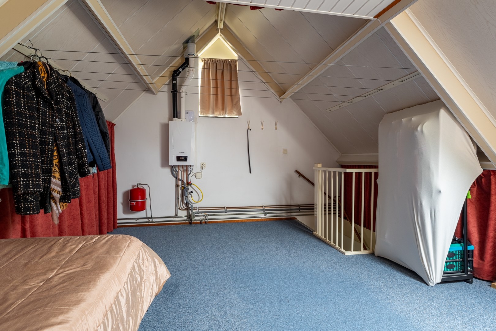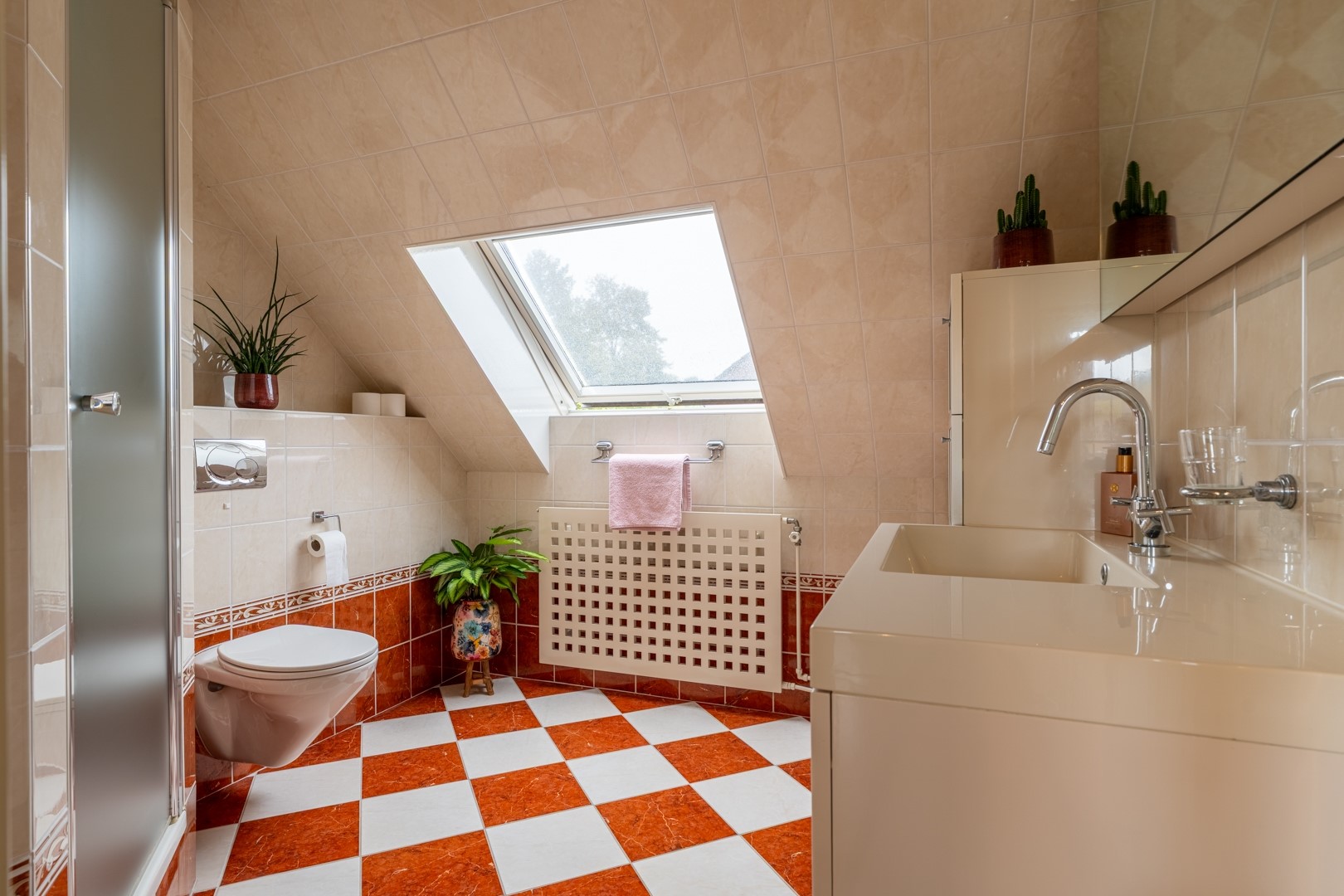 Boven zijn drie keurige slaapkamers, allemaal voorzien van rolluiken. De badkamer is compleet met een ruime inloopdouche, zwevend toilet, wastafelmeubel met kastruimte en designradiator. Alles strak en netjes. Via de vaste trap kom je op de zolderverdieping — een grote open ruimte waar je makkelijk een vierde slaapkamer of werkruimte van maakt.