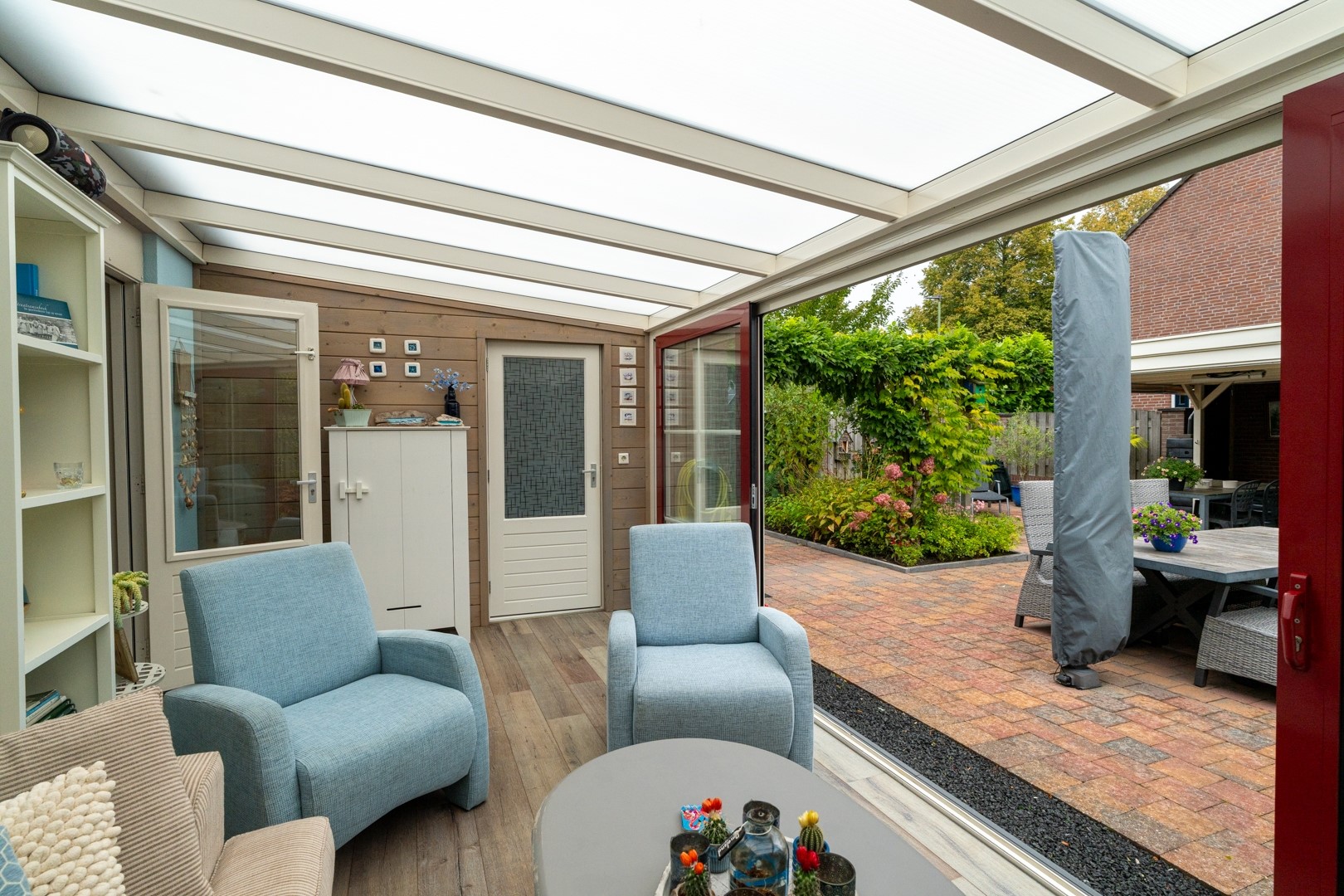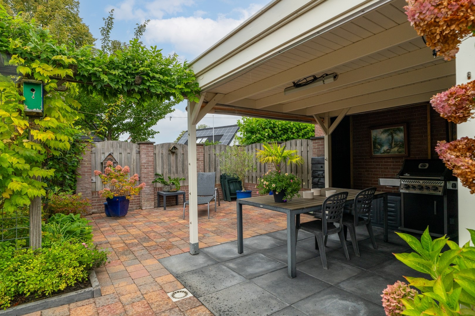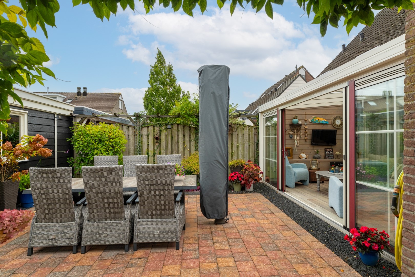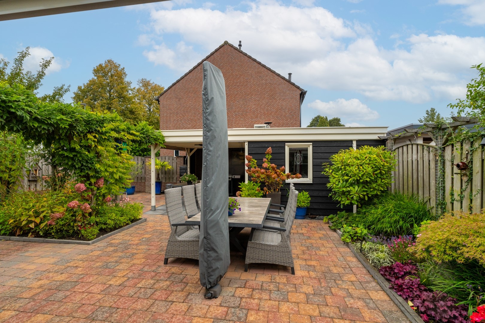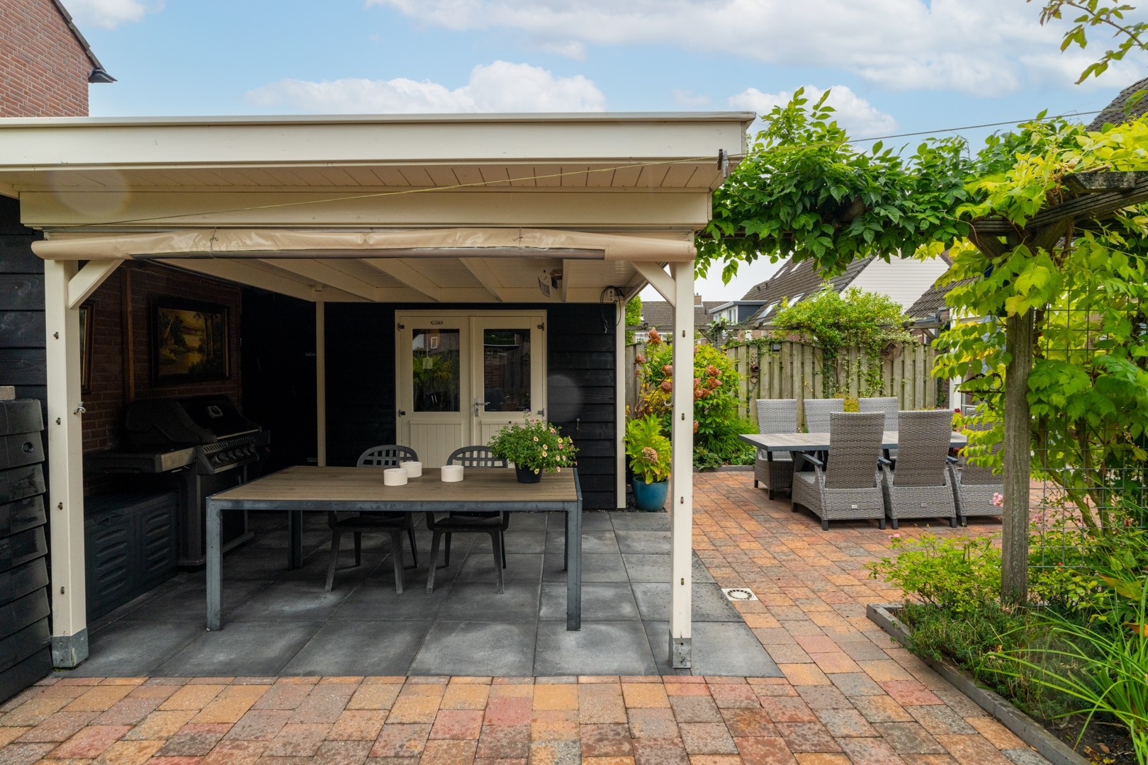 De achtertuin is omsloten en biedt volop privacy. Meerdere zonneterrassen zorgen ervoor dat je op elk moment van de dag een fijne plek vindt. En zoals gezegd: dat bijgebouw met overkapping maakt het buitenleven hier helemaal af. Parkeren kan gewoon op eigen terrein én in het hofje.