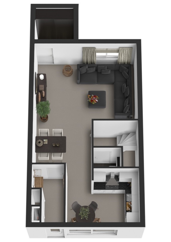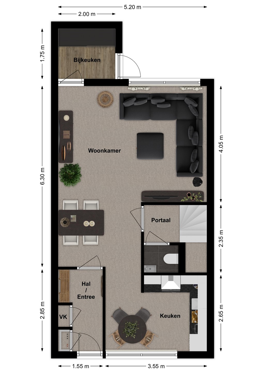 Je komt binnen via de voordeur in de hal. Vanuit hier loop je door naar de woonkamer, waar je meteen de ruimte en het licht ervaart. Via een tussenportaal vind je de trap naar boven én een modern, fris toilet.