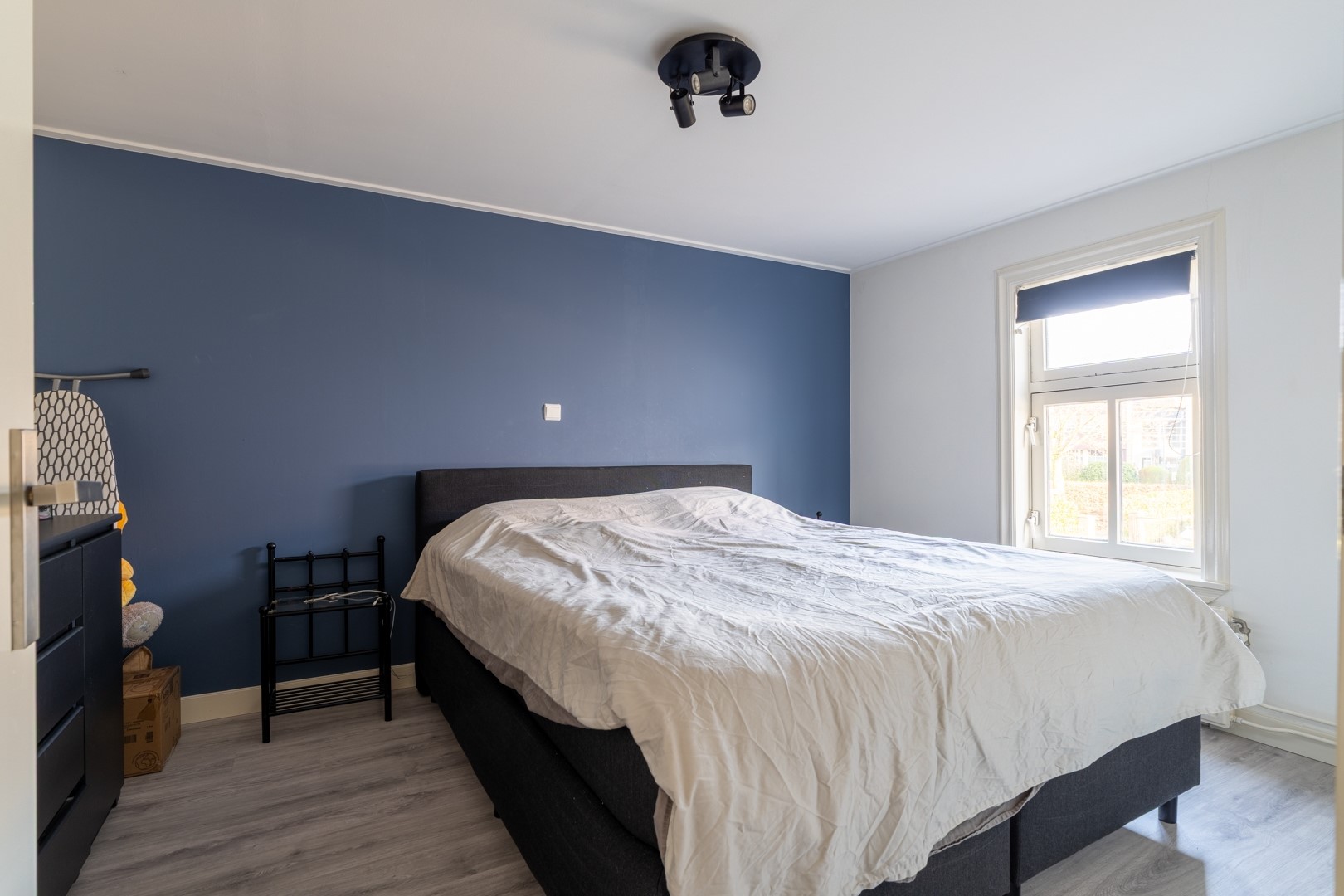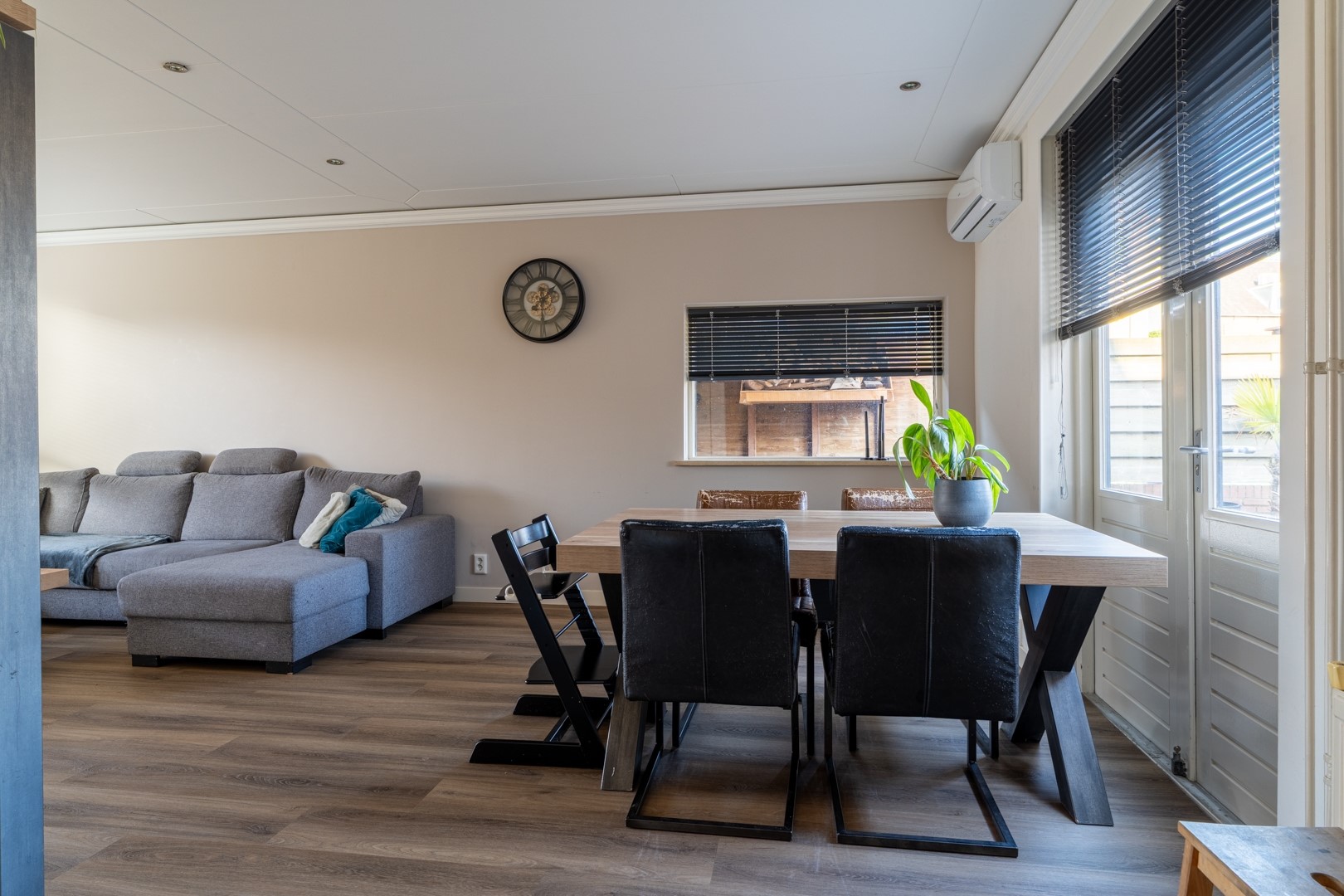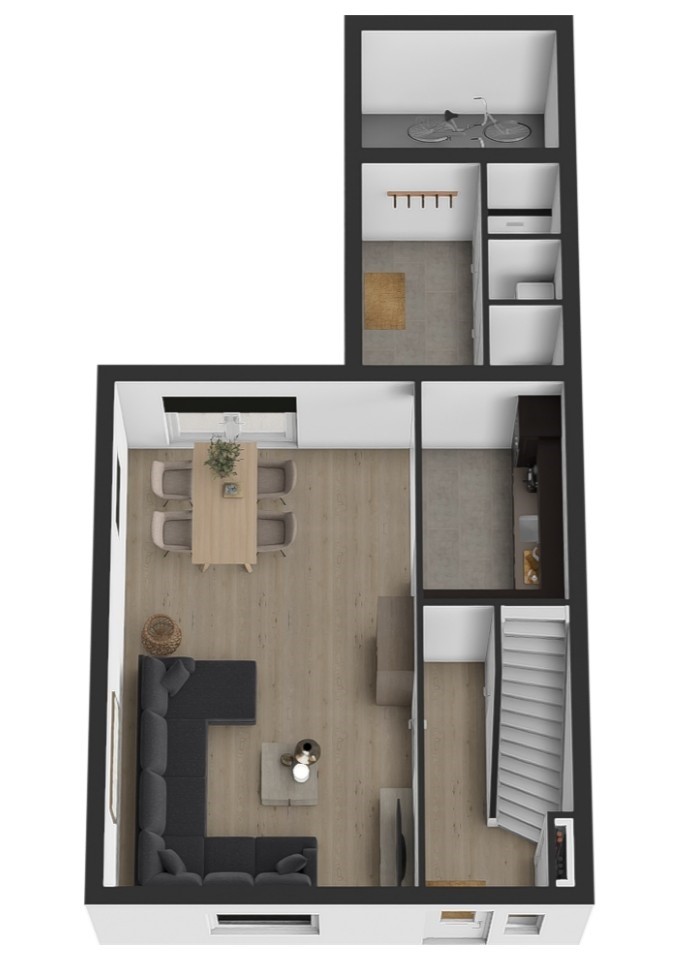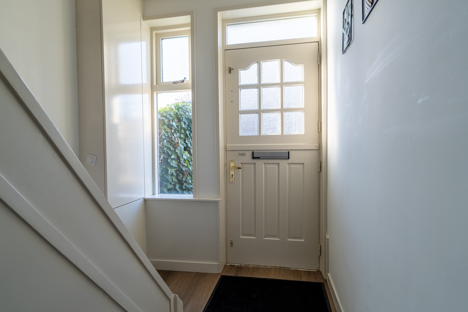 De entree ligt aan de voorkant van de woning. Via de vaste trap — met veel handige bergruimte eronder — kom je op de verdieping. De woonkamer is royaal en heeft veel licht door de verschillende ramen. Aan de voorzijde kijk je gezellig uit over je tuin en het straatleven.