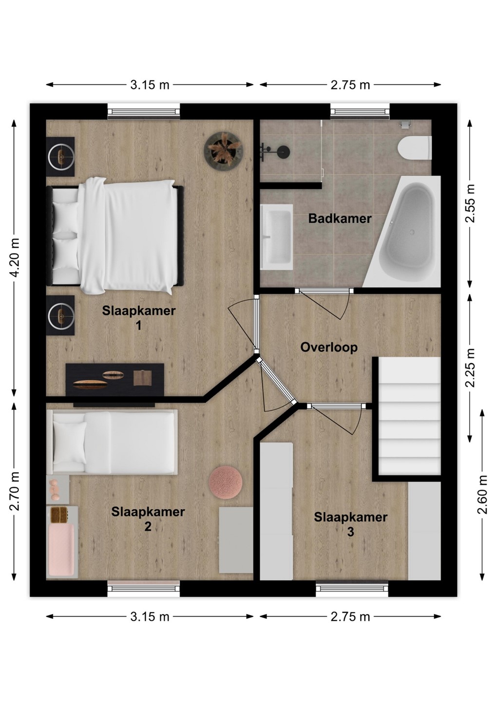 Slapen doe je boven! Hier vind je drie ruime slaapkamers, waarvan er één nu dienstdoet als walk-in-closet (droom!). De badkamer is compleet met inloopdouche, wastafelmeubel, zwevend toilet en een heerlijk hoekligbad voor de relaxmomenten.