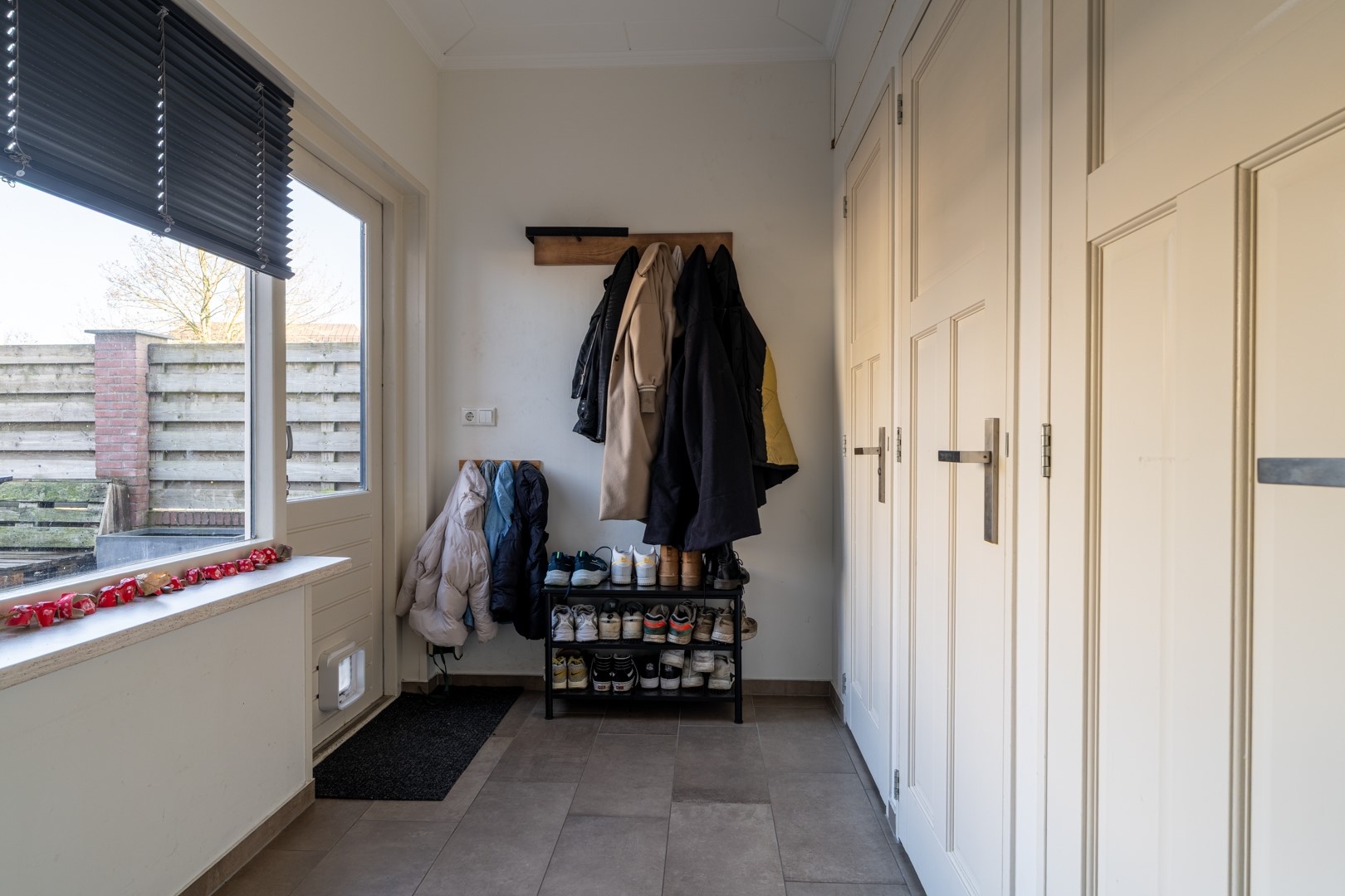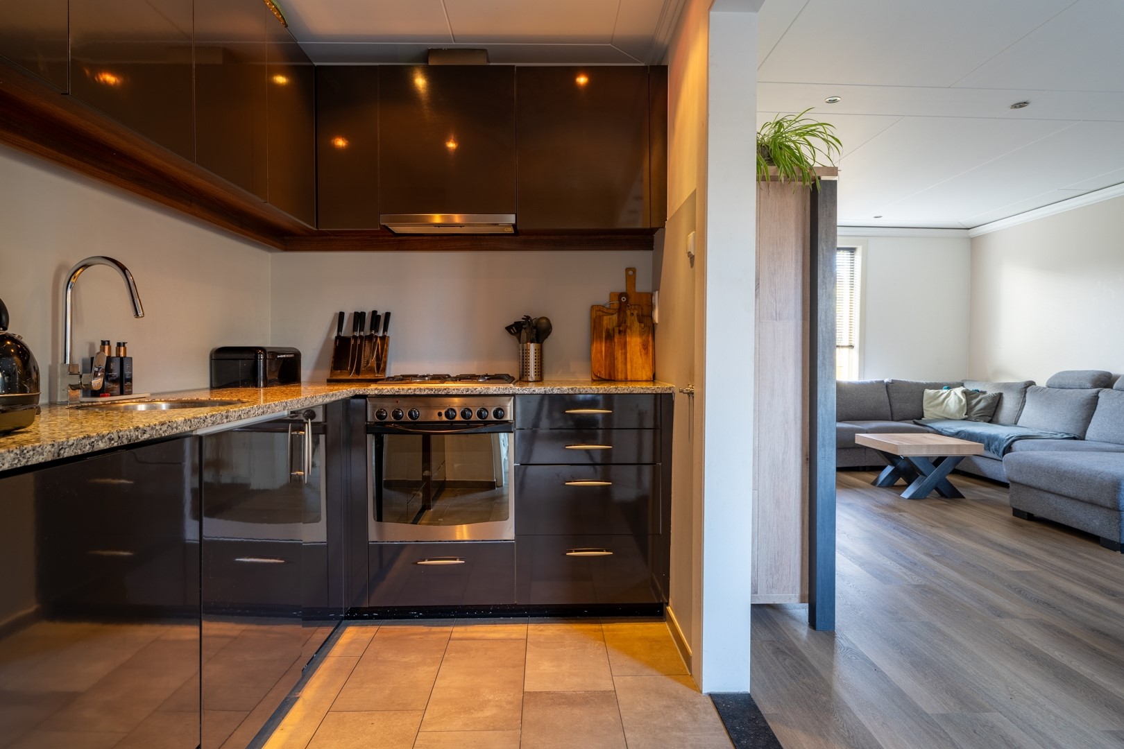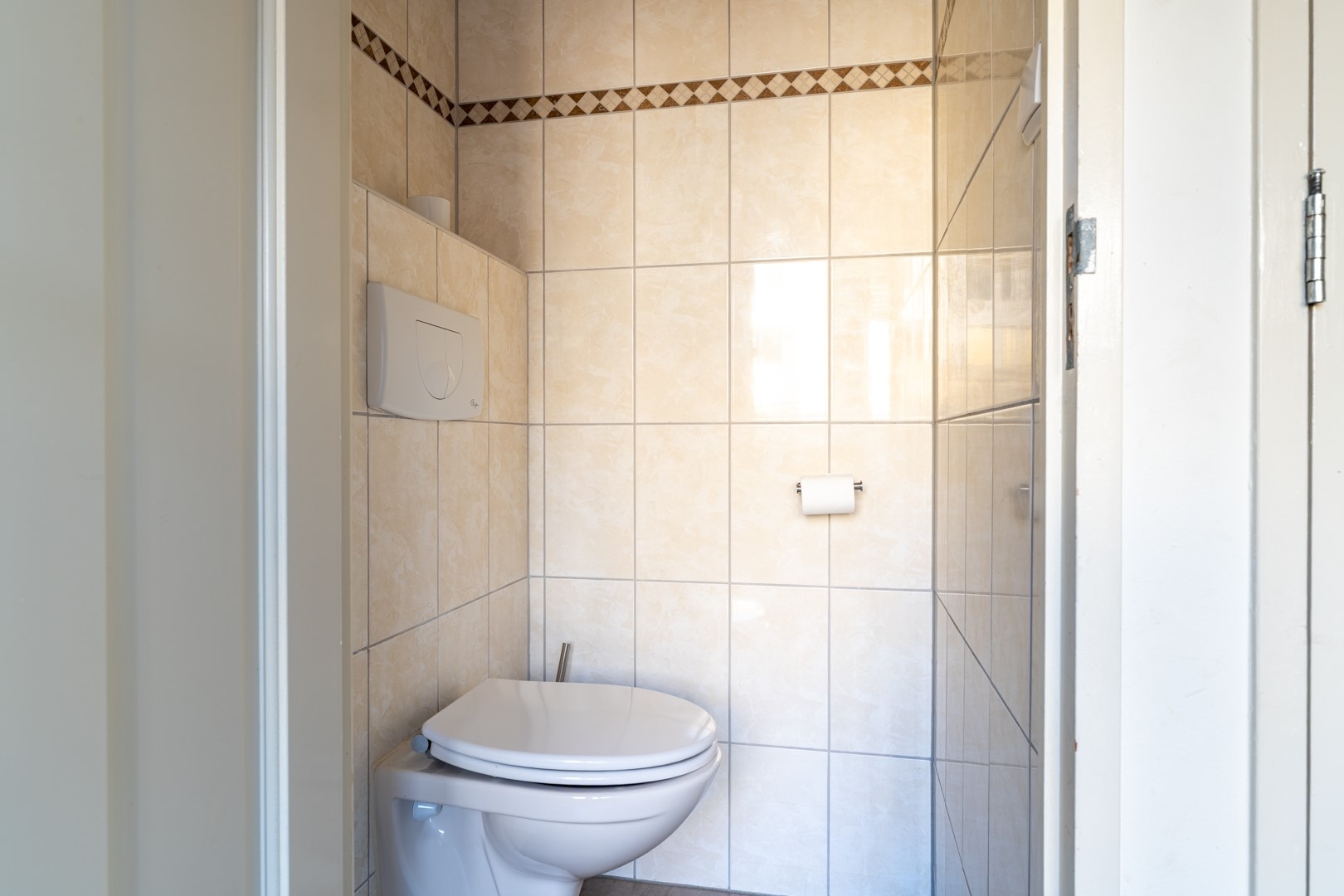 De keuken is knus, praktisch én gezellig, ingericht in een hoekopstelling. Je kookt hier op een 4-pits gaskookplaat en verder is de keuken uitgerust met een afzuigkap, magnetron, koelkast, oven en vaatwasser. Vanuit de keuken loop je de uitbouw in: een handige ruimte met toegang tot de waskast, het toilet en de cv-ruimte. Via een deur sta je zo in de achtertuin.