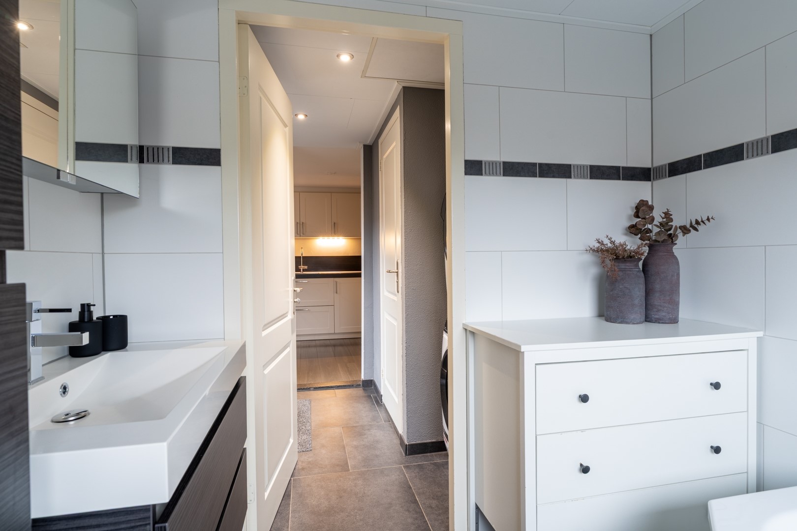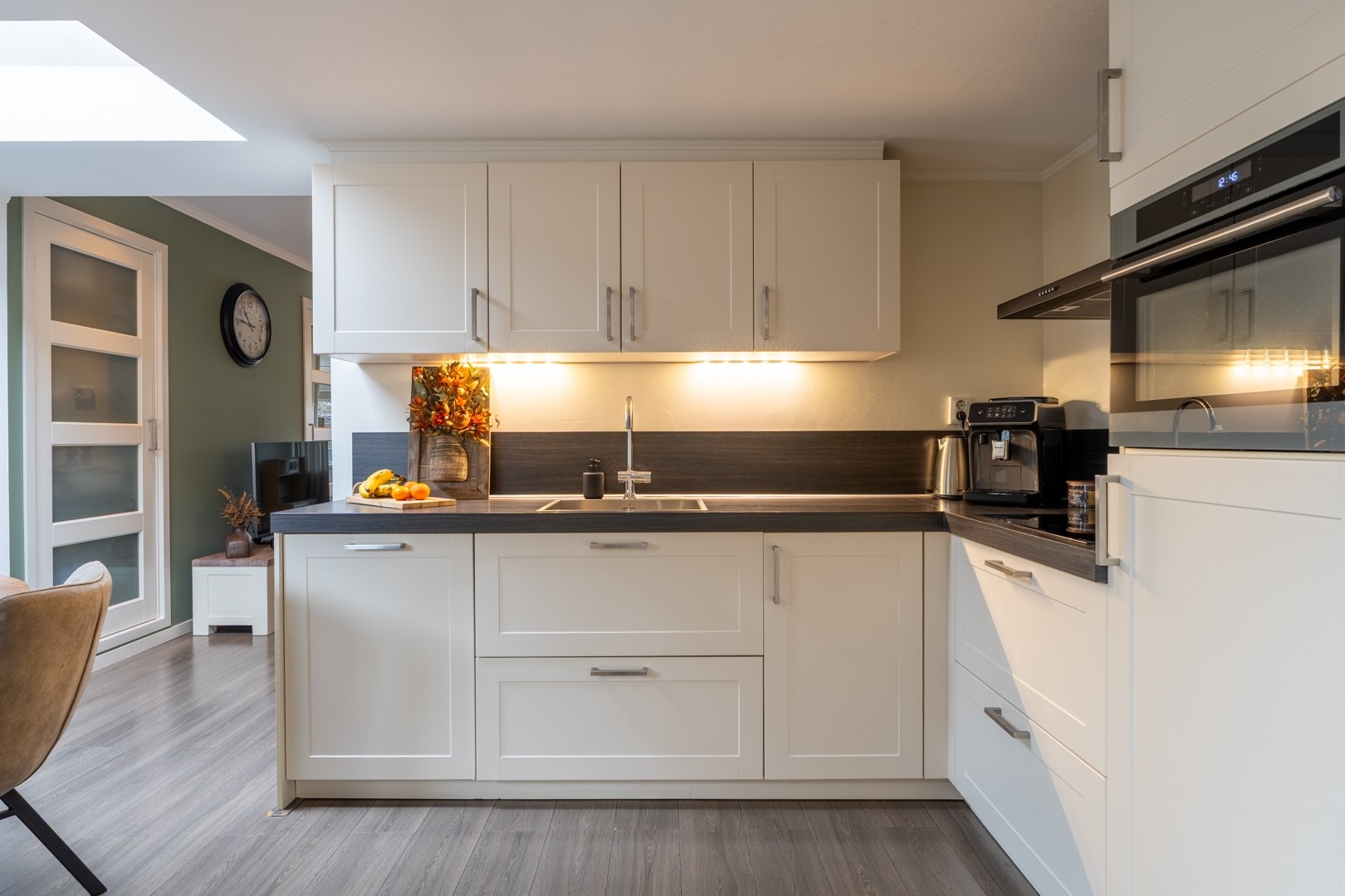 Je komt binnen in een verzorgde hal met praktische kelderruimte. De L-vormige woonkamer biedt volop leefruimte en is voorzien van vaste kastruimte – ideaal voor alles wat je liever niet in het zicht hebt liggen. Aan de achterzijde bevindt zich de ruime woonkeuken in de uitbouw. Deze is uitgerust met een nette hoekopstelling, veel bergruimte en diverse inbouwapparatuur, waaronder een vaatwasser (want met de hand afwassen is zó 2005). Aansluitend vind je de achterportaal met aansluitingen voor wasmachine en droger én een toilet. Via de loopdeur stap je zo de tuin in.