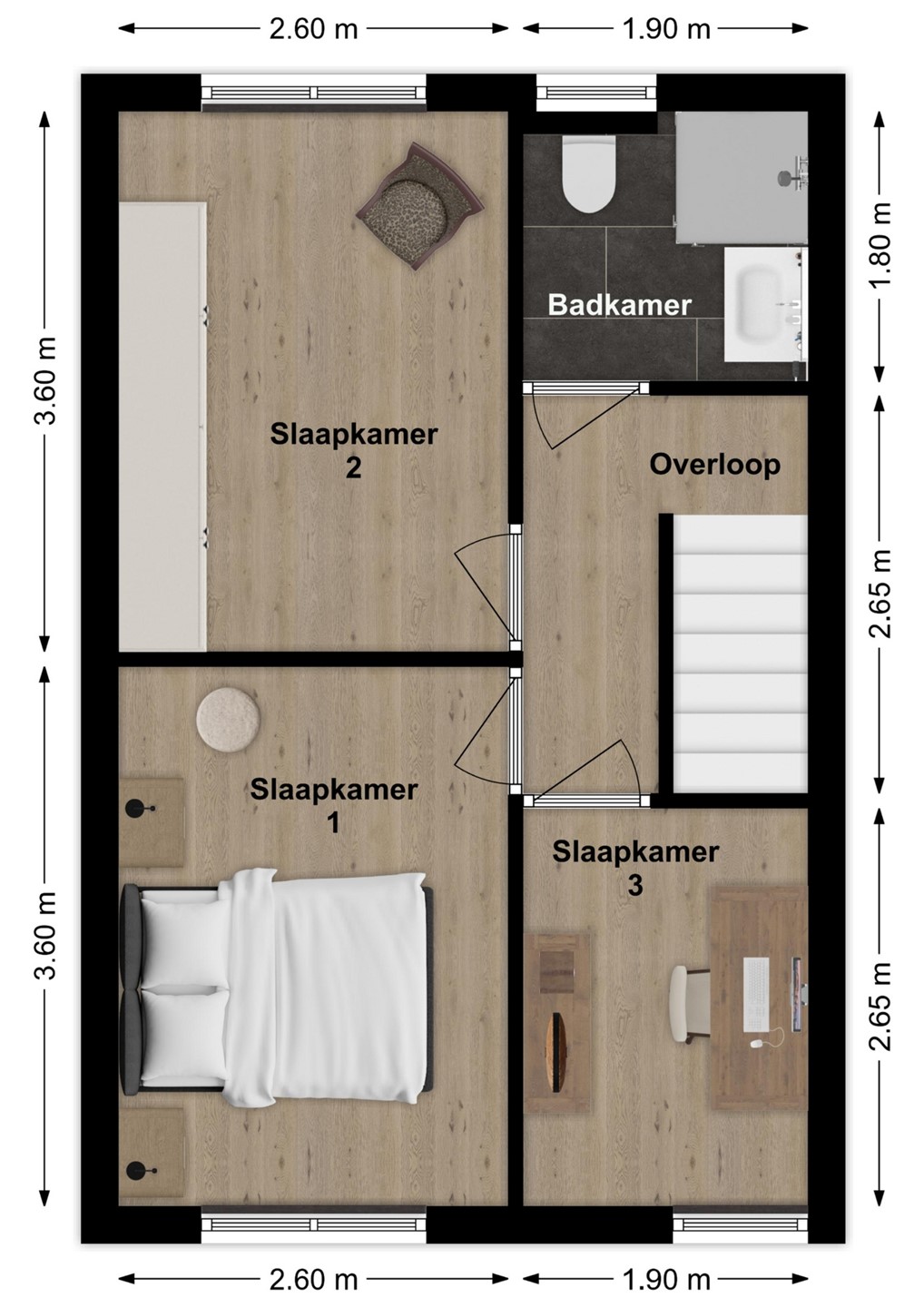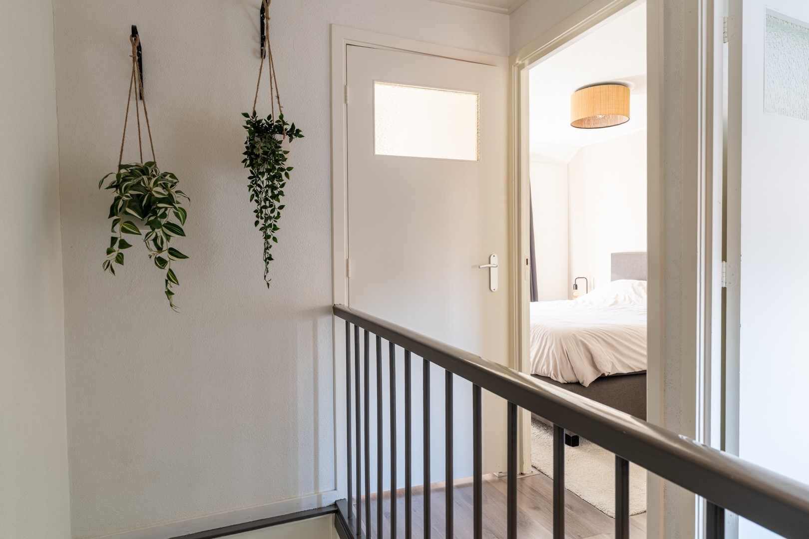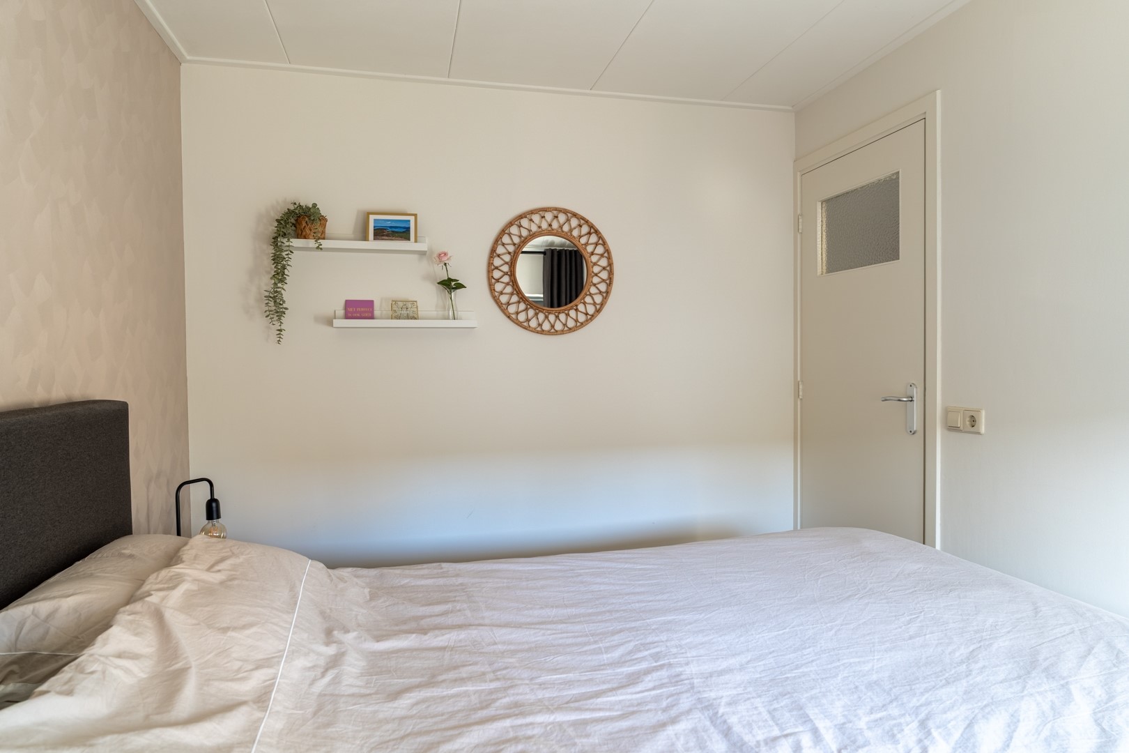 Op de eerste verdieping liggen maar liefst drie slaapkamers, en allemaal van een goed formaat. In één van de kamers staat een grote vaste kast die gewoon achterblijft voor de nieuwe bewoners. De kamers voelen licht en fris aan. De badkamer is compact, maar opvallend netjes. Alles is strak betegeld en voorzien van een douche, toilet en wastafelmeubel met lades.