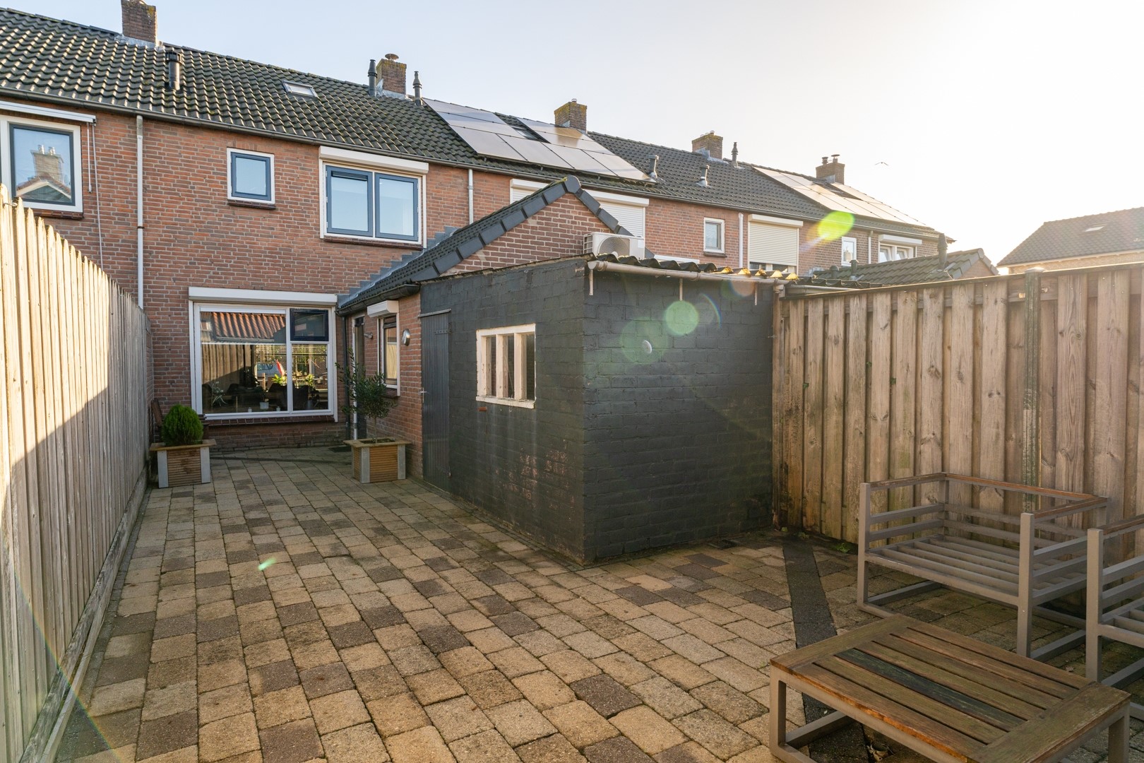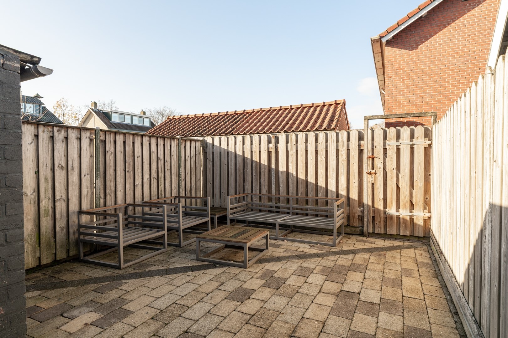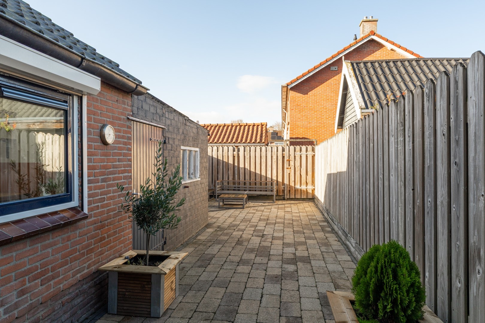 De tuin ligt heerlijk zonnig op het westen. Doordat de woning geen hoge nok heeft, valt het zonlicht al vroeg de tuin in. Aan het huis vast staat een praktische berging van circa 3,5 bij 1,8 meter. In het dak van deze berging is wel asbesthoudend materiaal verwerkt. Geen probleem maar wel goed om te melden. De tuin is volledig omsloten en bereikbaar via een achterom.