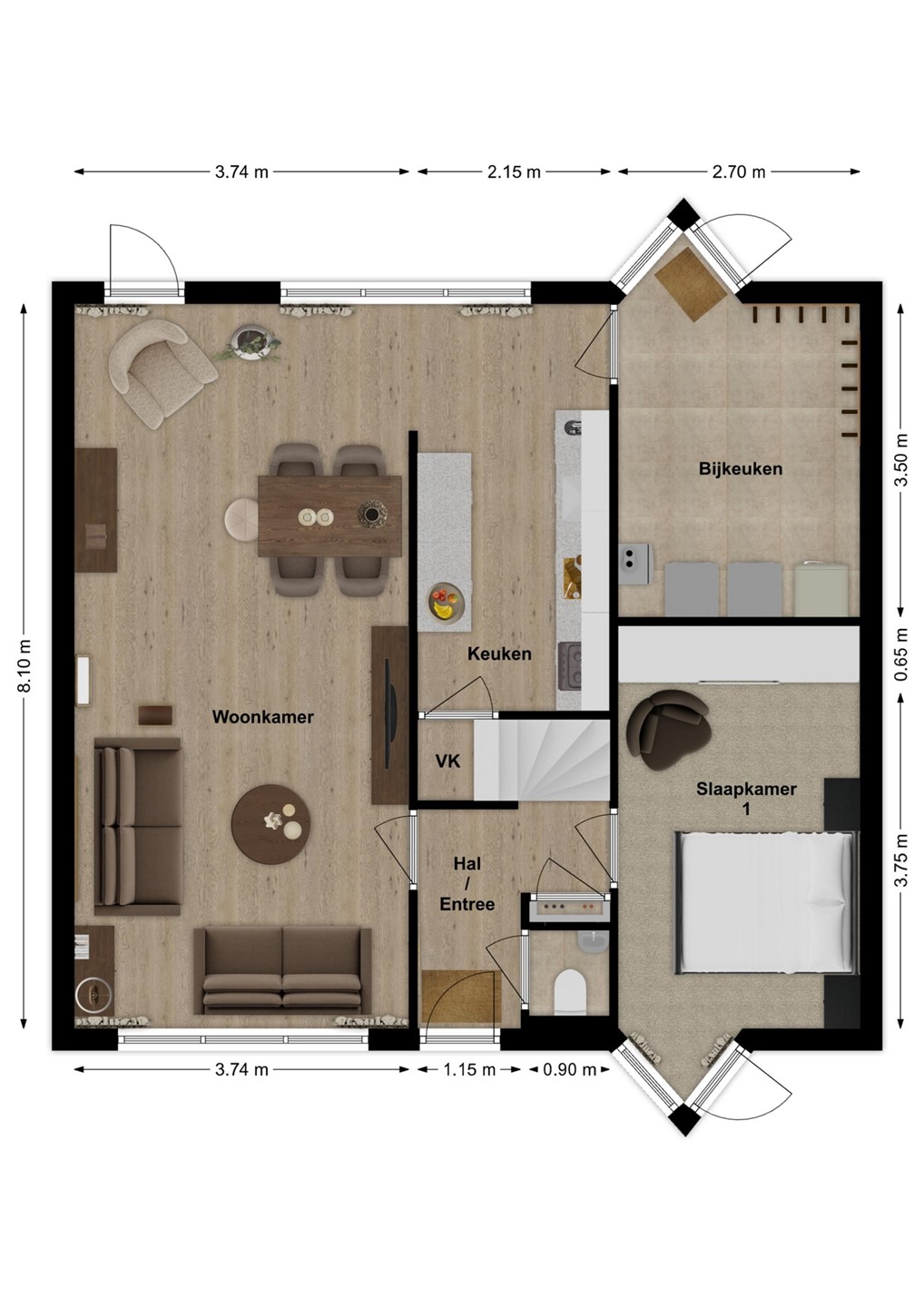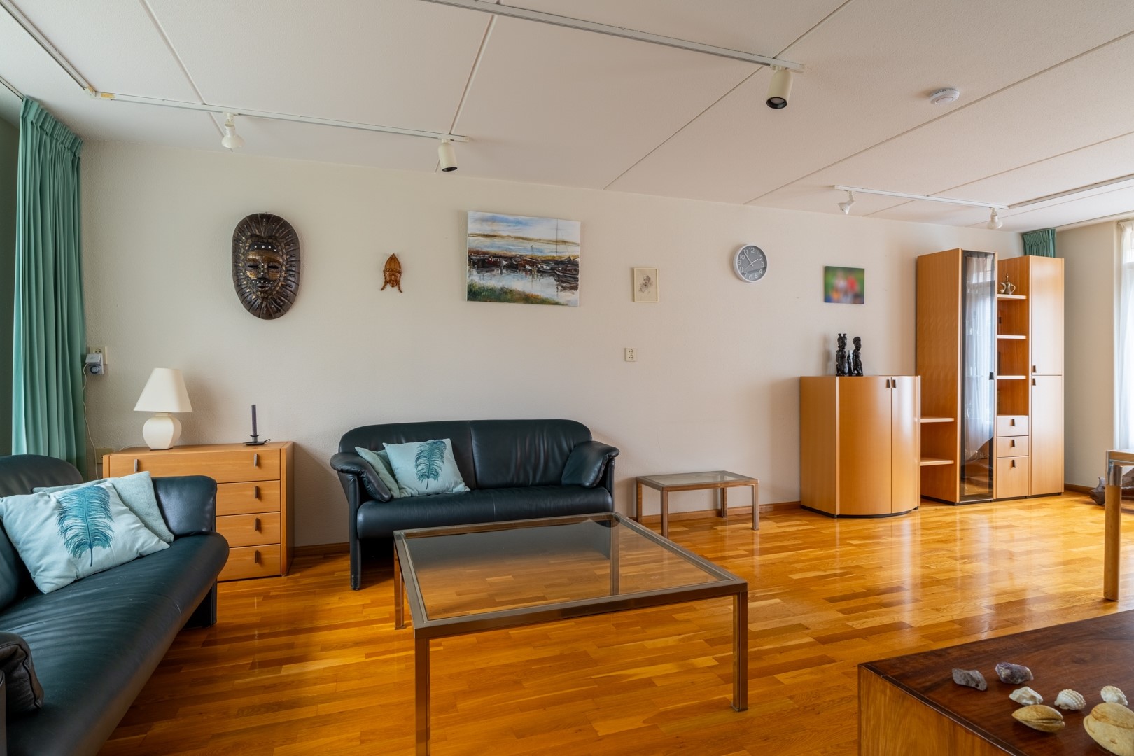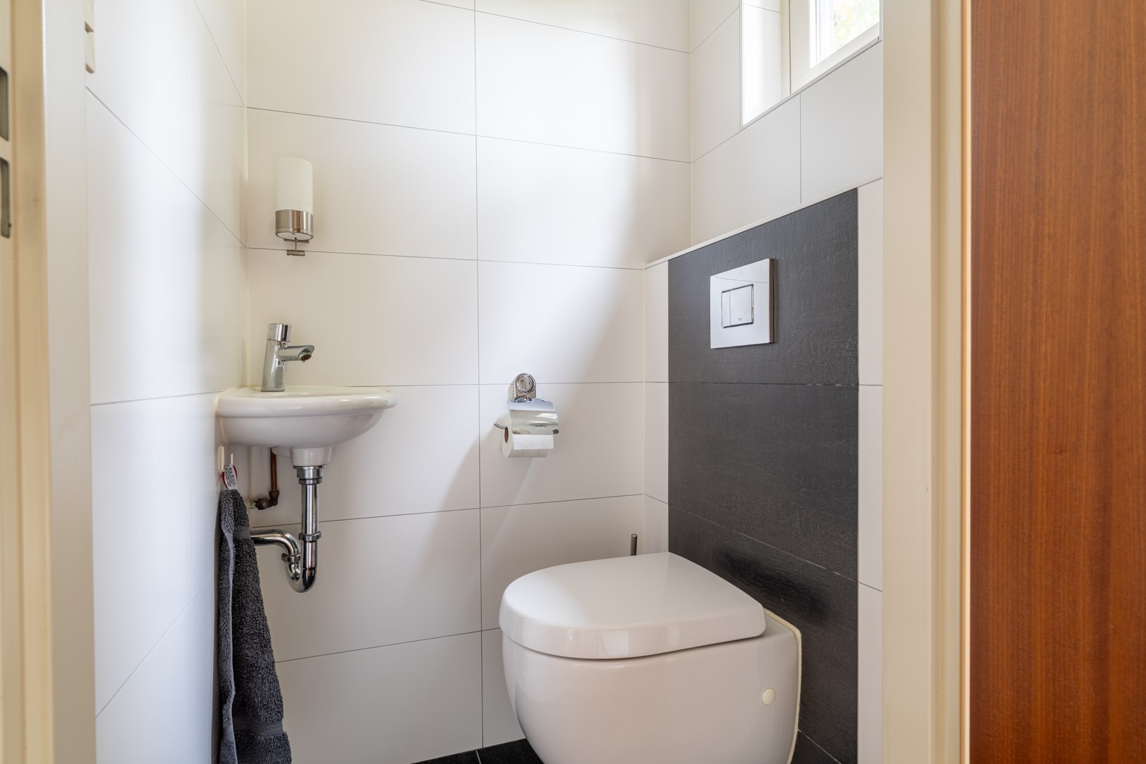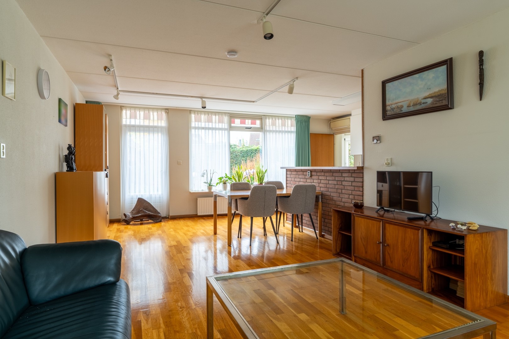 De woonkamer straalt een frisse, lichte sfeer uit dankzij de grote ramen en de gunstige lichtinval. De airco zorgt voor extra comfort: verkoeling op warme dagen en behaaglijke warmte in de winter. De ruimte is praktisch ingedeeld en vormt samen met de open keuken een fijne leefruimte. De keuken is voorzien van diverse inbouwapparatuur: een afzuigkap, 4-pits gaskookplaat, combi-oven en koelkast. Handig detail: er is een ruime trapkast, perfect als voorraadkast of extra bergruimte. Aansluitend bevindt zich de ruime bijkeuken, waar plek is voor wasapparatuur en extra opbergruimte.