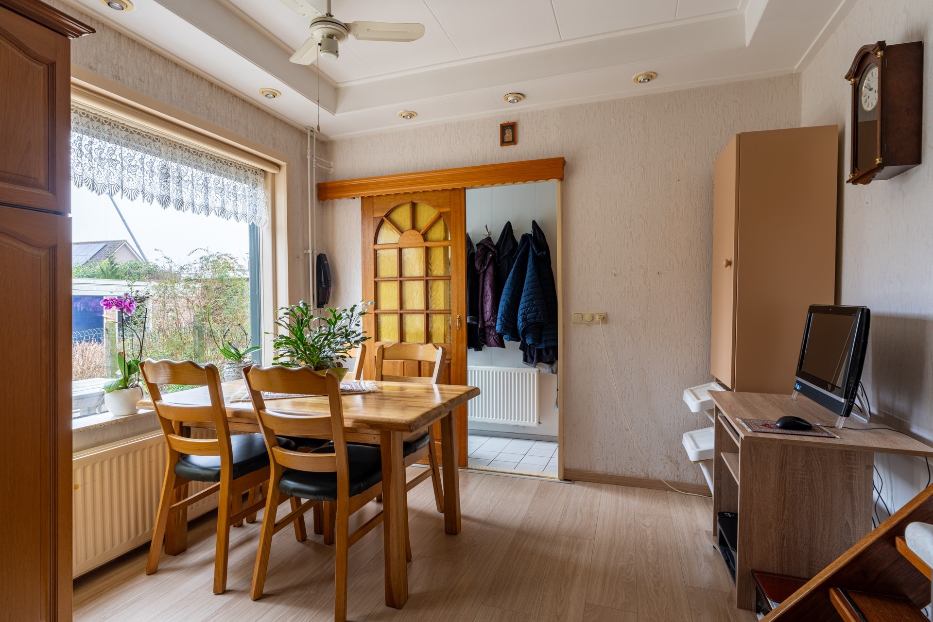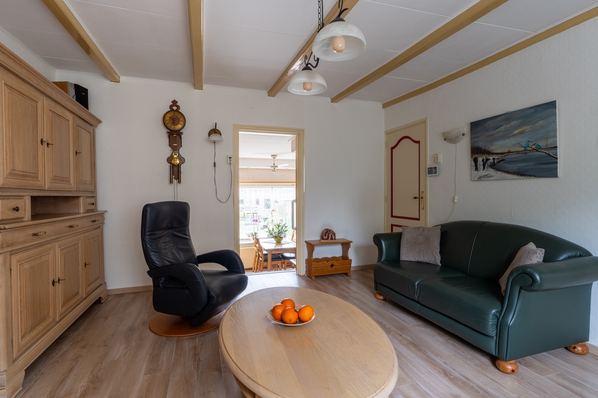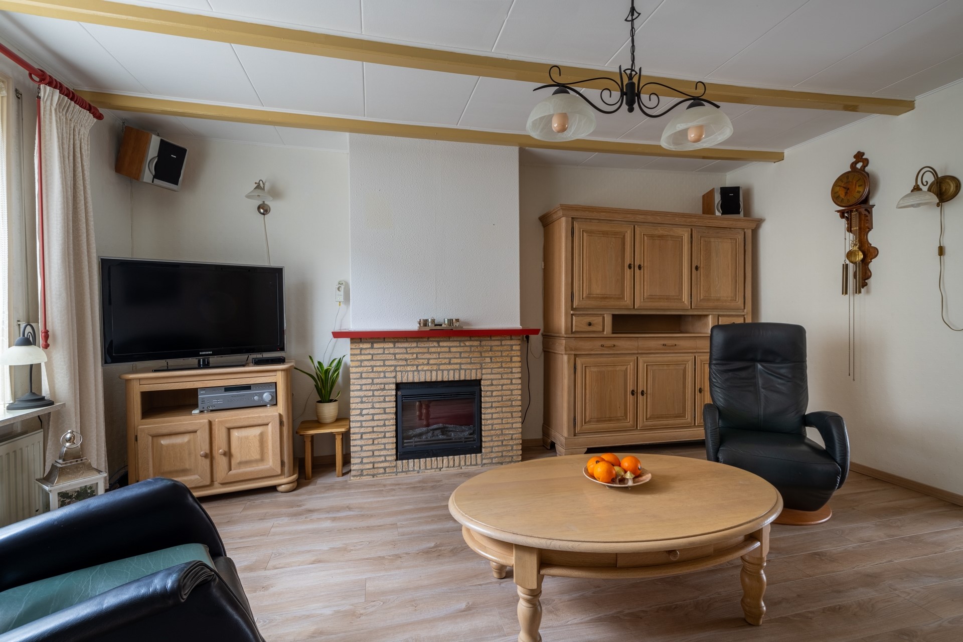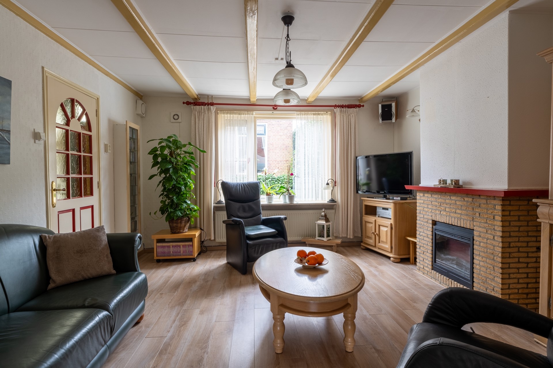 De woonkamer is verrassend ruim, doordat de keuken en eetkamer op een lager niveau liggen. Hierdoor blijft de woonkamer zijn oorspronkelijke functie behouden, zonder dat de ruimte wordt opgeofferd voor andere doeleinden. Dankzij de grote ramen komt er veel natuurlijk licht binnen, waardoor de ruimte optisch groter lijkt. De woonkamer wordt verwarmd door radiatoren en heeft daarnaast een sfeervolle elektrische haard, netjes ingebouwd in een schouw.
