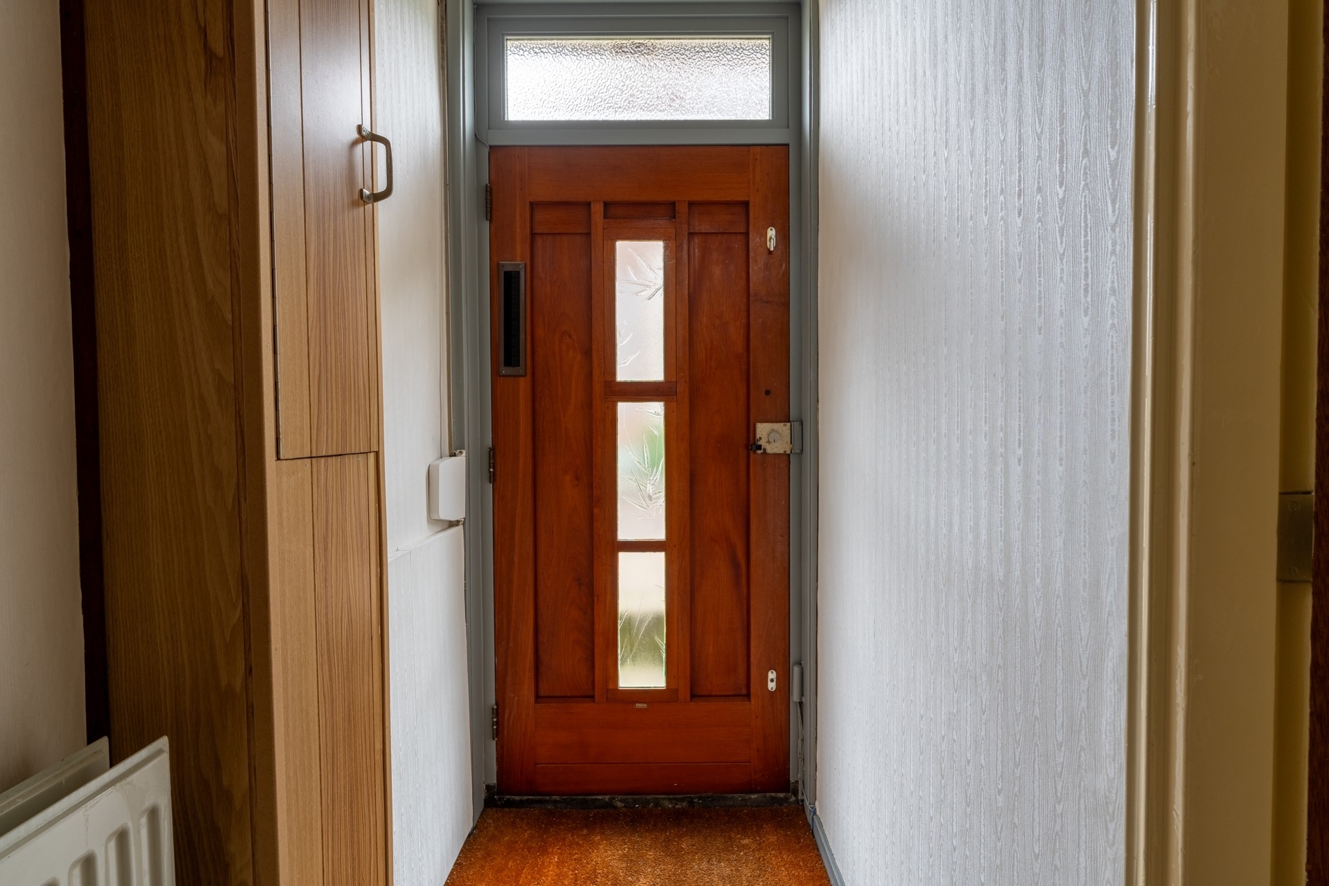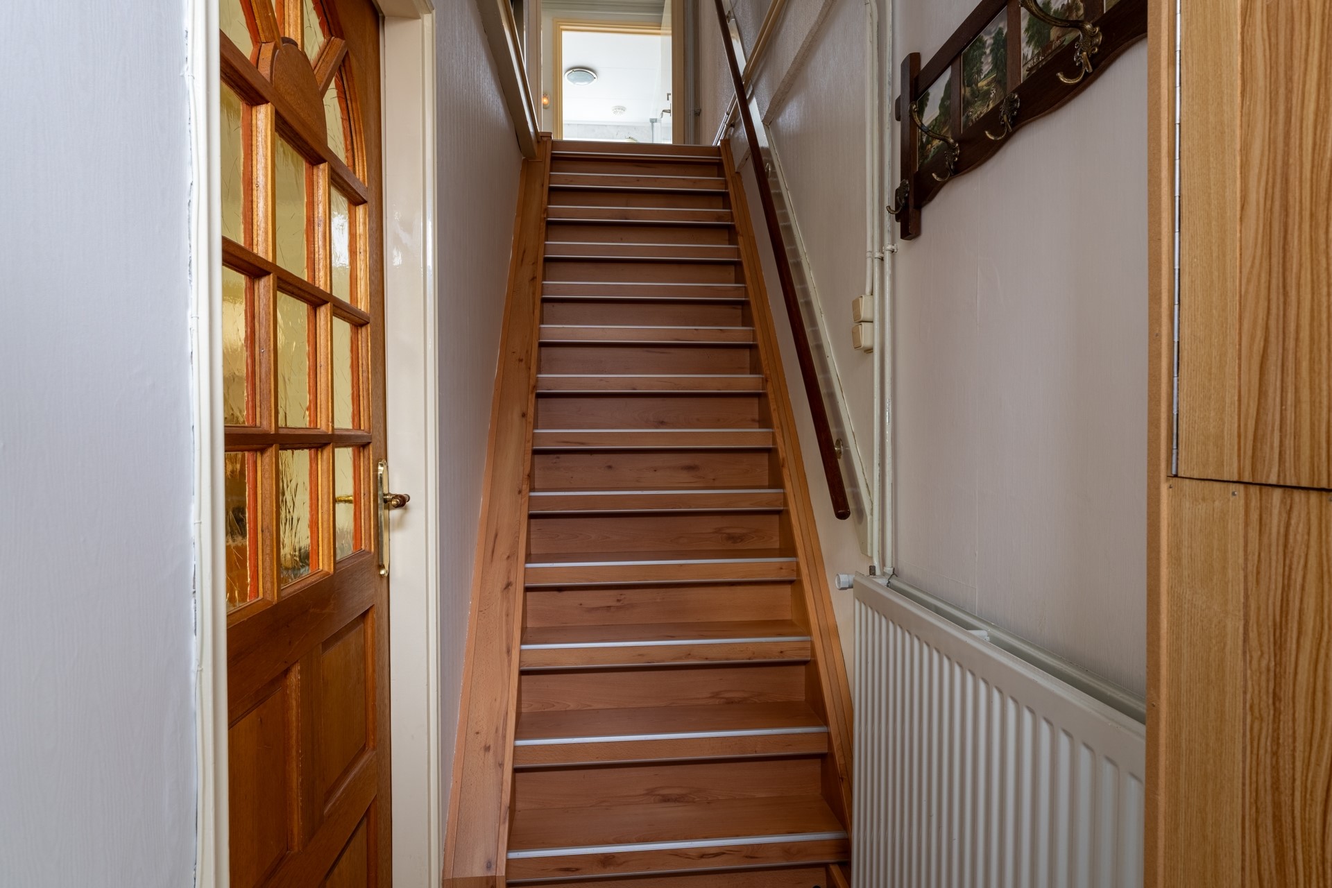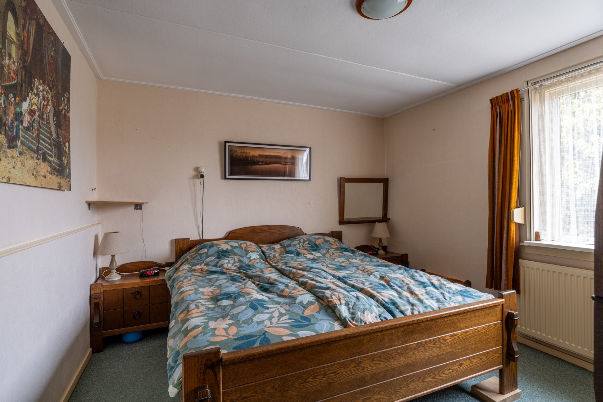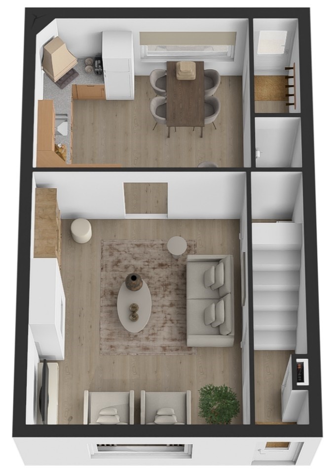 De woonkamer is verrassend ruim, doordat de keuken en eetkamer op een lager niveau liggen. Hierdoor blijft de woonkamer zijn oorspronkelijke functie behouden, zonder dat de ruimte wordt opgeofferd voor andere doeleinden. Dankzij de grote ramen komt er veel natuurlijk licht binnen, waardoor de ruimte optisch groter lijkt. De woonkamer wordt verwarmd door radiatoren en heeft daarnaast een sfeervolle elektrische haard, netjes ingebouwd in een schouw.
