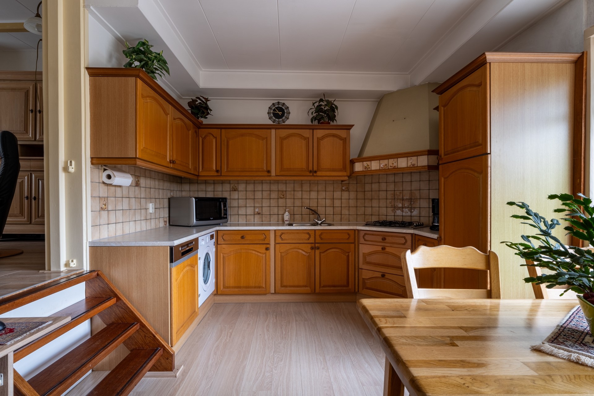 De keuken bevindt zich, zoals het hoort bij een splitlevel-woning, op een iets lager gelegen niveau, wat zorgt voor een ruimtelijk effect. De keuken is voorzien van een 4-pits gaskookplaat, koelkast, afzuigkap, vaatwasser en een geïntegreerde wasmachine.