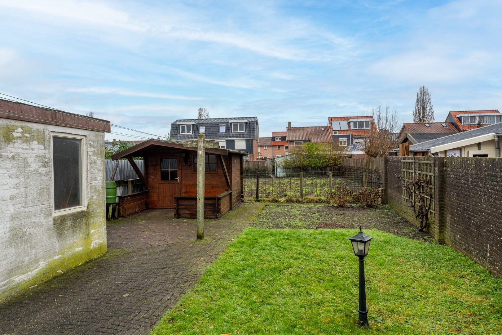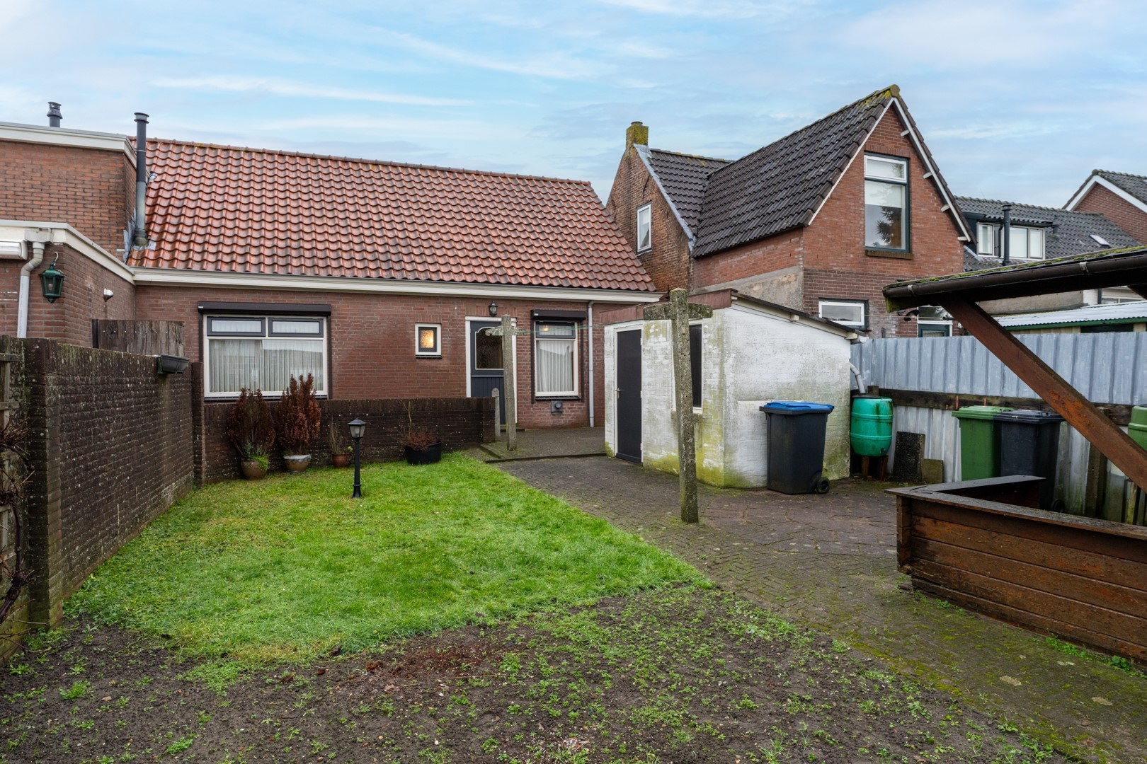 Ook de tuin vraagt om aandacht en creativiteit. Het perceel beschikt momenteel over twee bergingen: één stenen en één houten berging, beide van prima formaat. De buren hebben een recht van overpad naar de openbare weg, wat invloed heeft op de huidige indeling van de tuin. Met een slimme herinrichting — bijvoorbeeld door de berging achter op het perceel te plaatsen en de brandgang langs de achterzijde te laten lopen — is hier echter zeker iets moois van te maken.
