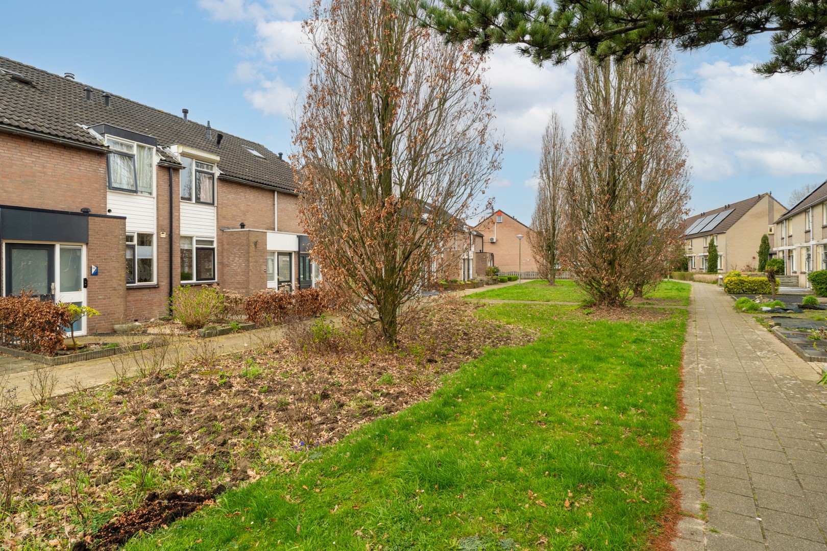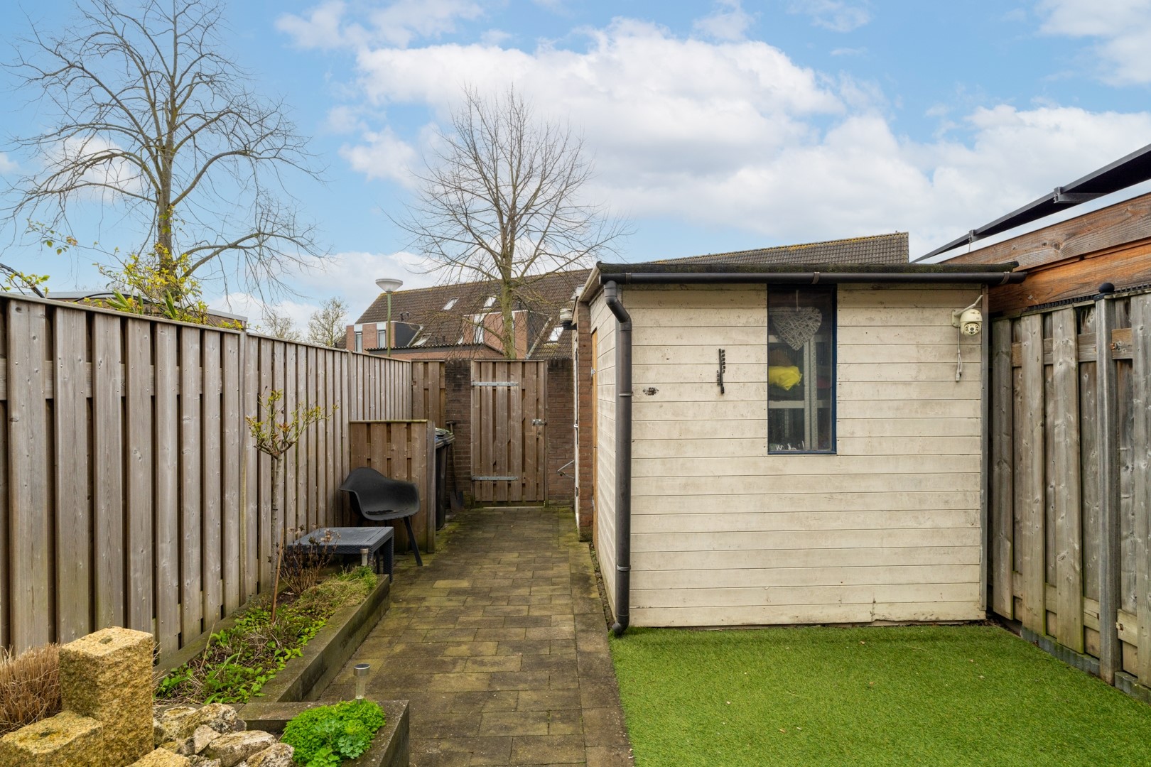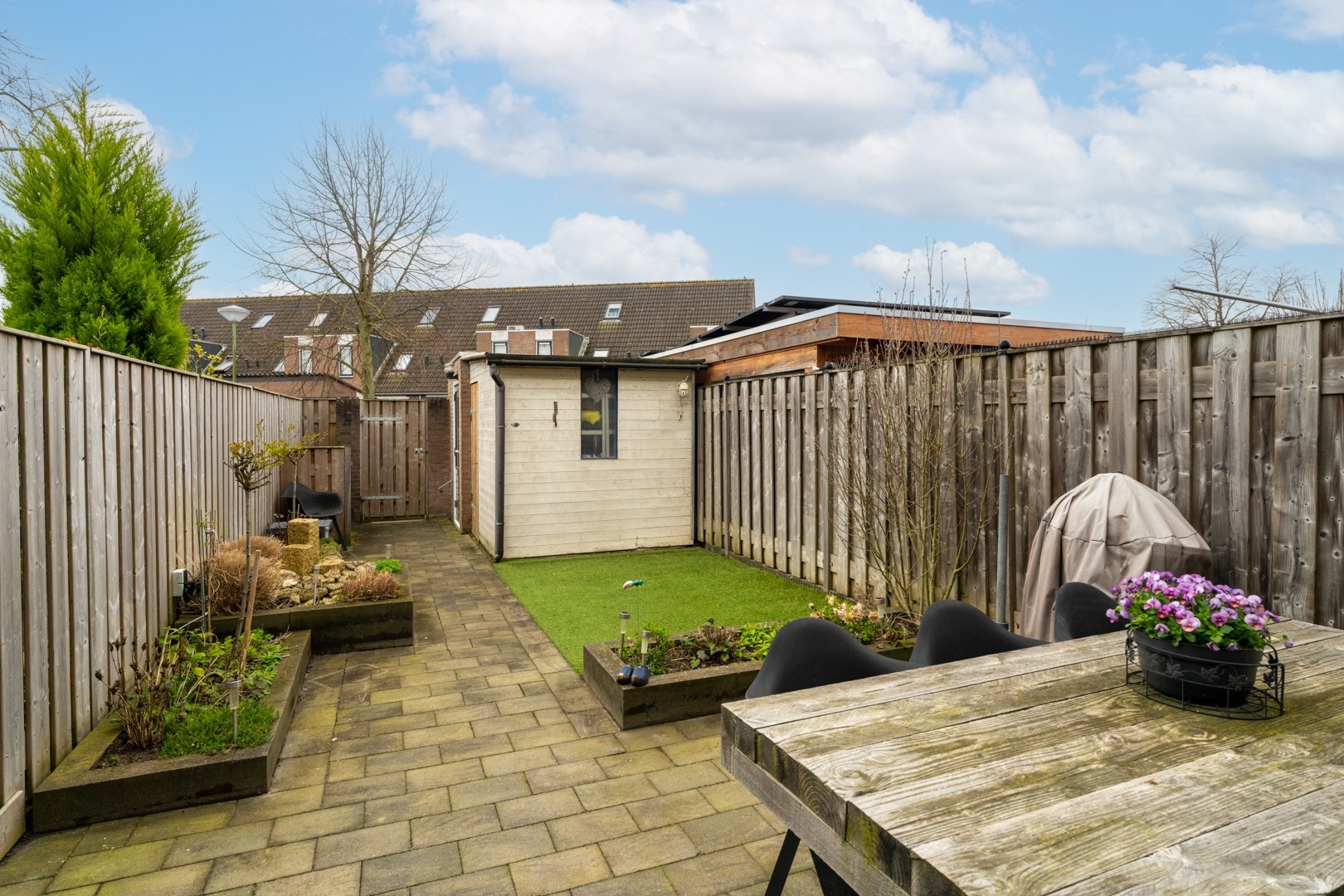 De achtertuin is een fijne plek waar je direct van kunt genieten. De tuin is speels en verzorgd aangelegd met een combinatie van sierbestrating, kunstgras en plantenborders. Dit zorgt voor een gezellige uitstraling zonder dat je veel tijd kwijt bent aan onderhoud. Hier kun je heerlijk zitten met een kop koffie in de ochtendzon of juist ontspannen na een lange werkdag. En met een ligging op het zuiden wil het met het zonnetje wel lukken! Ook voor kinderen is er voldoende ruimte om te spelen. Achter op het perceel bevindt zich een praktische berging, ideaal voor fietsen, tuinspullen en gereedschap.