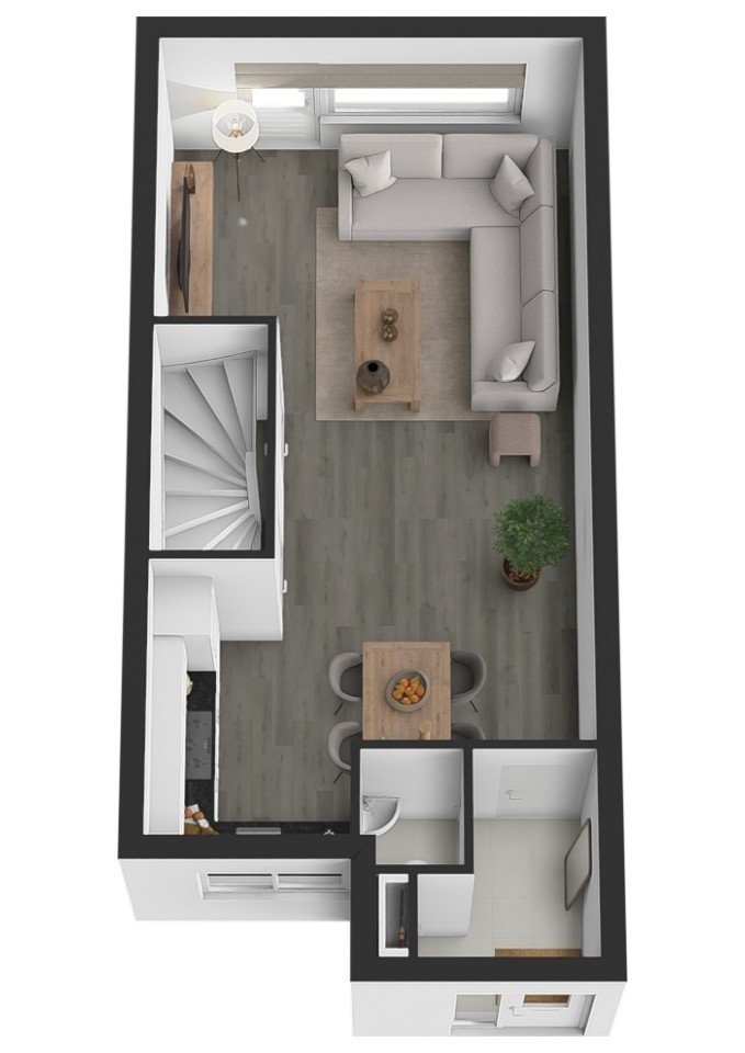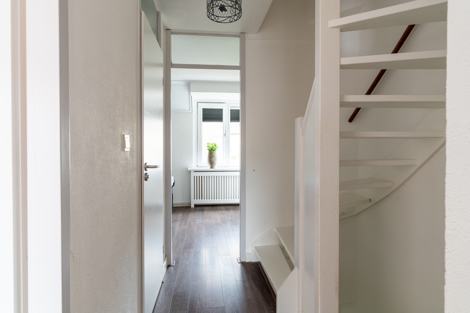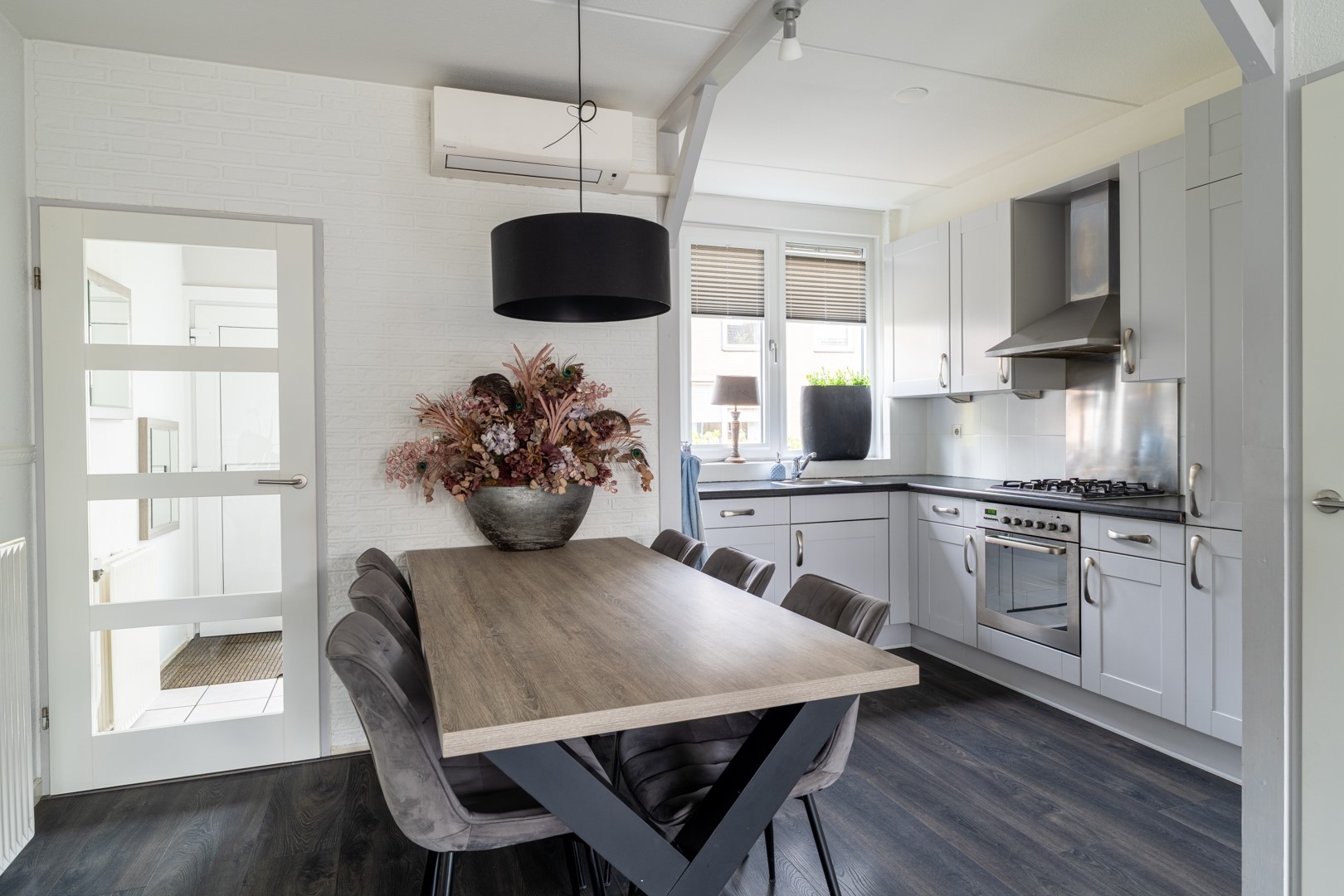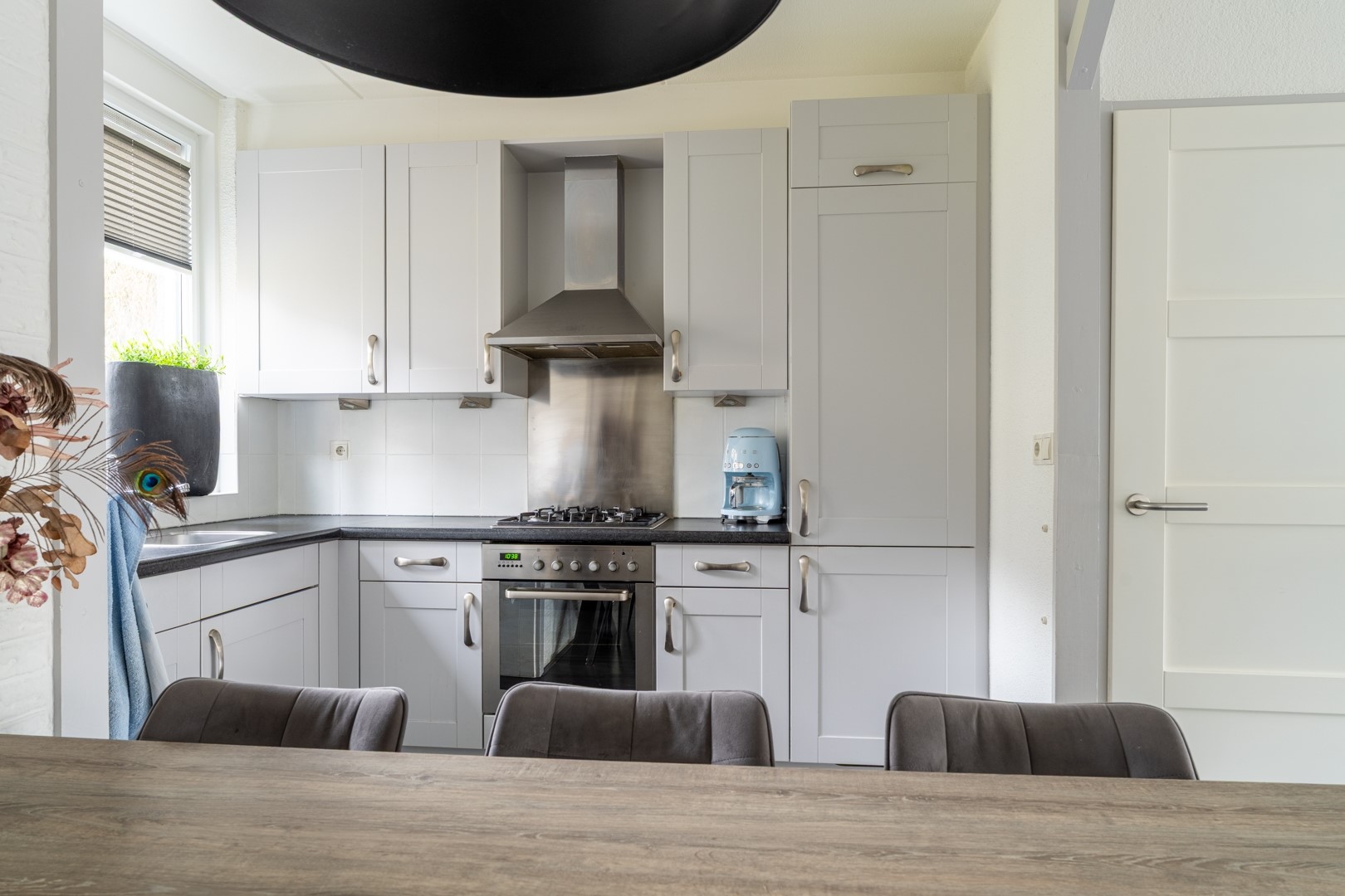 Bij binnenkomst via de voordeur kom je in de hal, die direct een verzorgde indruk geeft. Vanuit hier heb je toegang tot het toilet, de woonkamer en de keuken. De keuken is praktisch opgesteld in een hoekopstelling en biedt volop werk- en bergruimte. Ideaal voor wie graag kookt of gewoon houdt van een opgeruimde keuken. De aanwezige inbouwapparatuur, waaronder een vaatwasser, maakt het geheel compleet en gebruiksvriendelijk. De woonkamer vormt het hart van de woning en is heerlijk licht dankzij de grote raampartijen. Het is een fijne leefruimte waar je moeiteloos een comfortabele zithoek én een gezellige eethoek kunt creëren. Of je nu een avondje op de bank hangt of vrienden over de vloer hebt—hier zit je goed. Via een loopdeur stap je zo de achtertuin in, wat het binnen- en buitenleven mooi met elkaar verbindt. Extra praktisch is de trapkast: dé plek voor proviand, huishoudelijke spullen of alles wat je liever uit het zicht opbergt. Een onmisbaar element in een gezinswoning.