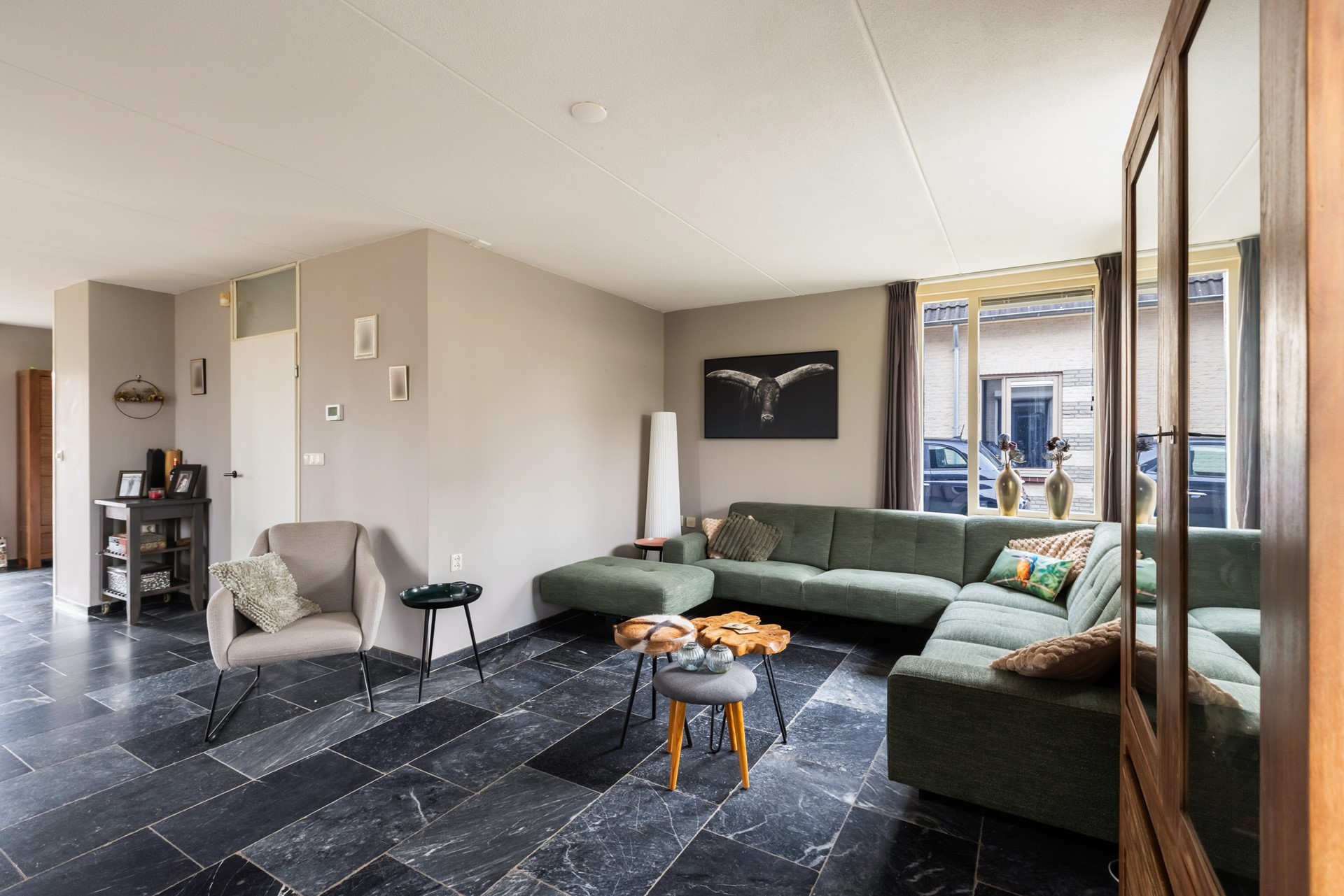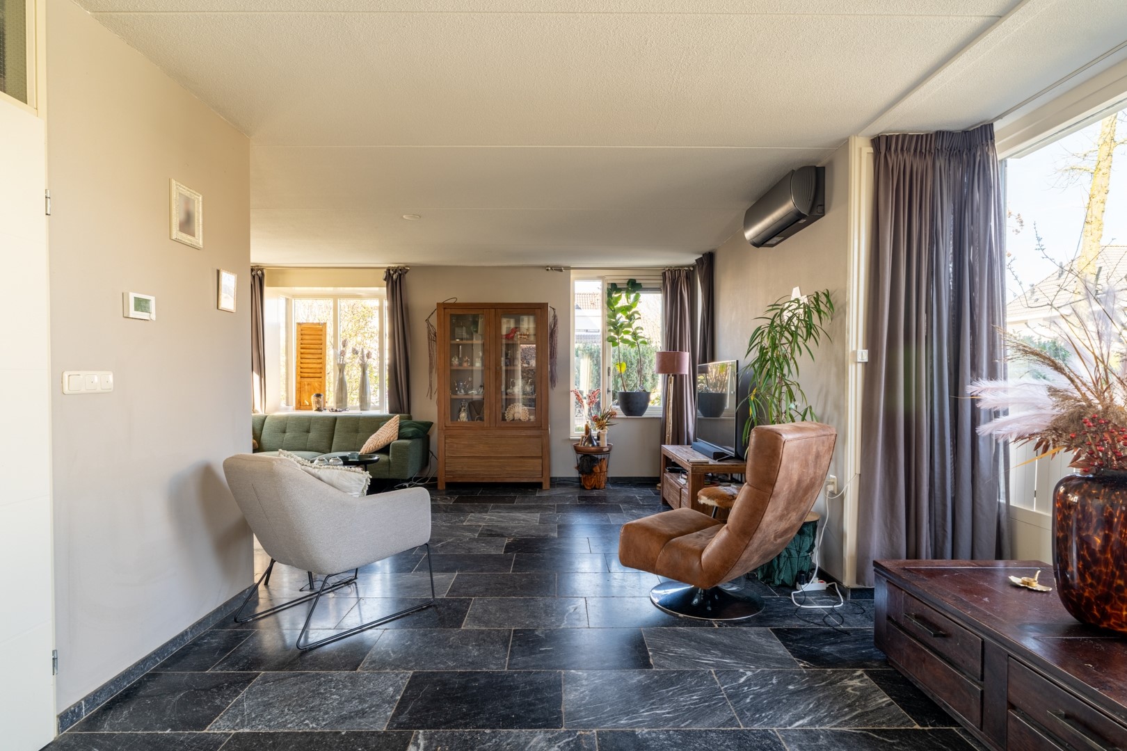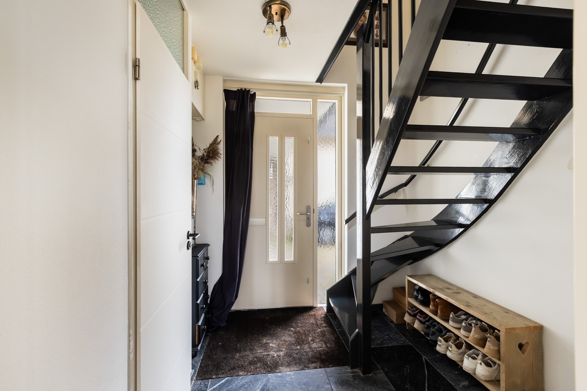 De entree bevindt zich aan de zijkant van de woning en brengt je in de ontvangsthal met toegang tot het toilet, de woonkamer en de trap naar boven. De woonkamer is heerlijk licht dankzij de vele raampartijen en twee charmante erkers. Een fijne, royale leefruimte waar je met gemak een grote zithoek én eethoek kwijt kunt. Extra comfortabel: zowel de woonkamer als de keuken zijn voorzien van vloerverwarming.