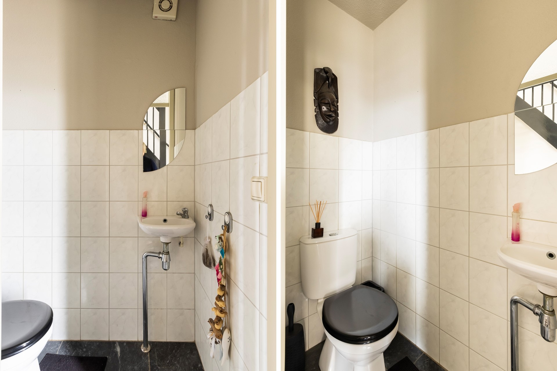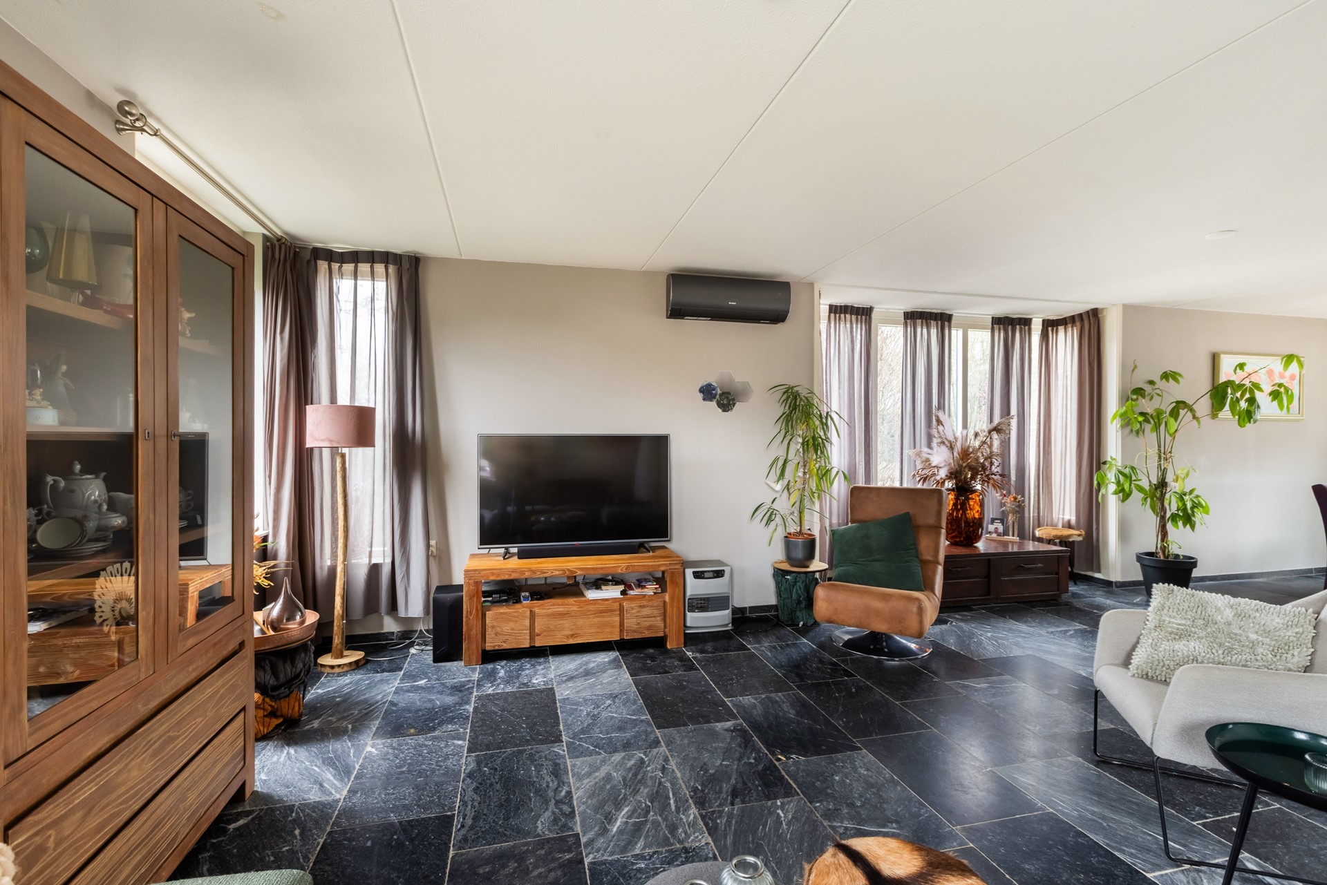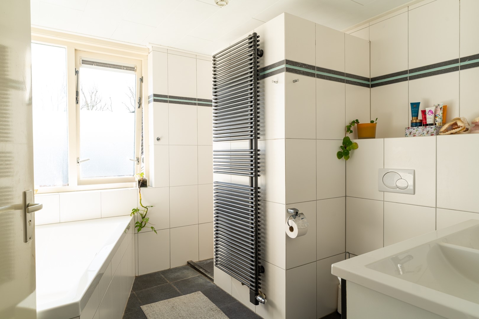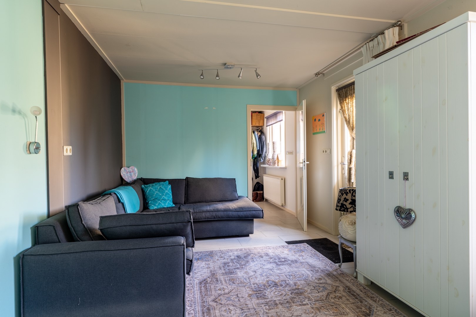 De entree bevindt zich aan de zijkant van de woning en brengt je in de ontvangsthal met toegang tot het toilet, de woonkamer en de trap naar boven. De woonkamer is heerlijk licht dankzij de vele raampartijen en twee charmante erkers. Een fijne, royale leefruimte waar je met gemak een grote zithoek én eethoek kwijt kunt. Extra comfortabel: zowel de woonkamer als de keuken zijn voorzien van vloerverwarming.