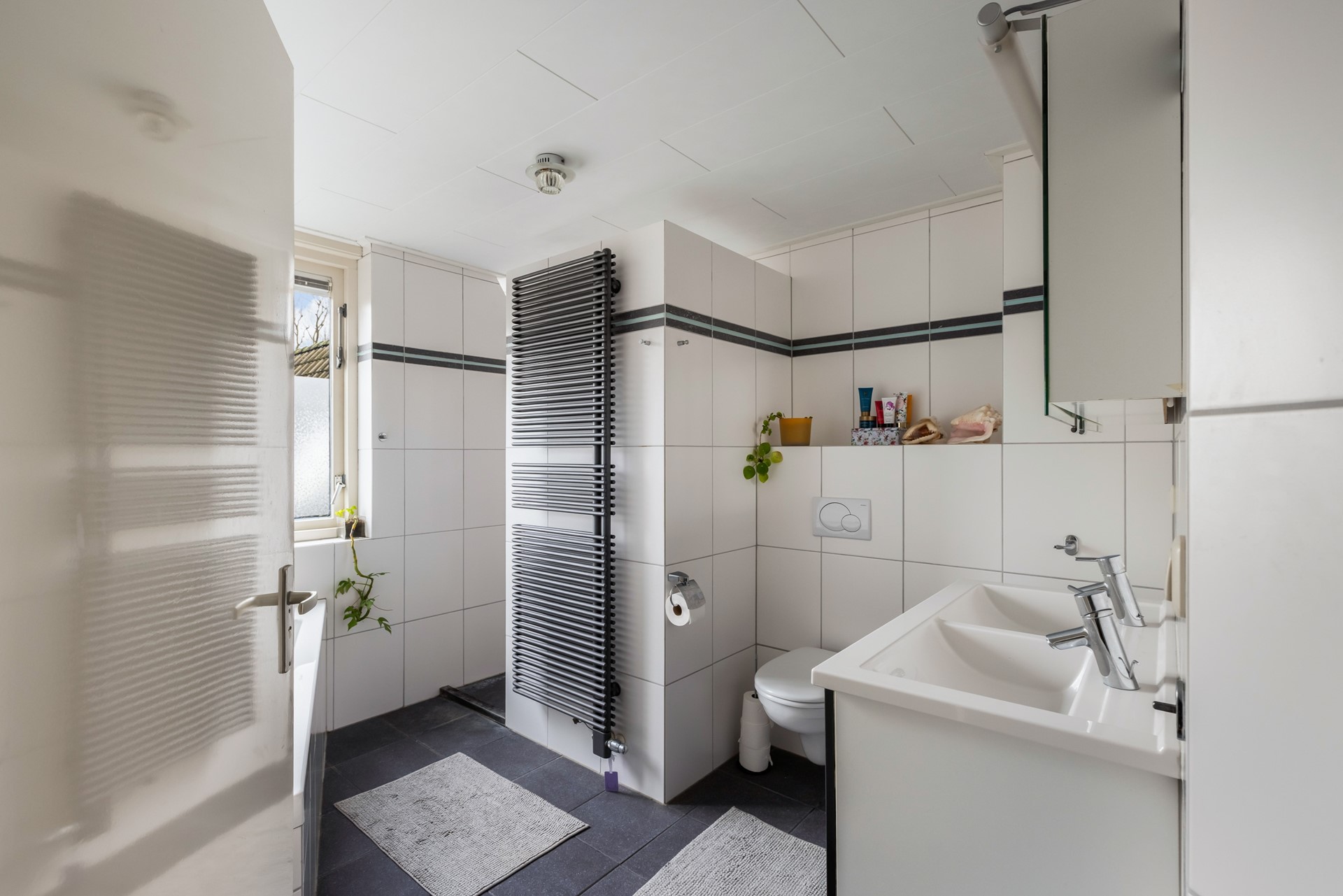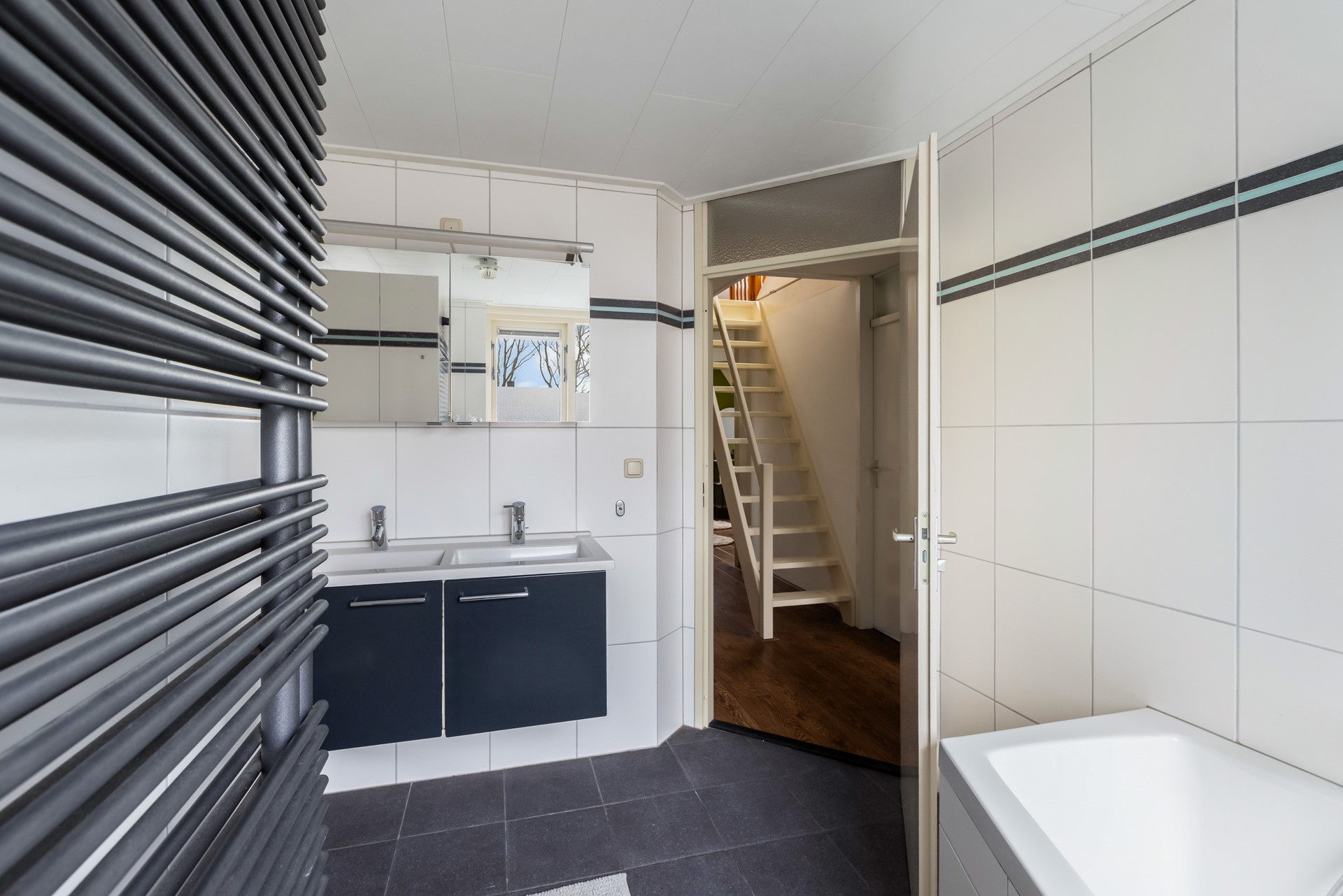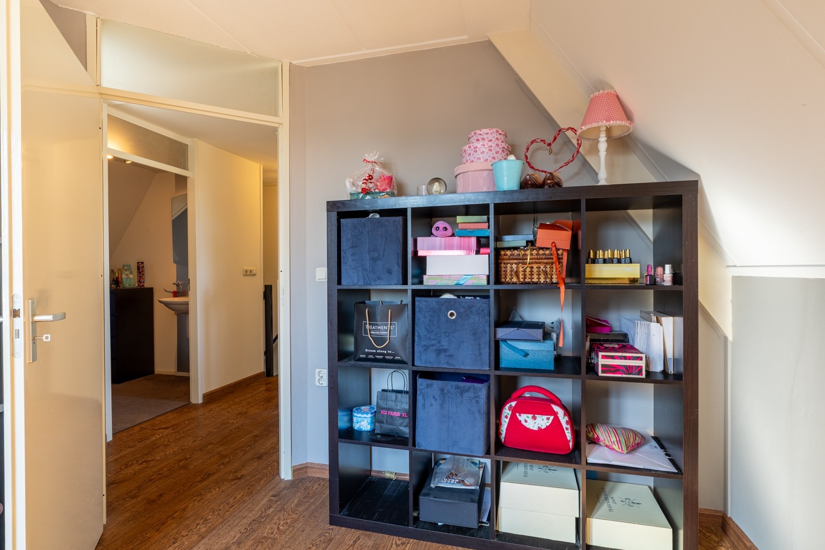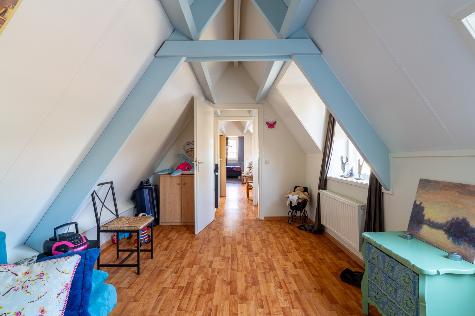 Op de eerste verdieping bevinden zich oorspronkelijk vijf slaapkamers en een badkamer. Aan de voorzijde zijn twee kamers samengevoegd tot één royale slaapkamer met eigen wastafel en rolluiken. De slaapkamer aan de zijkant is momenteel ingericht als walk-in-closet – een luxe toevoeging. Uiteraard is deze ruimte ook weer als slaapkamer te gebruiken. De badkamer is compleet uitgevoerd met een ligbad, inloopdouche, zwevend toilet, designradiator en een wastafelmeubel met dubbele wastafel en spiegelkast.