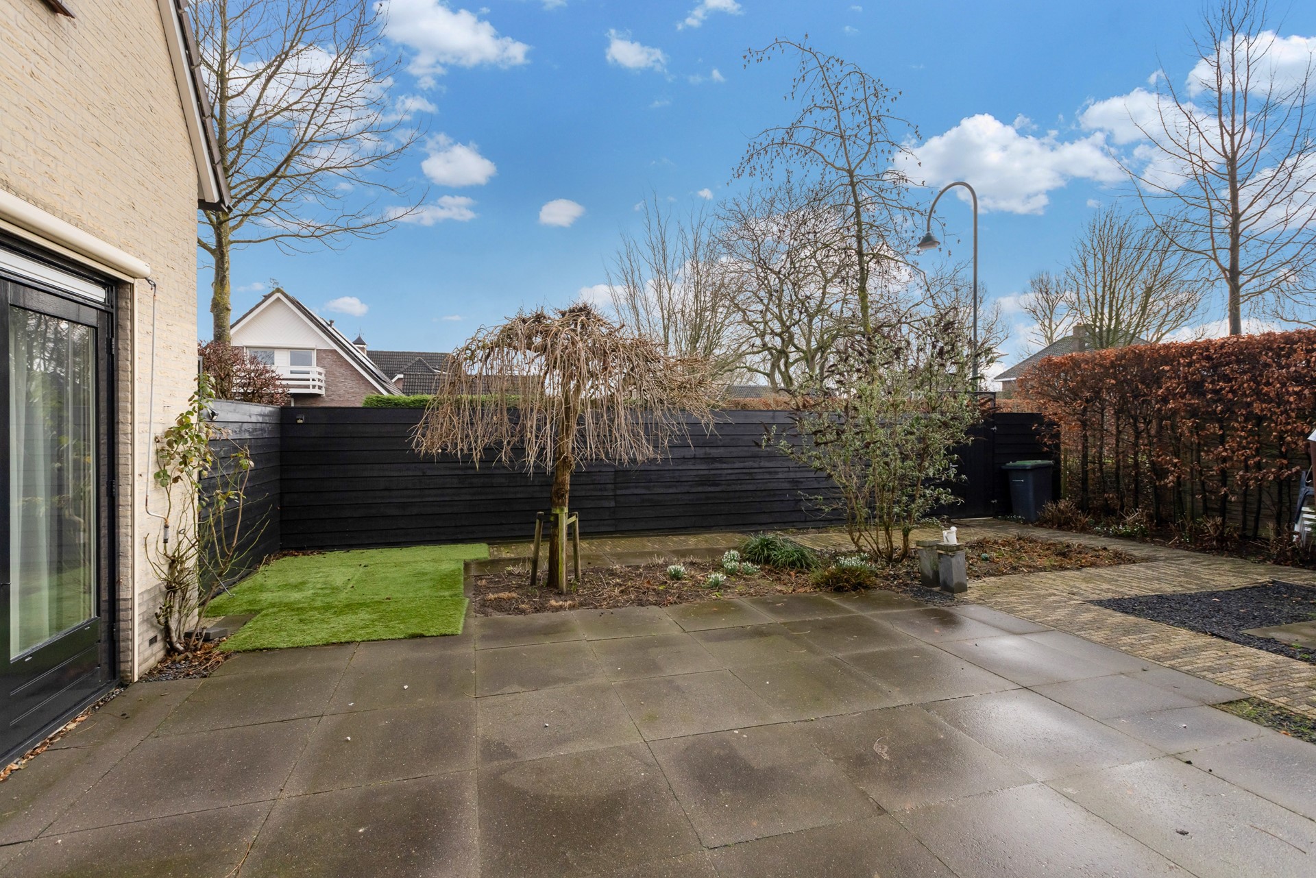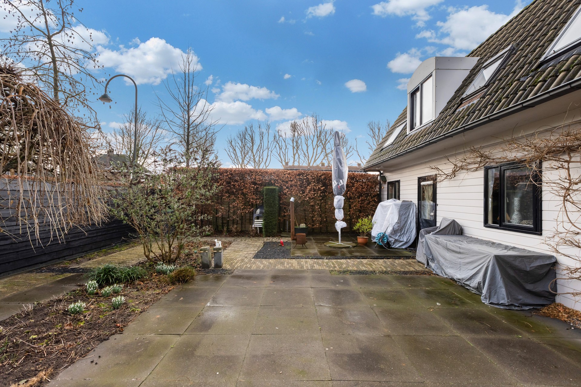 De achtertuin is volledig omsloten en onderhoudsvriendelijk aangelegd. Een fijne, rustige plek waar je dankzij de ligging op het zuiden al vroeg in het seizoen van de zon kunt genieten. Aan de voorzijde ligt een verzorgde siertuin en een eigen oprit met volop parkeergelegenheid.