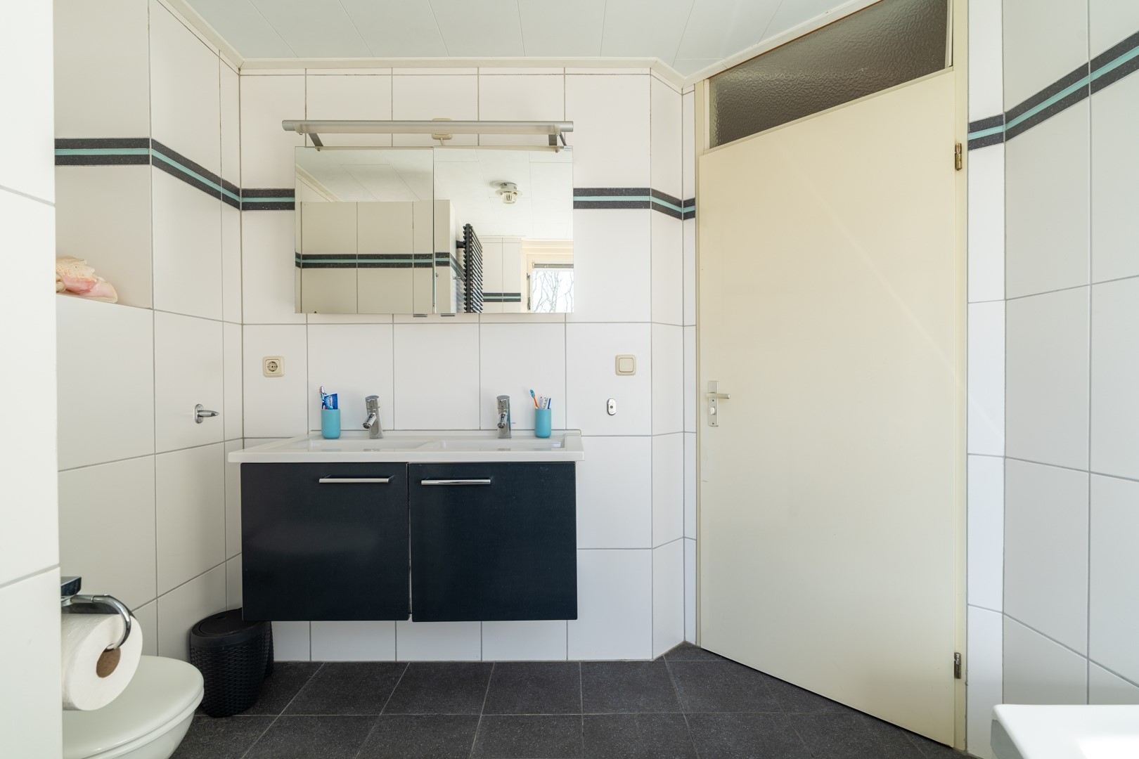 De inpandige garage beschikt over een elektrische sectionaaldeur aan de voorzijde. Verder vind je hier een uitstortgootsteen en een praktische washoek met wasmachine- en drogeraansluiting. Vanuit de garage heb je toegang tot de keuken, de achtertuin én het achterhuis. De ruimte is volledig betegeld en multifunctioneel inzetbaar.