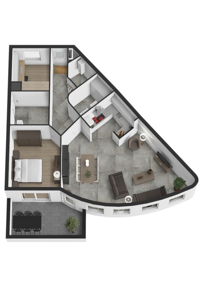 Het balkon ligt op het zuidwesten, dus dat betekent: middag- én avondzon. Je kunt er zowel vanuit de woonkamer als de grote slaapkamer naartoe. Perfect voor een drankje na het werk of een boek in de zon.