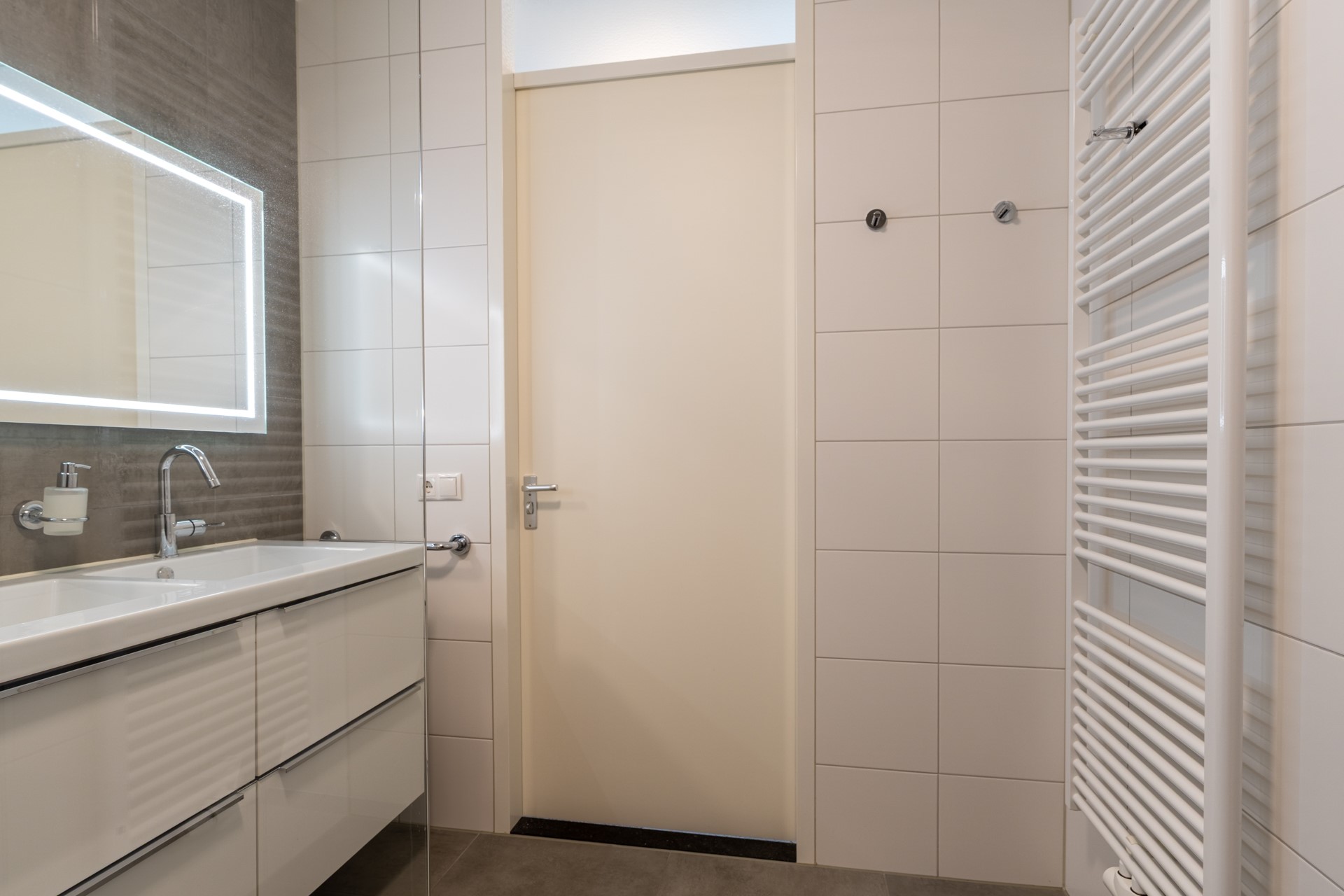 Er zijn twee ruime slaapkamers. De ene heeft een schuifpui naar het balkon – heerlijk! – en de andere is voorzien van een handige kastenwand met schuifdeuren. De badkamer is stijlvol en luxe, met een grote inloopdouche, mooi wastafelmeubel met spiegel en lades, een designradiator en extra opbergkastje.