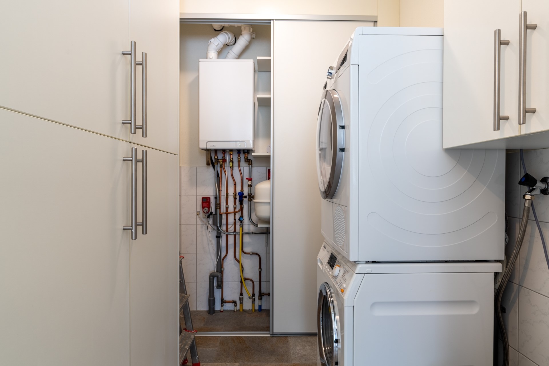 De keuken is echt een blikvanger. Mooie u-vorm, strak stenen werkblad en helemaal compleet met inductiekookplaat, afzuigkap, koelkast, vriezer, combimagnetron én vaatwasser. Door de open indeling sta je tijdens het koken gewoon gezellig in contact met de woonkamer. In de bijkeuken vind je nog extra bergruimte, plus de afzuigunit en cv-ketel.