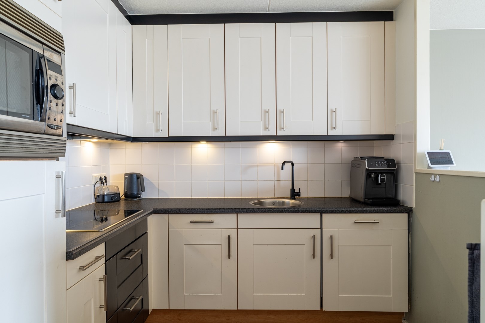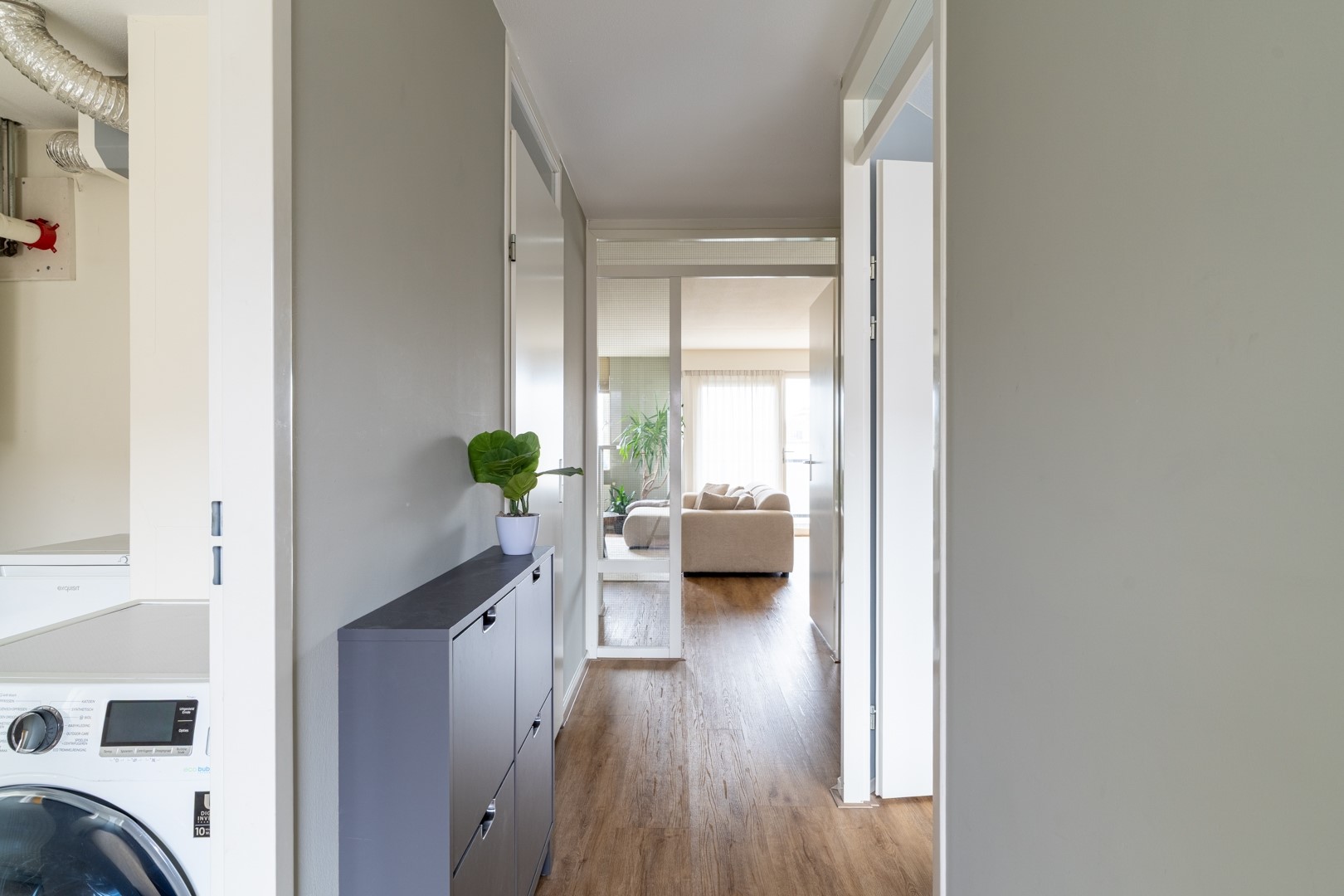 Via de galerij stap je binnen in de hal, die toegang biedt tot vrijwel alle vertrekken: een slaapkamer, het toilet, de wasruimte en natuurlijk de fijne woonkeuken. De keuken en woonkamer lopen mooi in elkaar over en vormen samen een prettige, open leefruimte waar je alle kanten mee op kunt. Dankzij de grote ramen is het hier heerlijk licht en uitnodigend. Via de schuifpui stap je zo het balkon op. De keuken is fris en modern uitgevoerd, met volop bergruimte en diverse inbouwapparatuur, waaronder een vaatwasser. De vaste trap brengt je naar de verdieping, waar het appartement zijn ware omvang prijsgeeft.