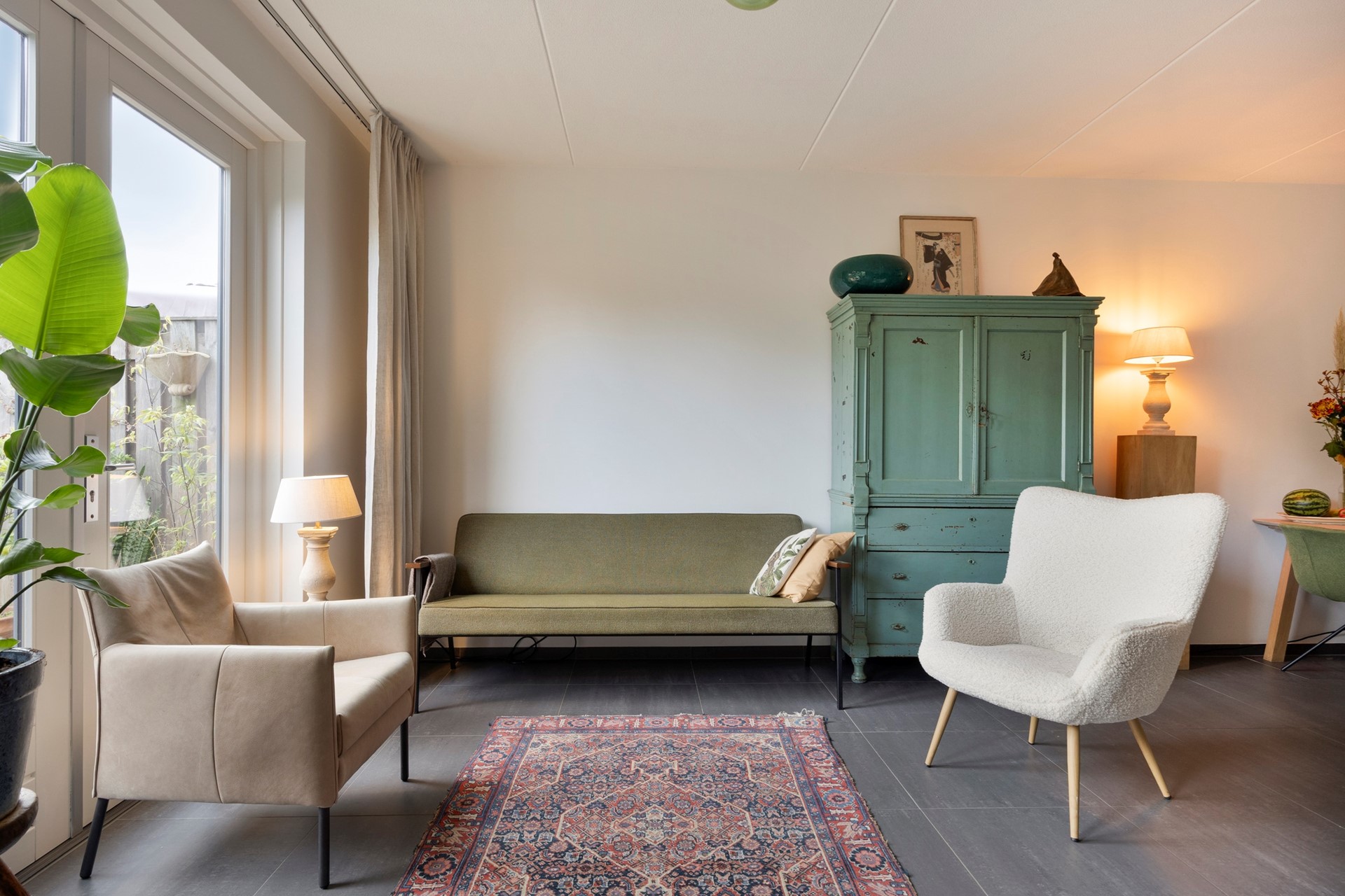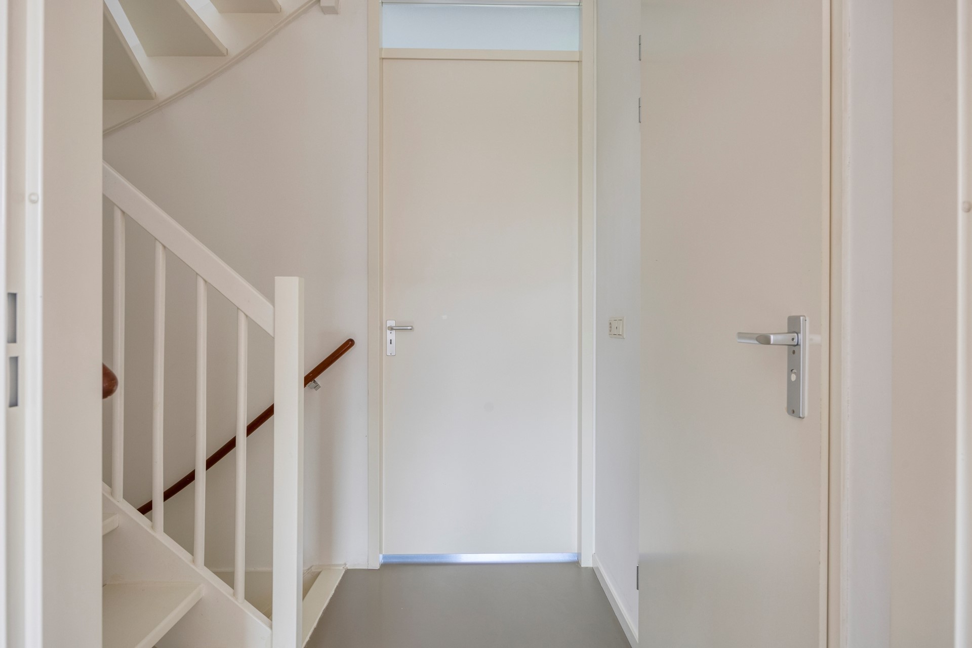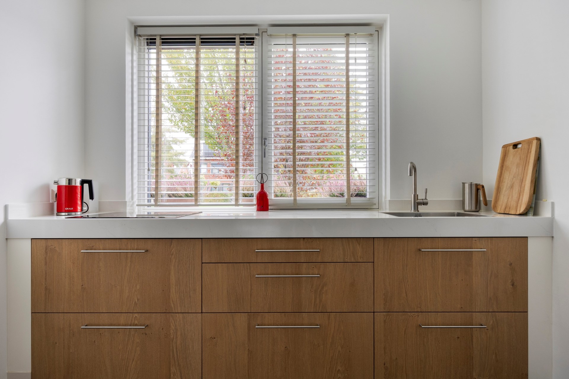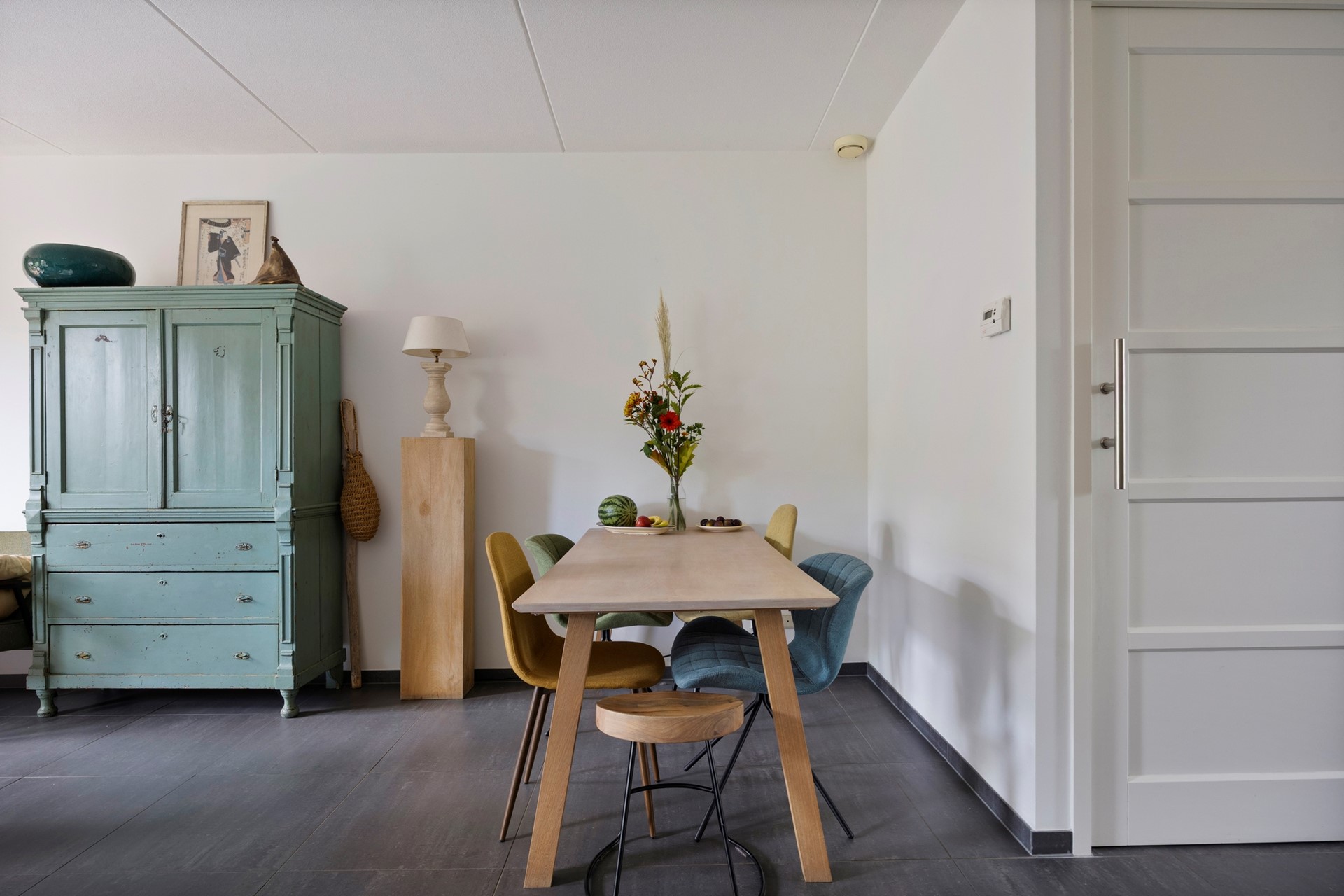 Nette binnenkomst in de hal. Je vindt hier ook het toilet en de deur met glas naar de keuken. Het huis voelt comfortabel en prettig aan en straalt rust uit door de neutrale kleurstelling. De woonkamer is heerlijk licht dankzij de grote ramen en de openslaande tuindeuren naar de achtertuin. Daarnaast is er een aparte loopdeur, wat praktisch is in het dagelijks gebruik. Vanuit de keuken kijk je uit over het plantsoen aan de voorzijde – een groene, rustige aanblik.