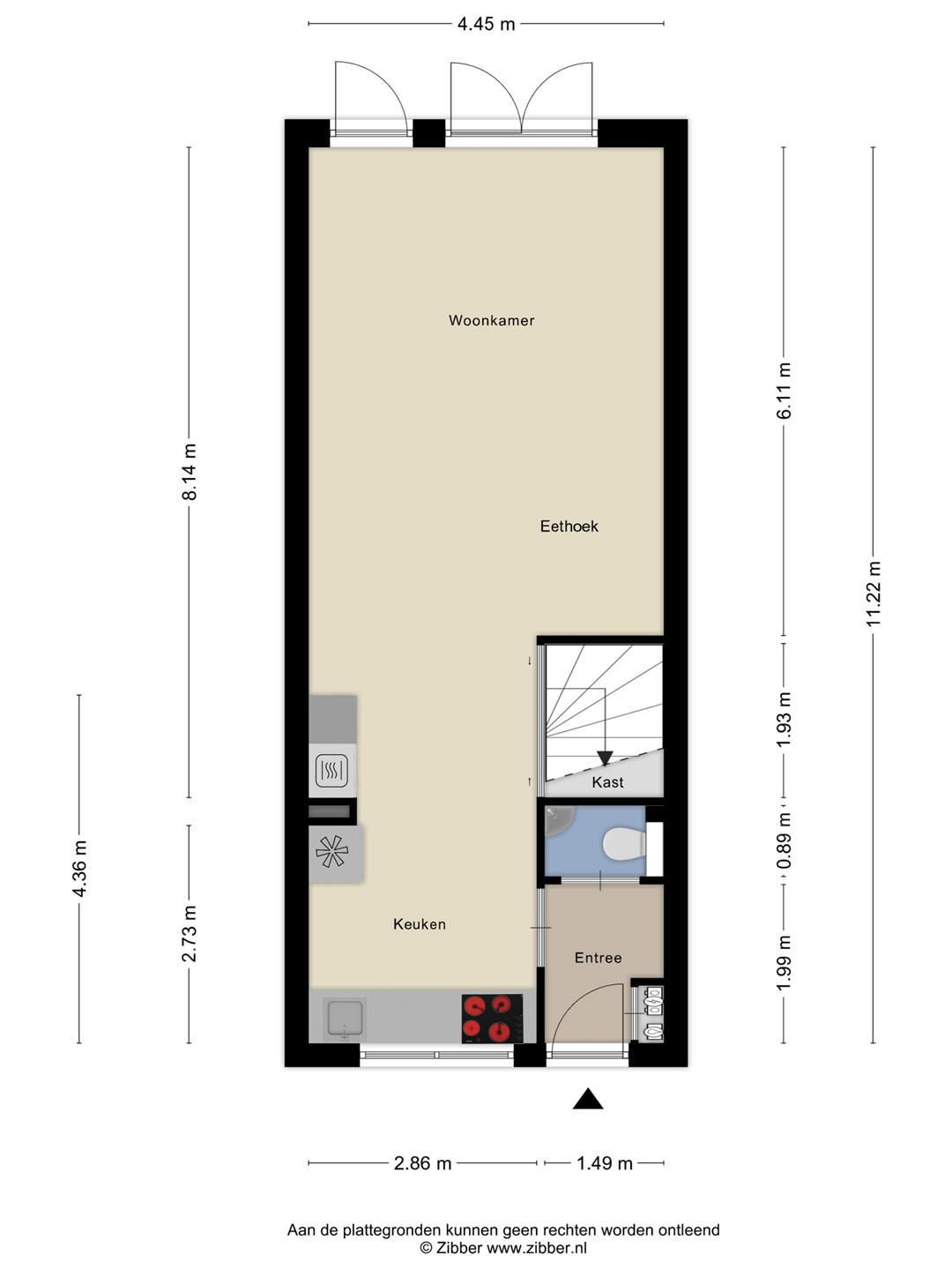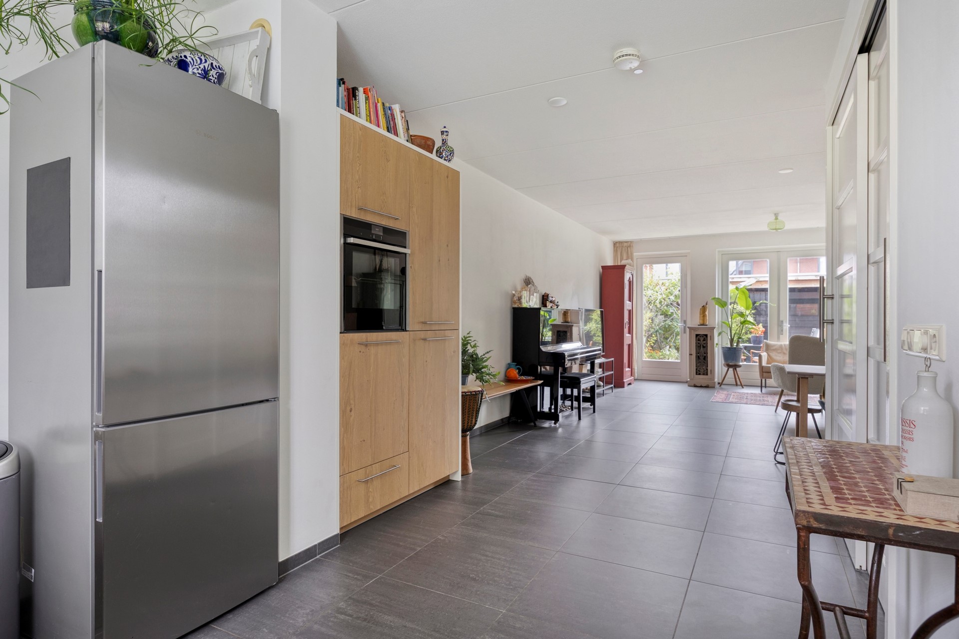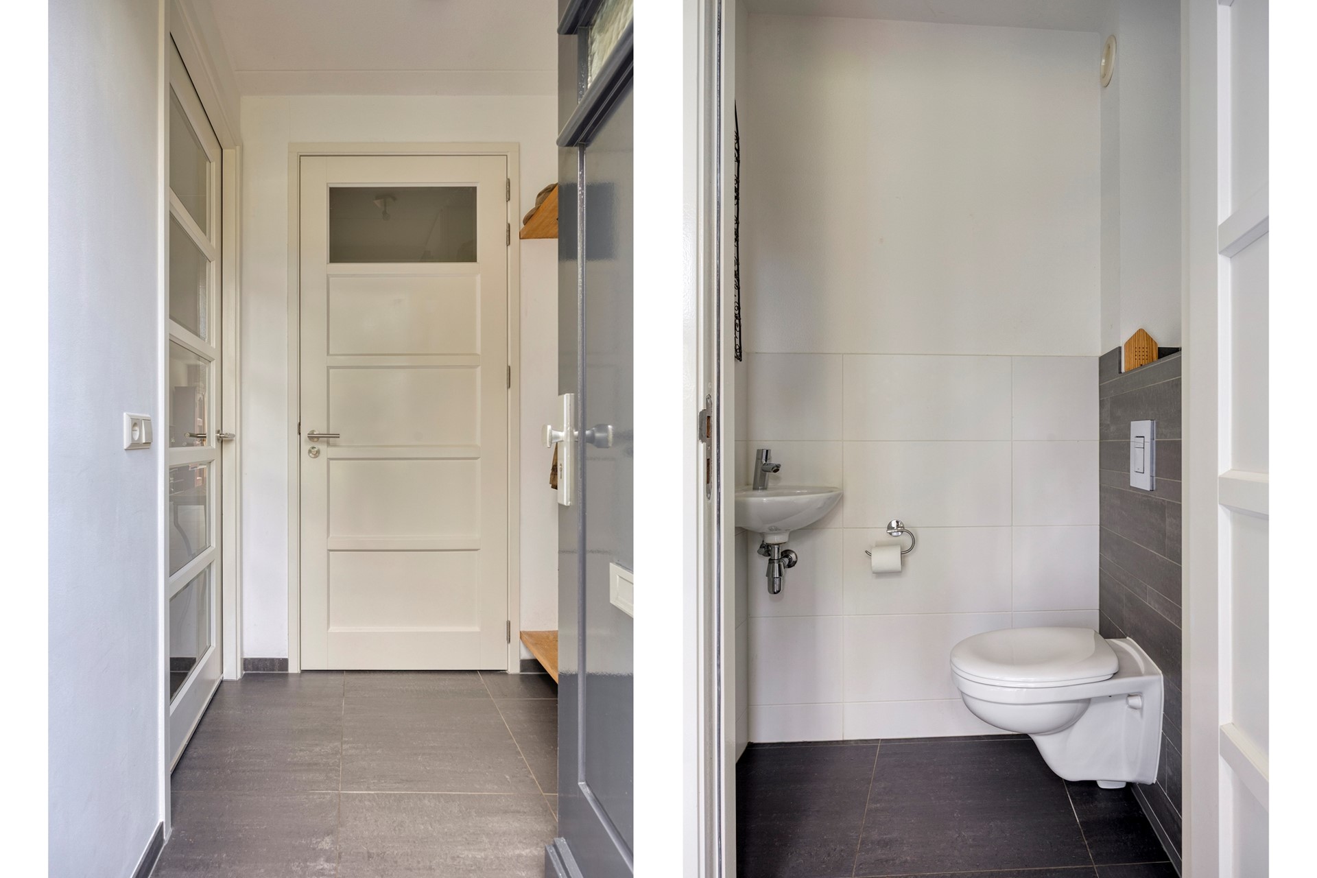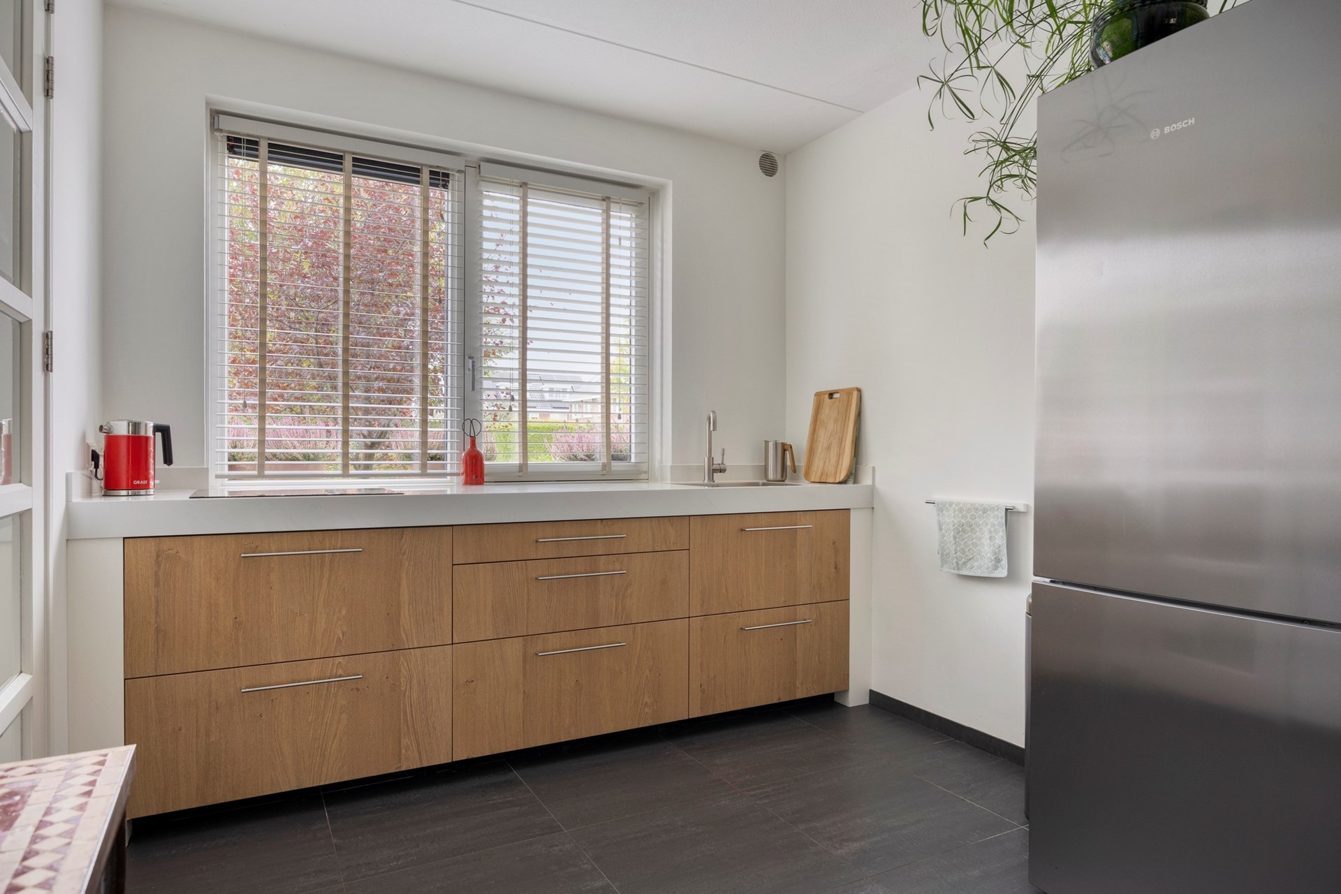 Nette binnenkomst in de hal. Je vindt hier ook het toilet en de deur met glas naar de keuken. Het huis voelt comfortabel en prettig aan en straalt rust uit door de neutrale kleurstelling. De woonkamer is heerlijk licht dankzij de grote ramen en de openslaande tuindeuren naar de achtertuin. Daarnaast is er een aparte loopdeur, wat praktisch is in het dagelijks gebruik. Vanuit de keuken kijk je uit over het plantsoen aan de voorzijde – een groene, rustige aanblik.