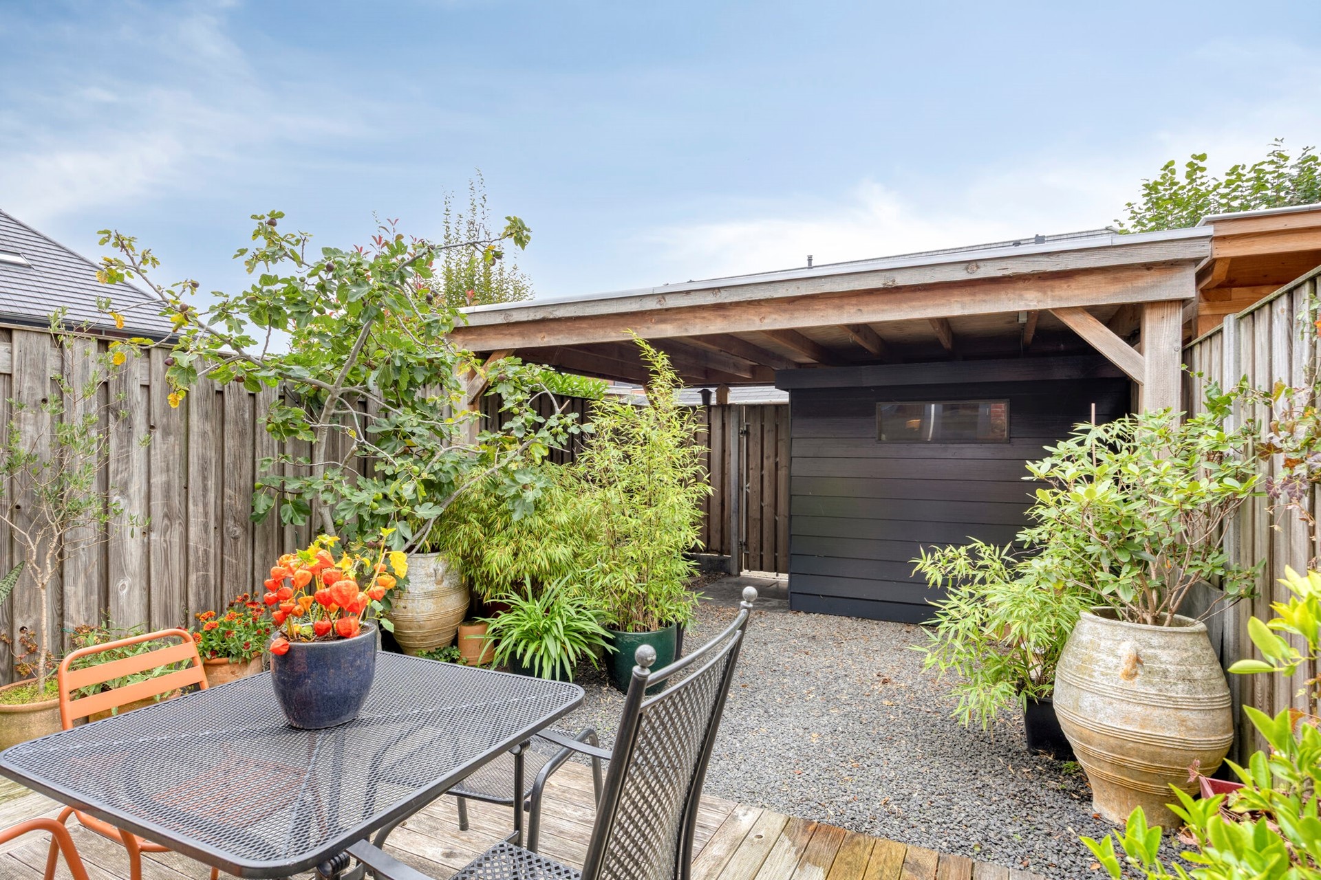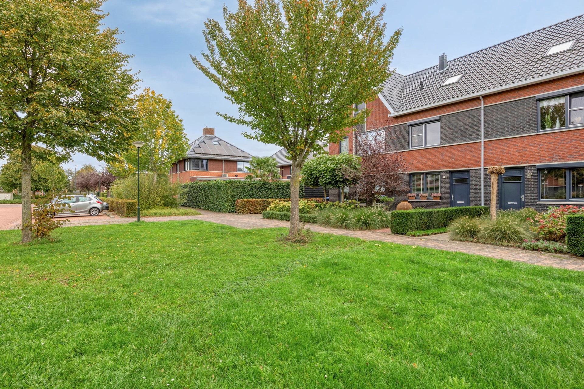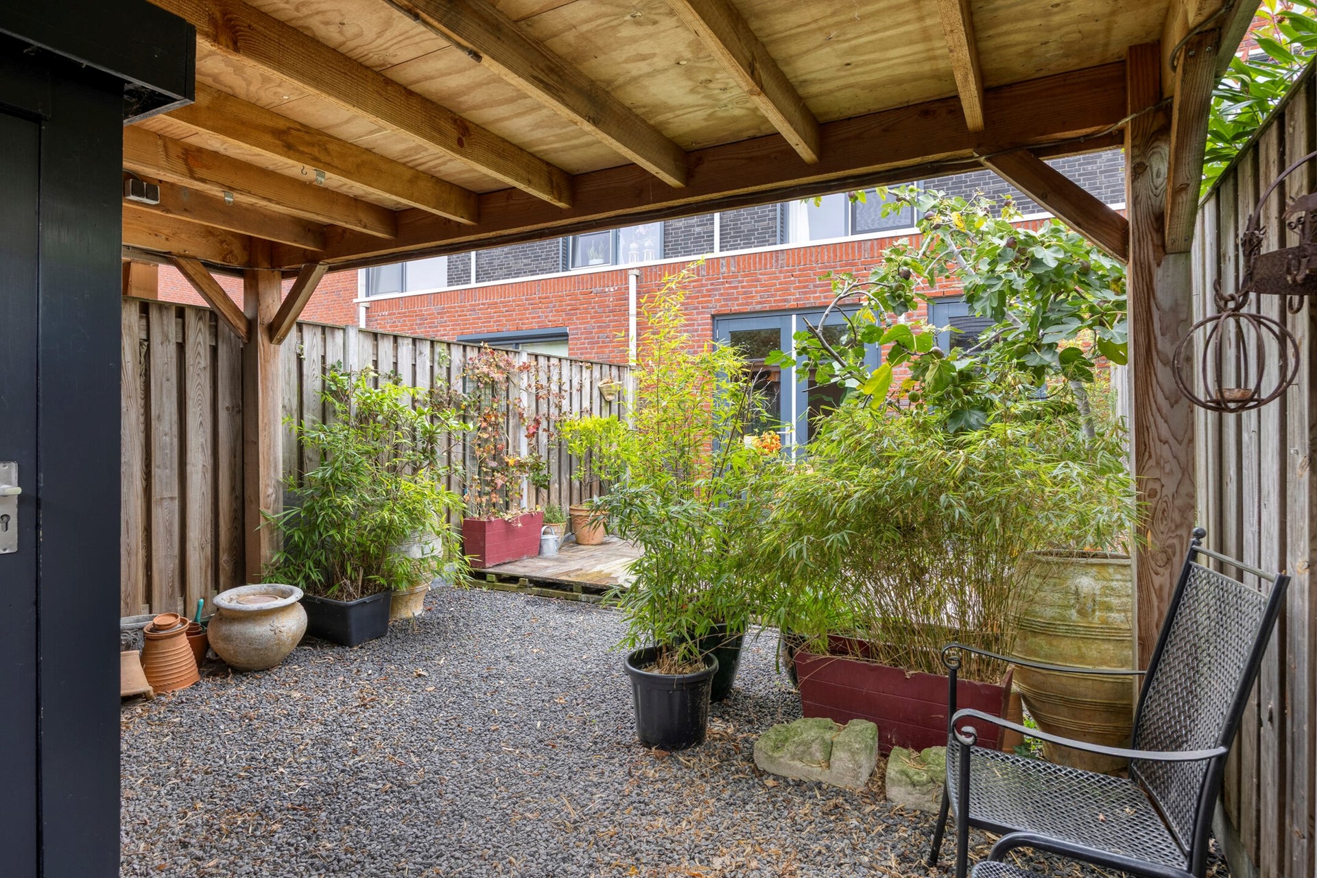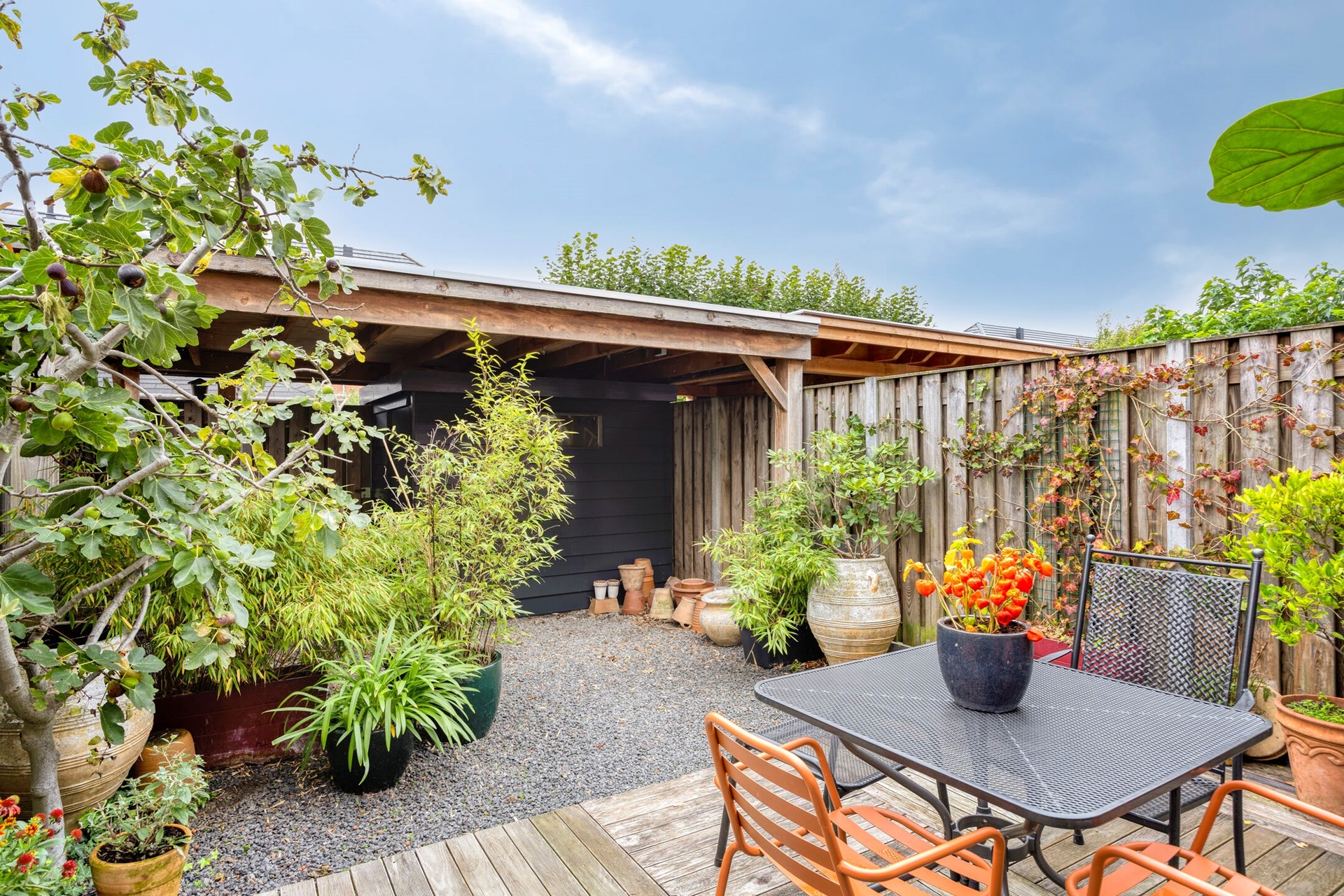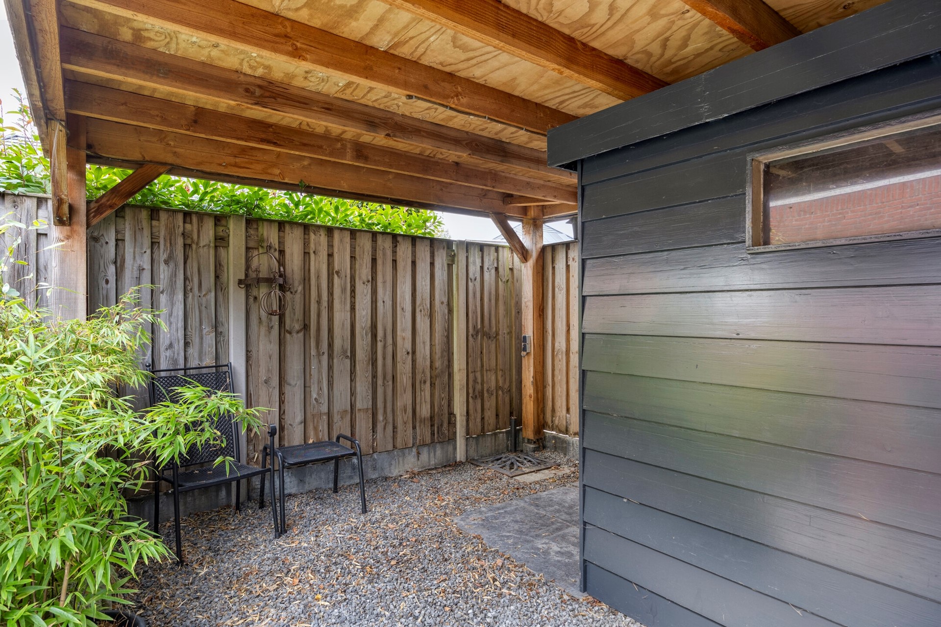 Zowel de voor- als achtertuin zijn onderhoudsvriendelijk aangelegd. Achterin de tuin staat een mooie houten berging met overkapping — een fijne plek om te zitten, met zowel zon als schaduw. De woning ligt aan een plantsoen met veel groen en heeft een openbare parkeerplaats schuin tegenover de deur: genoeg plek, nooit ver lopen.